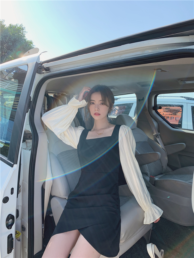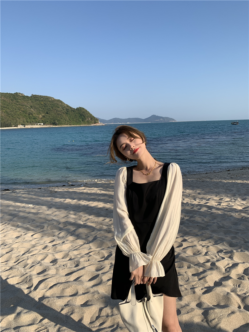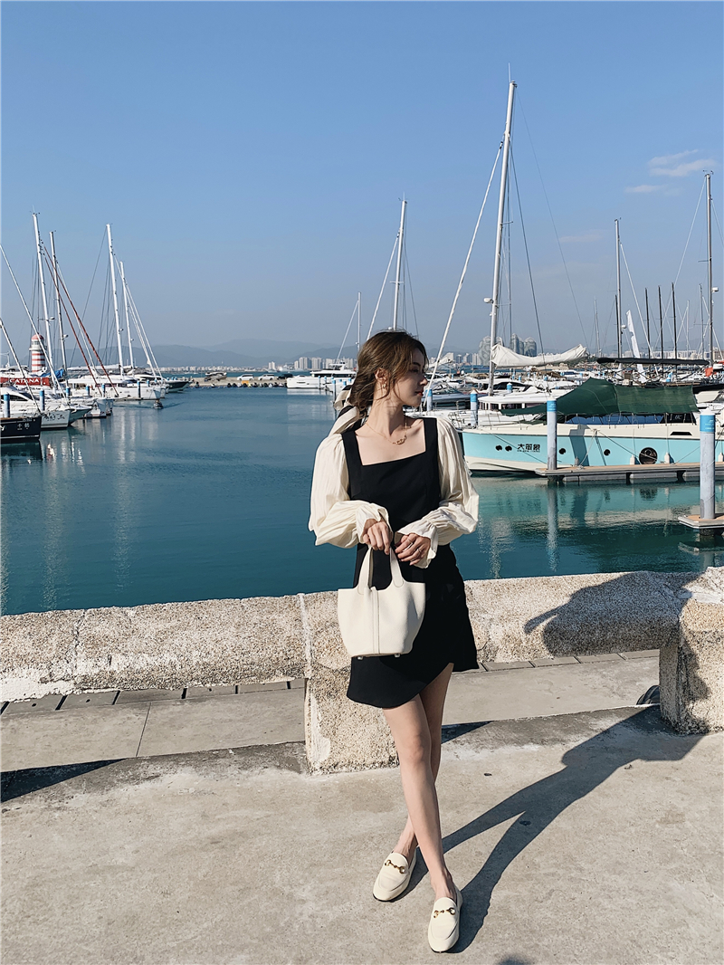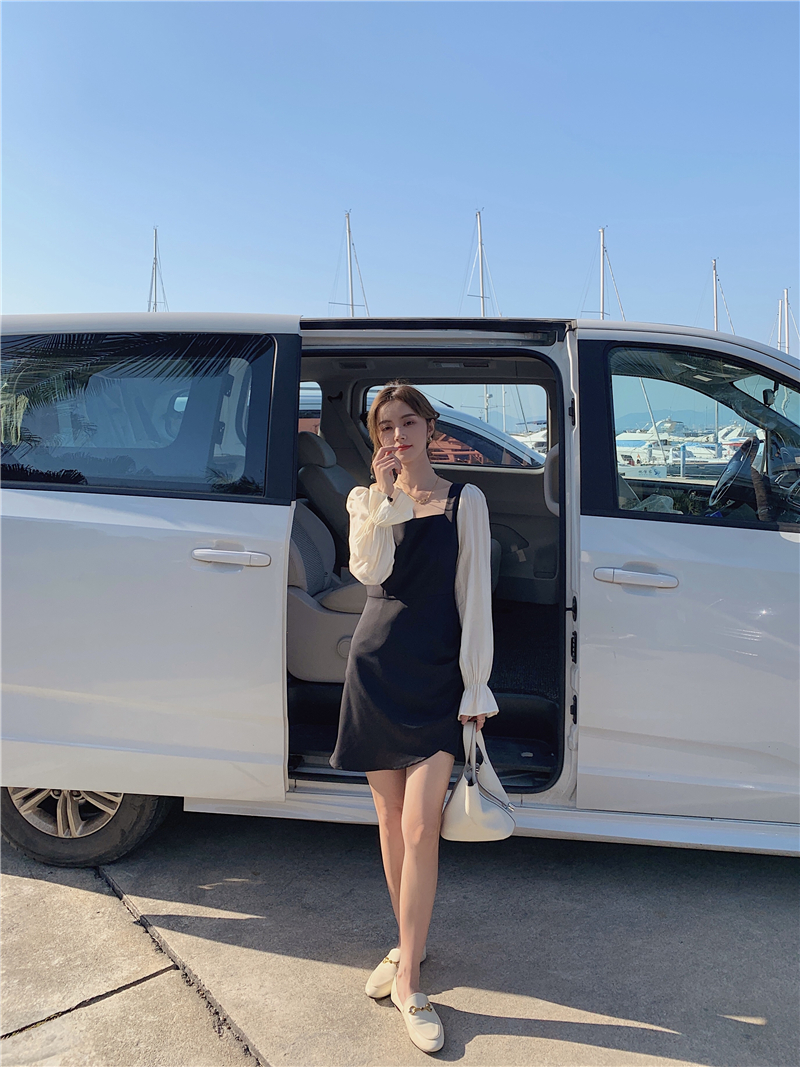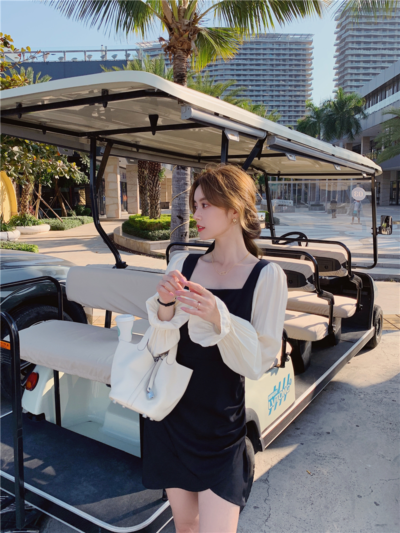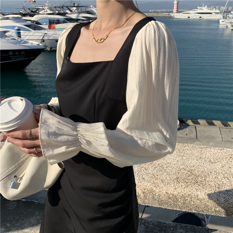 2025 New Spring and Summer Black Slim Dress Spliced Sleeve Short Small Skirt