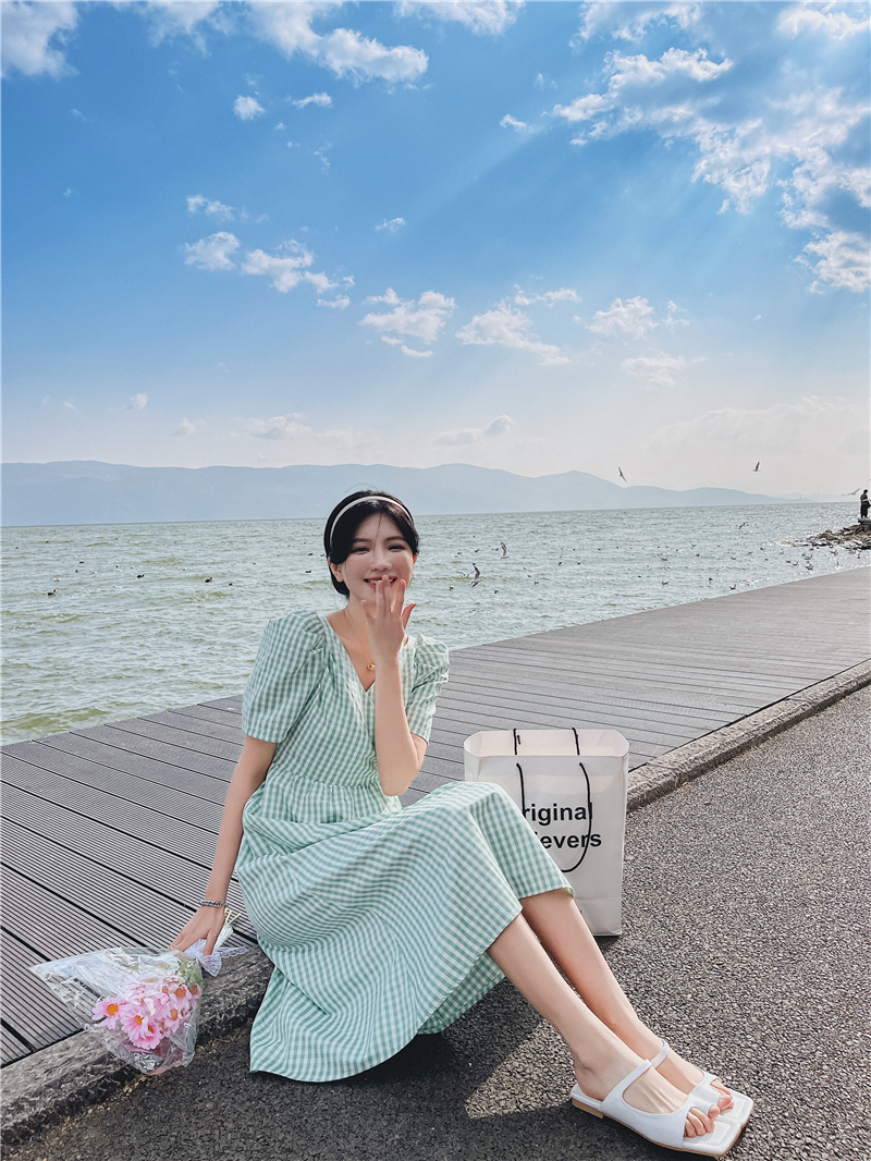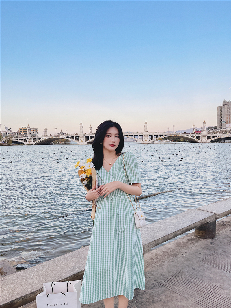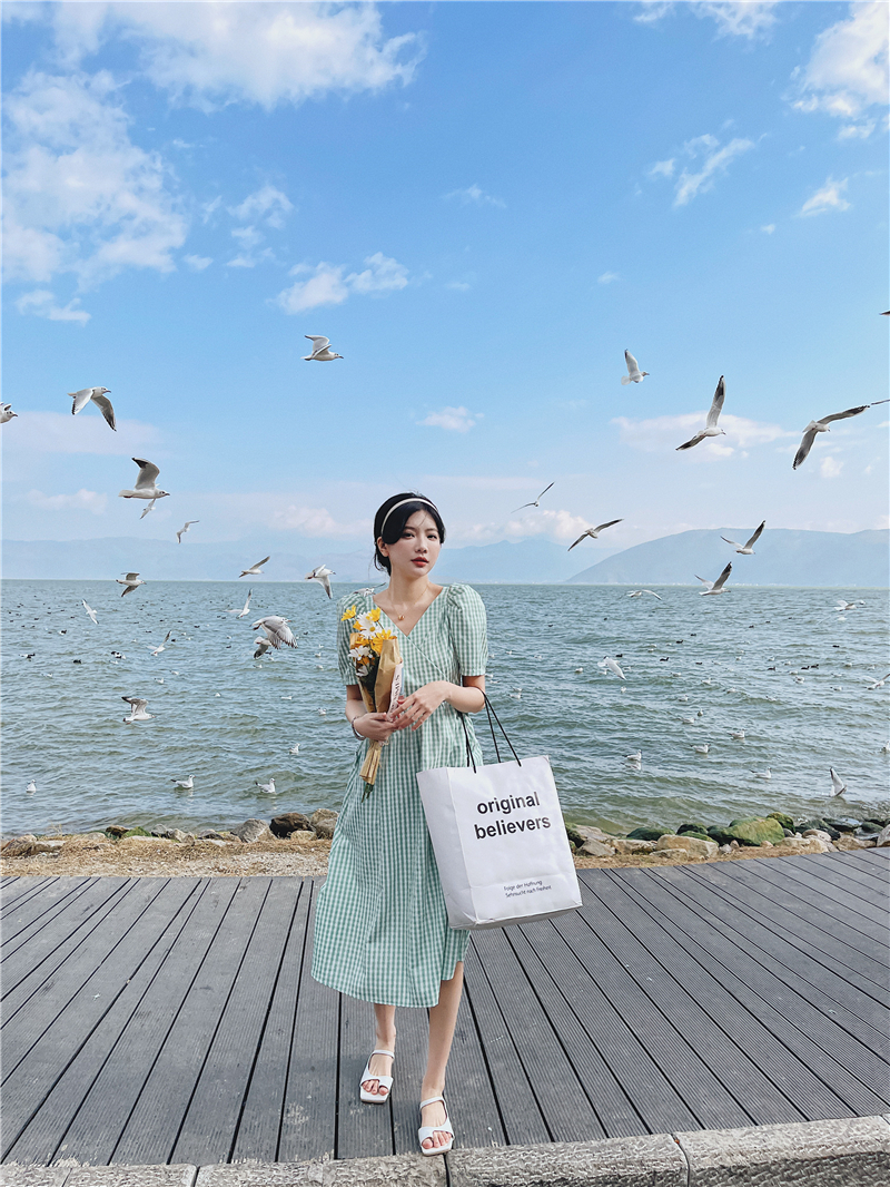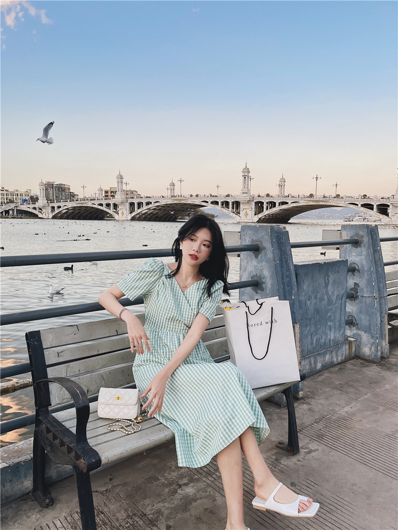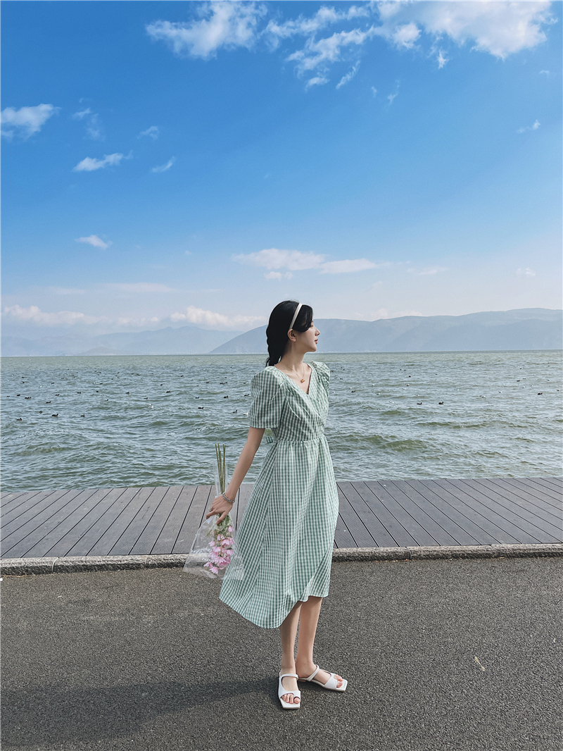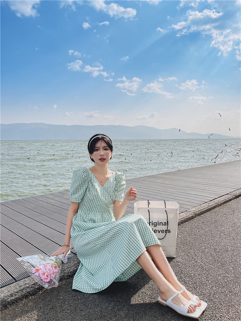 2021 Summer Small Fresh Plaid Skirt White Green Retro Puff Sleeve V-Neck Belt Skirt