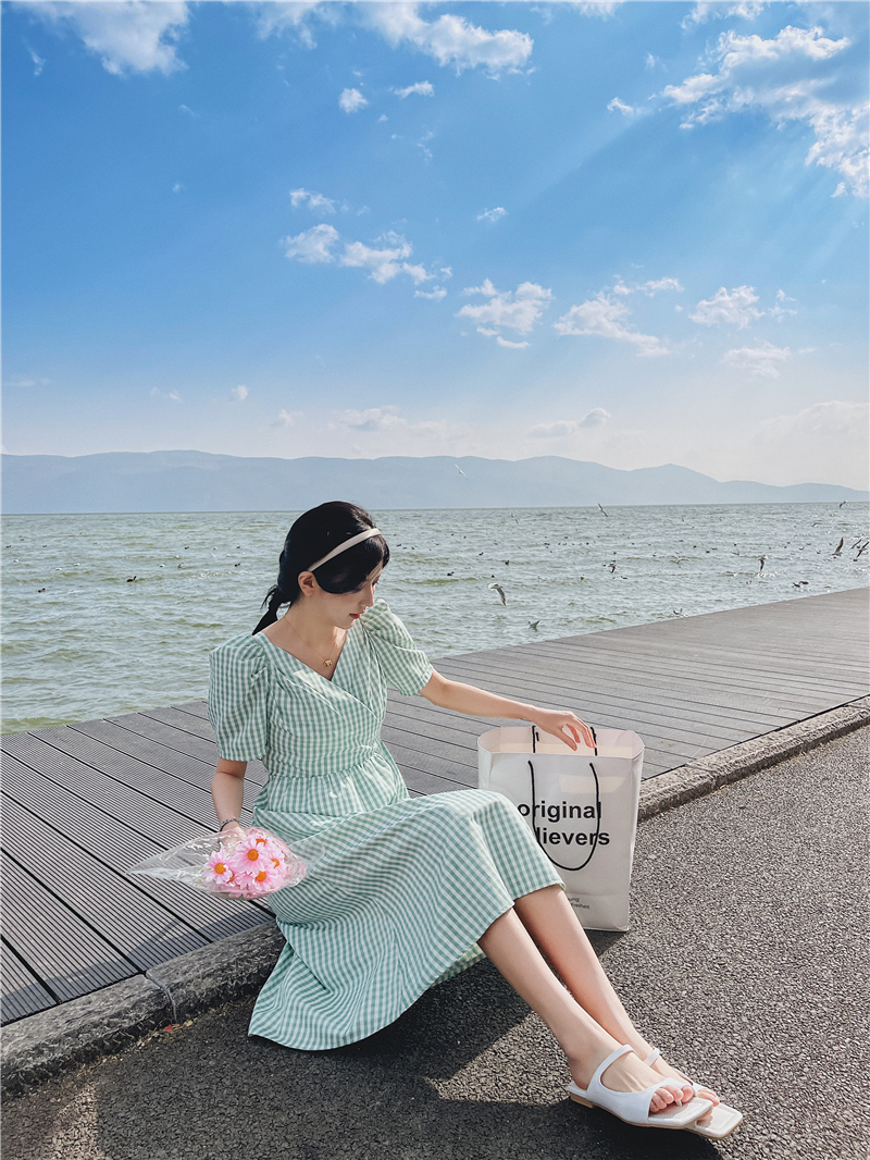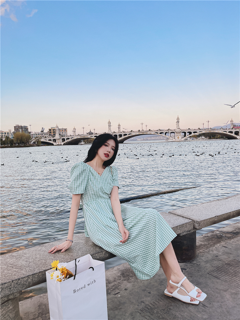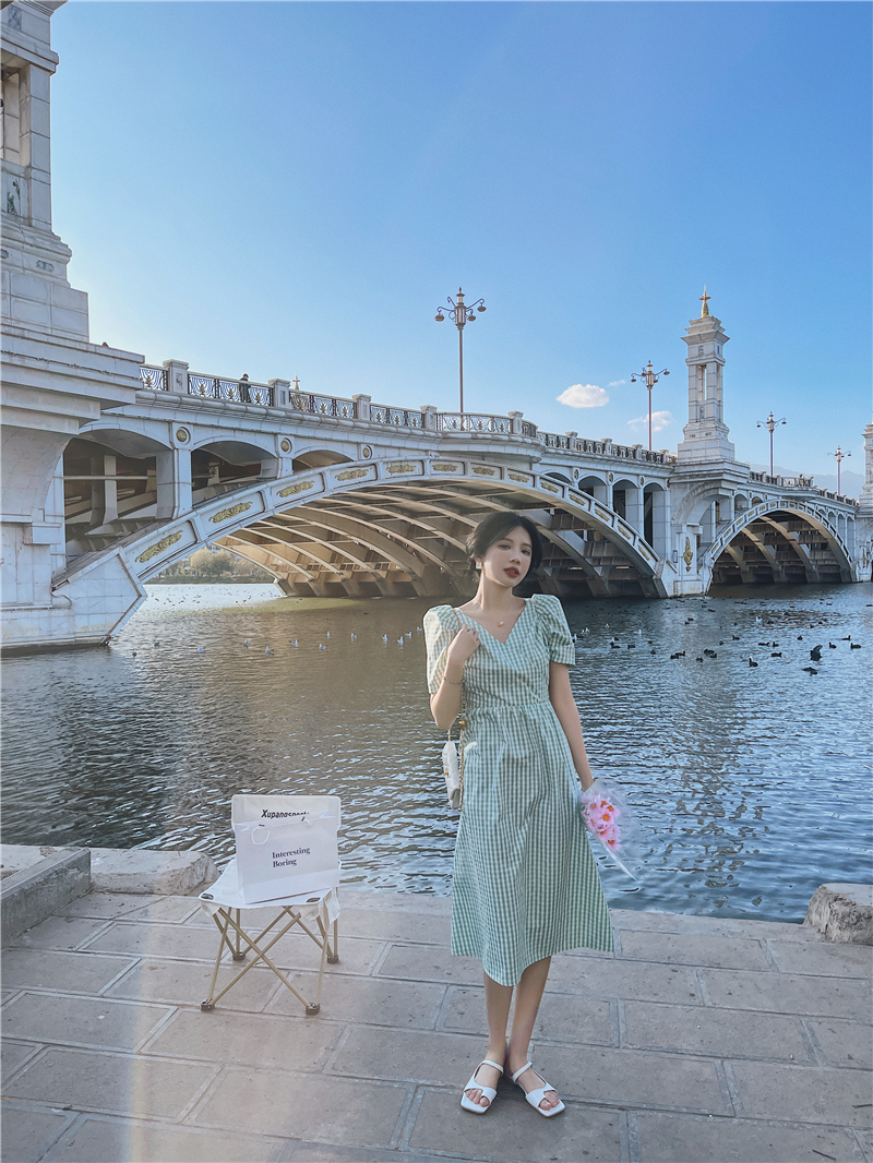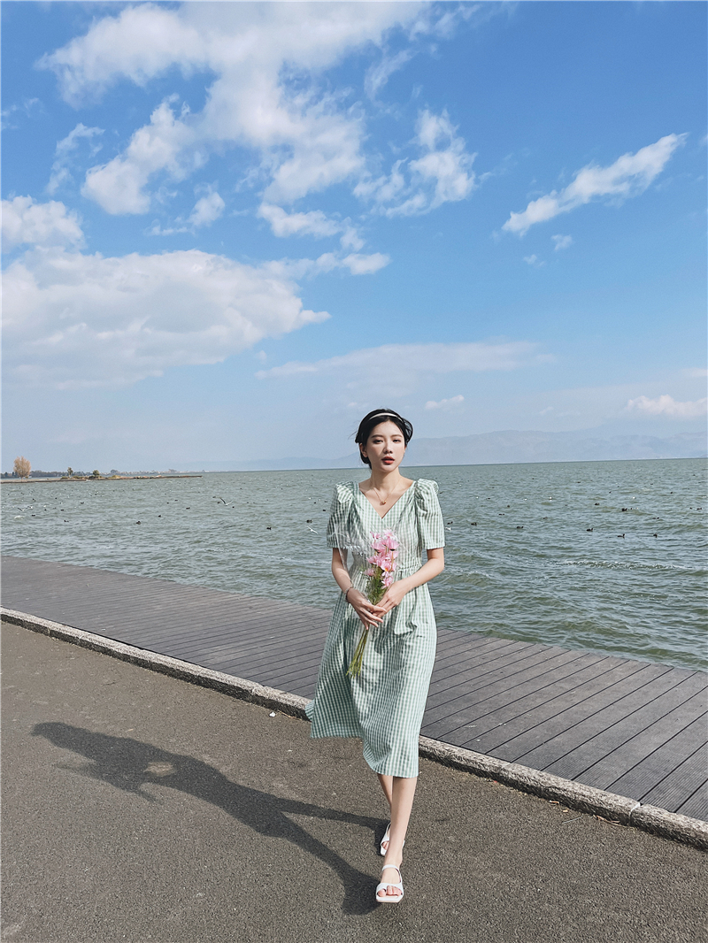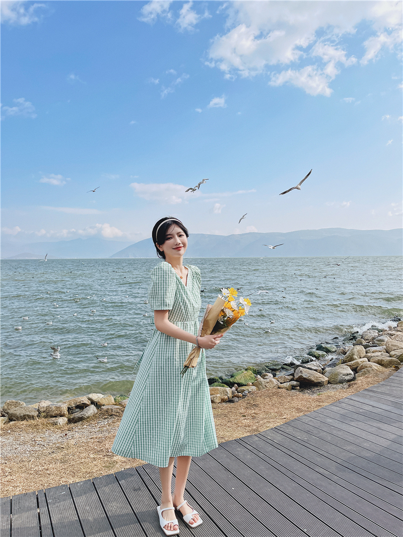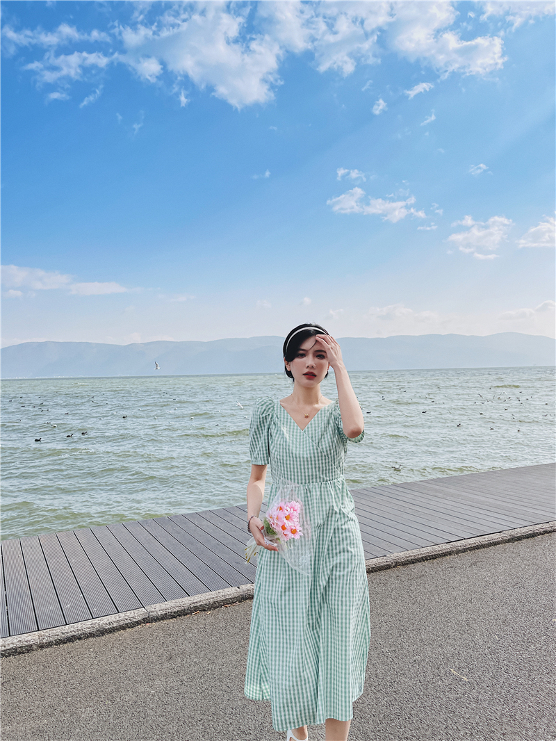 2021 Summer Small Fresh Plaid Skirt White Green Retro Puff Sleeve V-Neck Belt Skirt