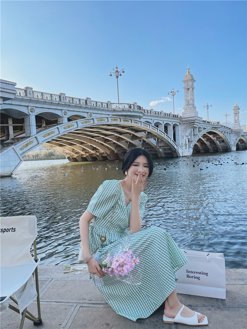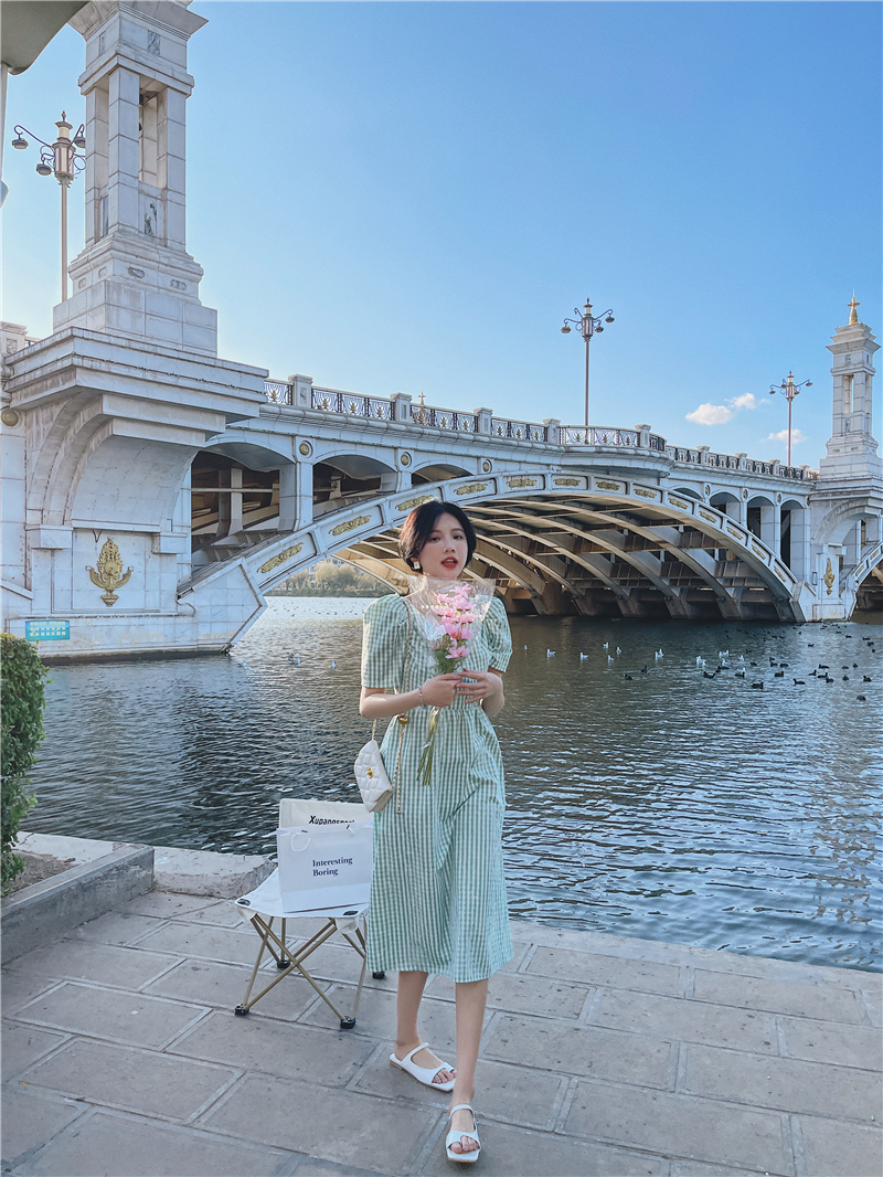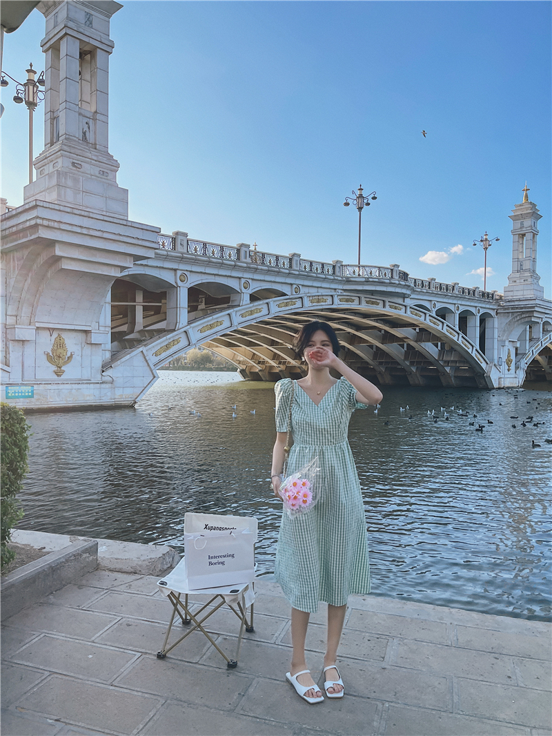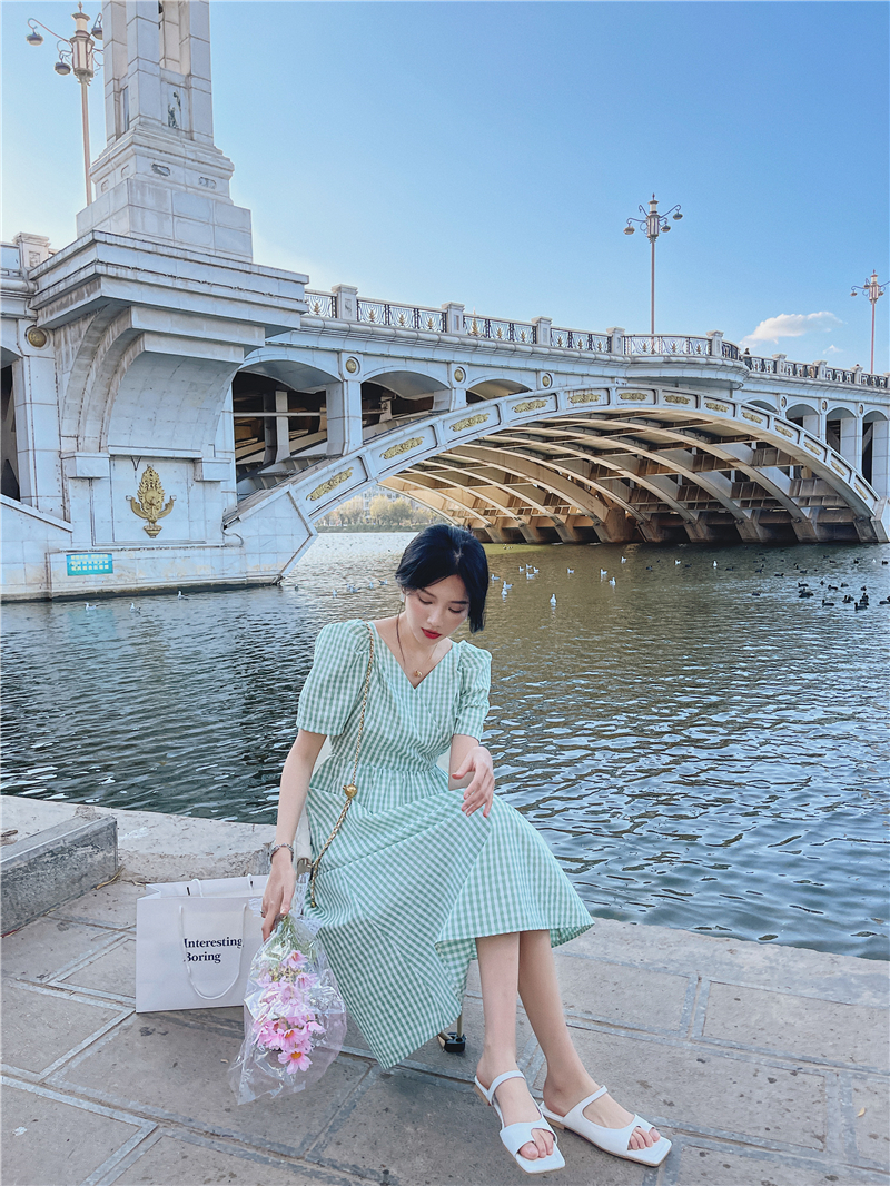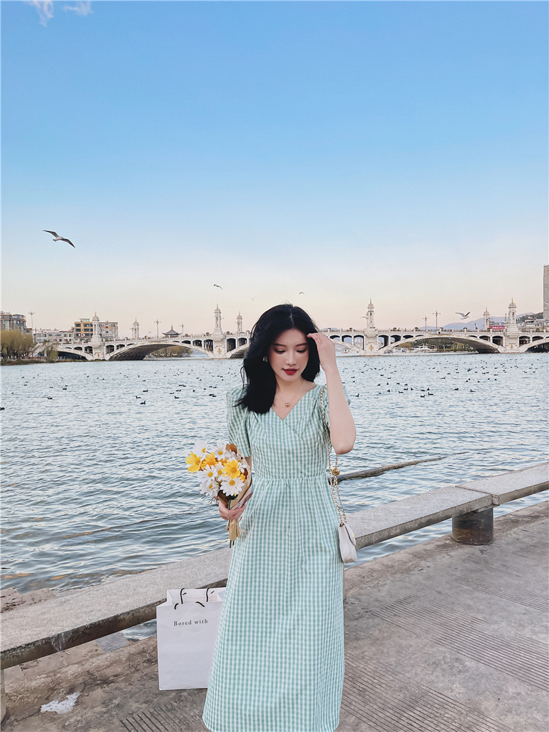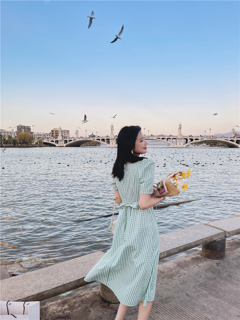 2021 Summer Small Fresh Plaid Skirt White Green Retro Puff Sleeve V-Neck Belt Skirt