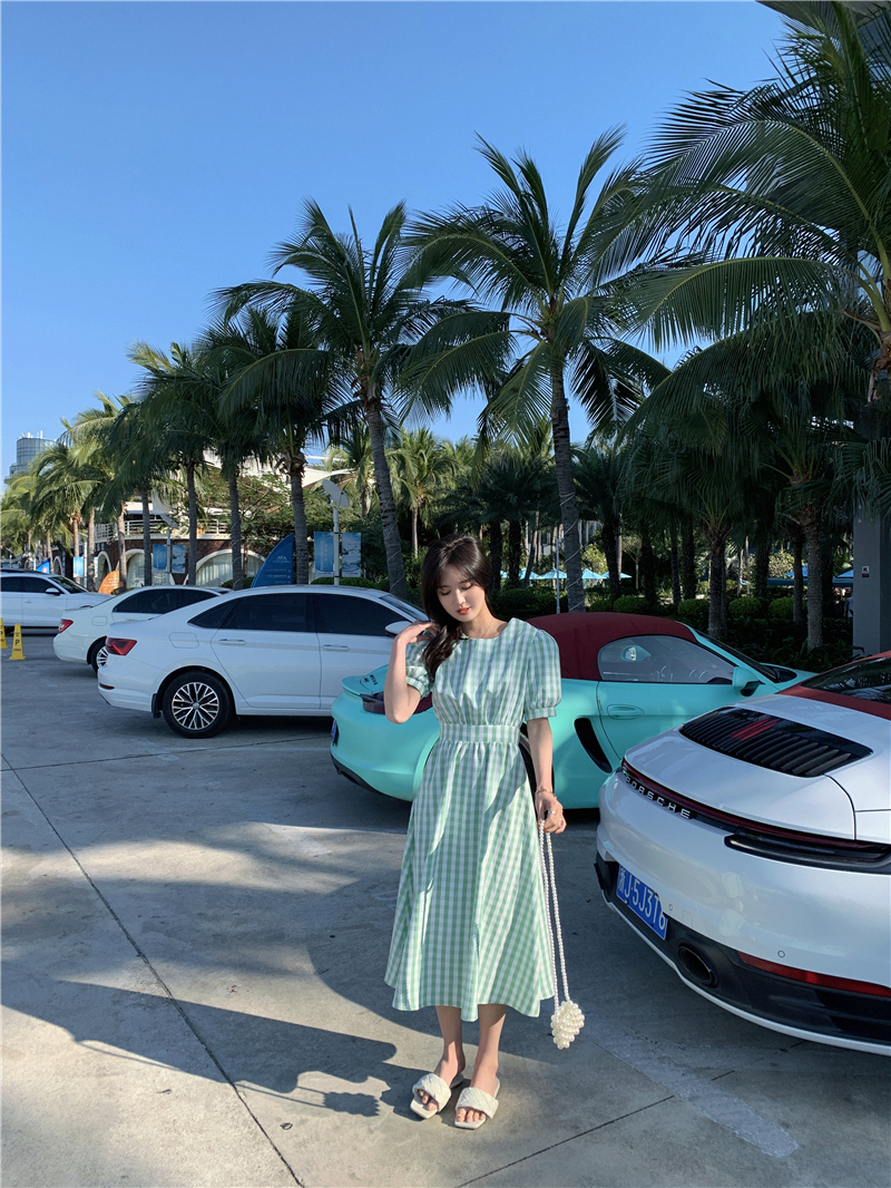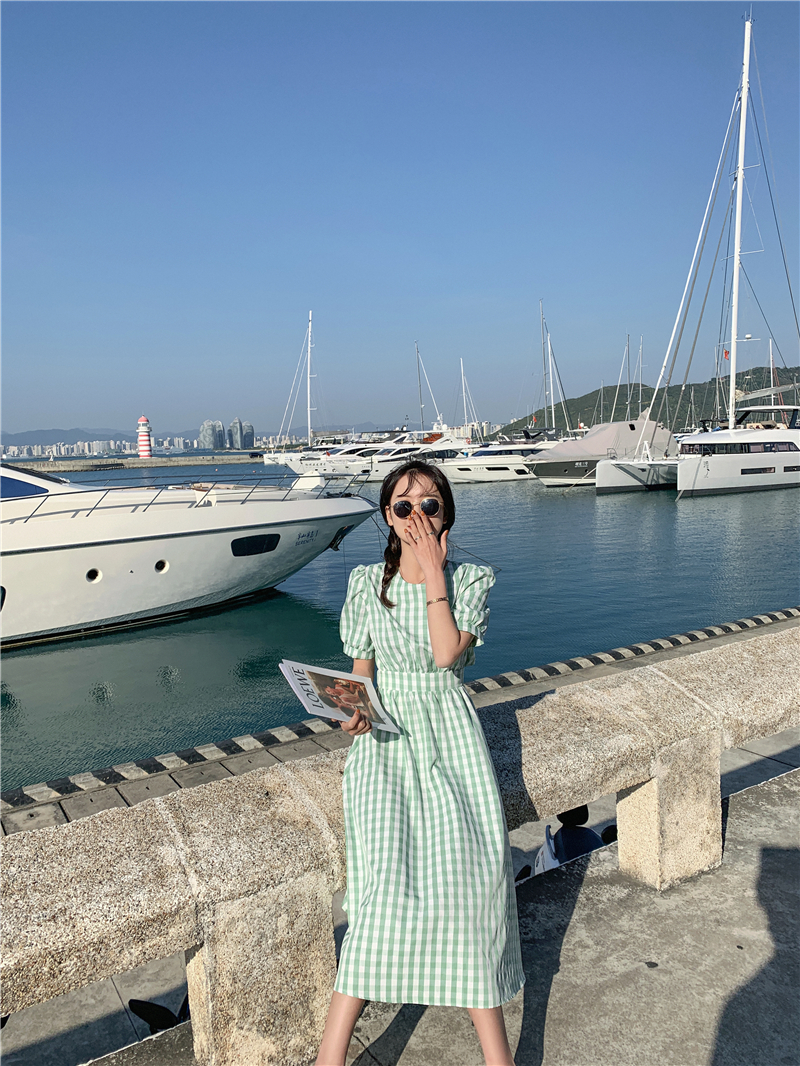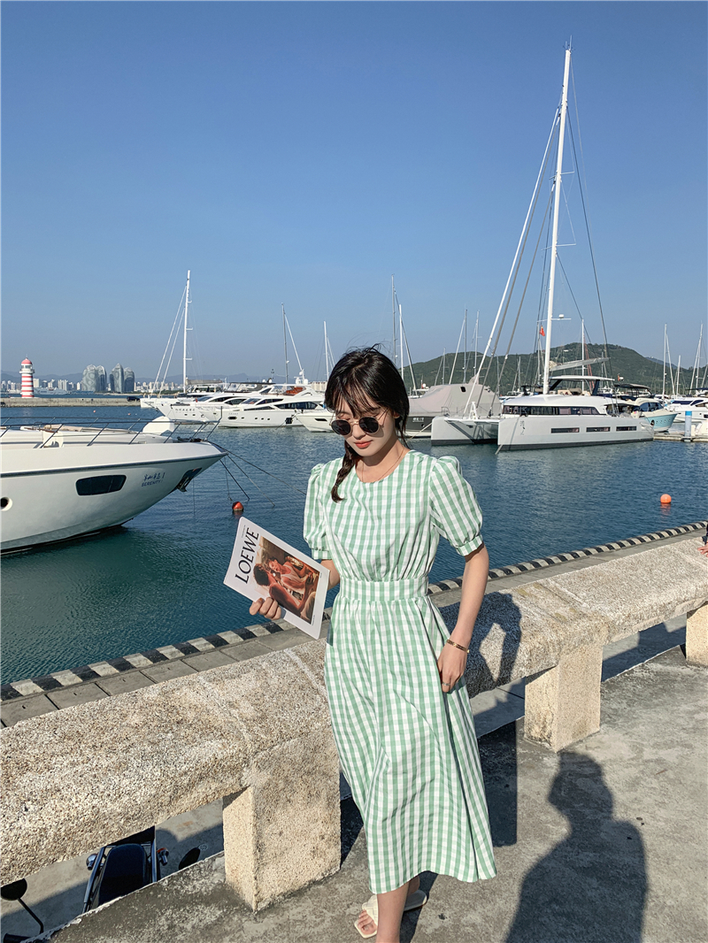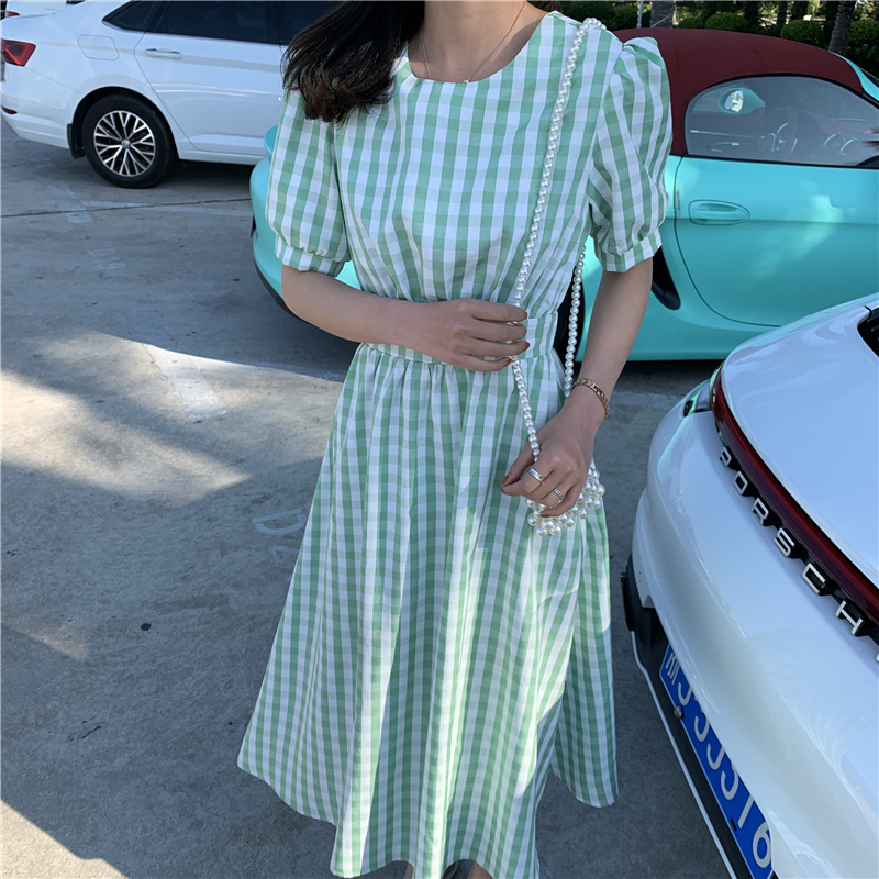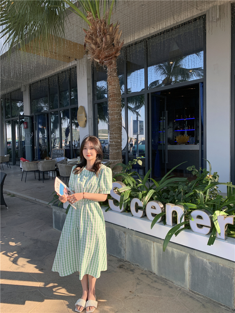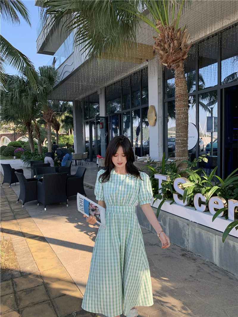 2021 New Summer Korean Simple Dress Whitening Green Plaid Puff Sleeve Loose Age-Reducing Dress