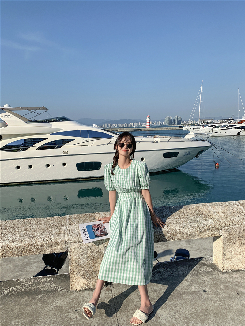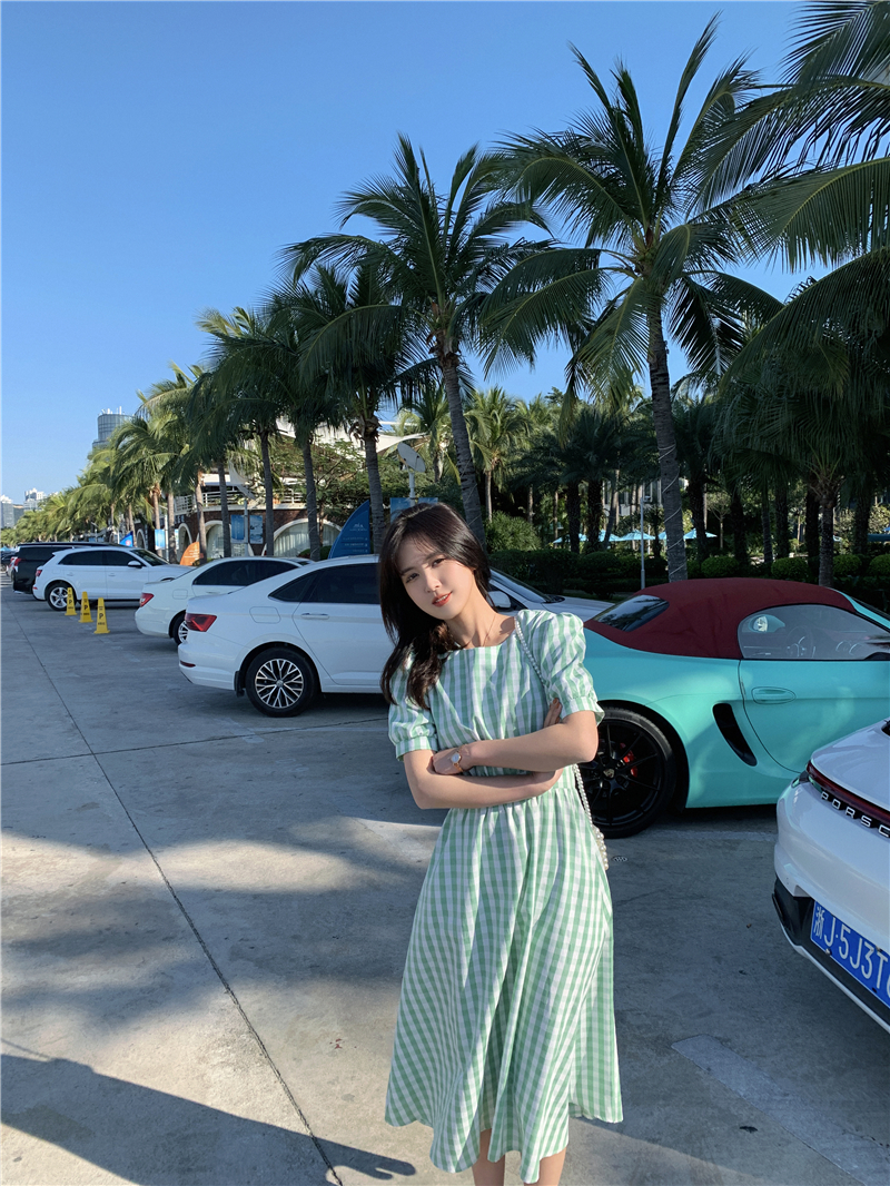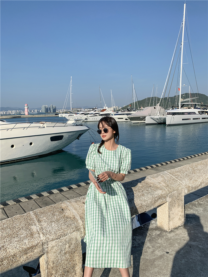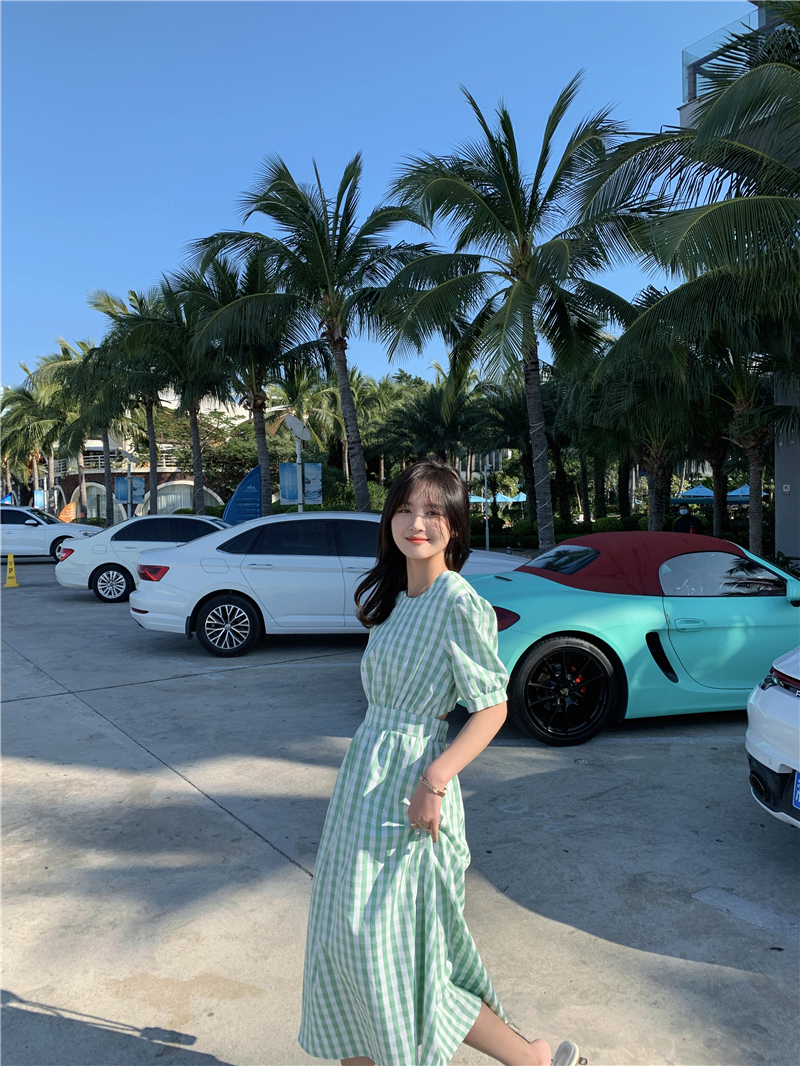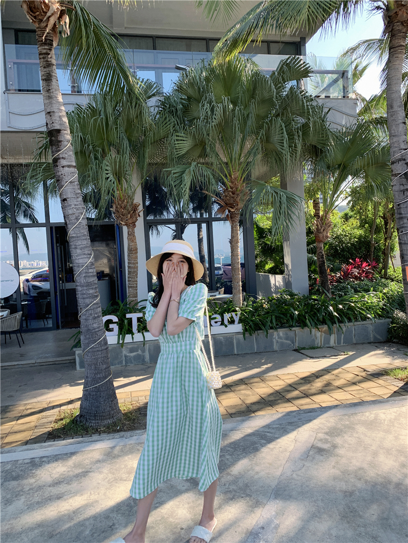 2021 New Summer Korean Simple Dress Whitening Green Plaid Puff Sleeve Loose Age-Reducing Dress