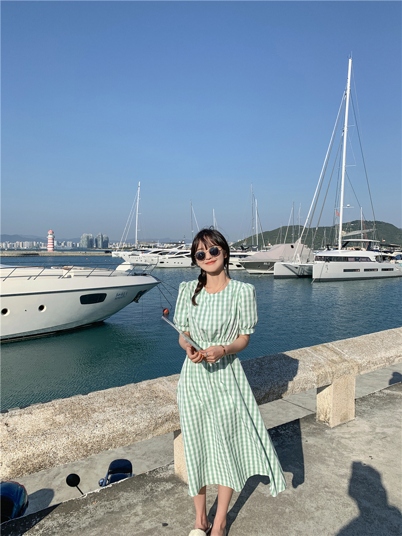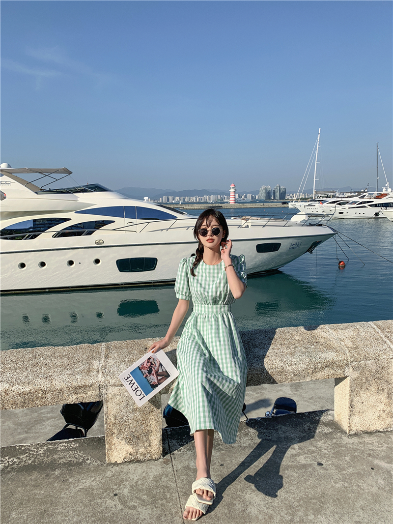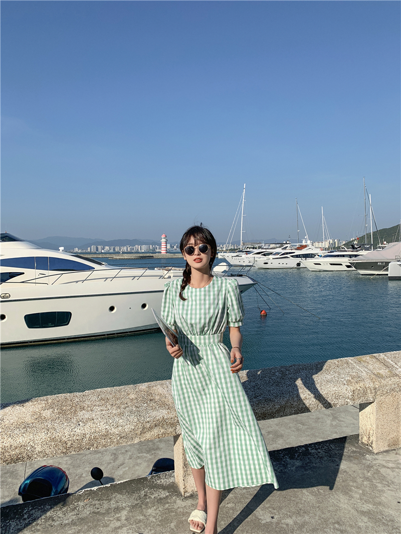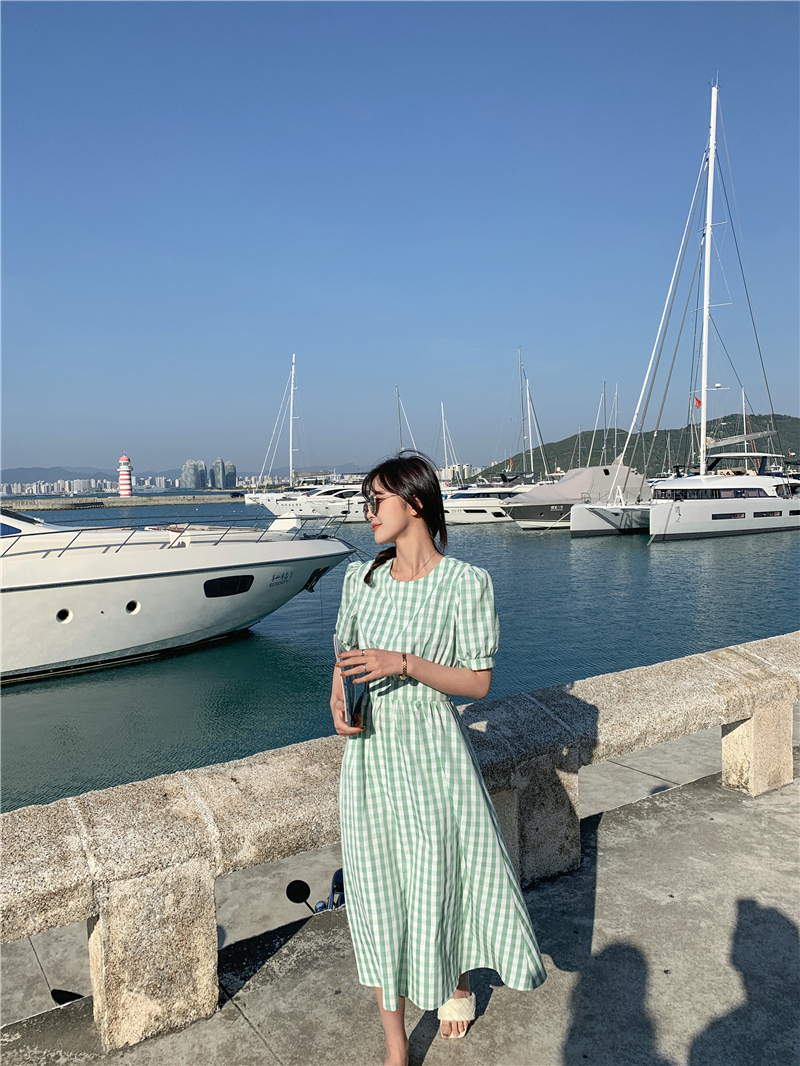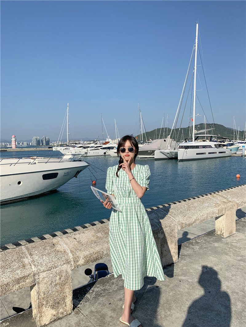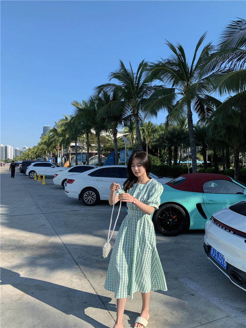 2021 New Summer Korean Simple Dress Whitening Green Plaid Puff Sleeve Loose Age-Reducing Dress