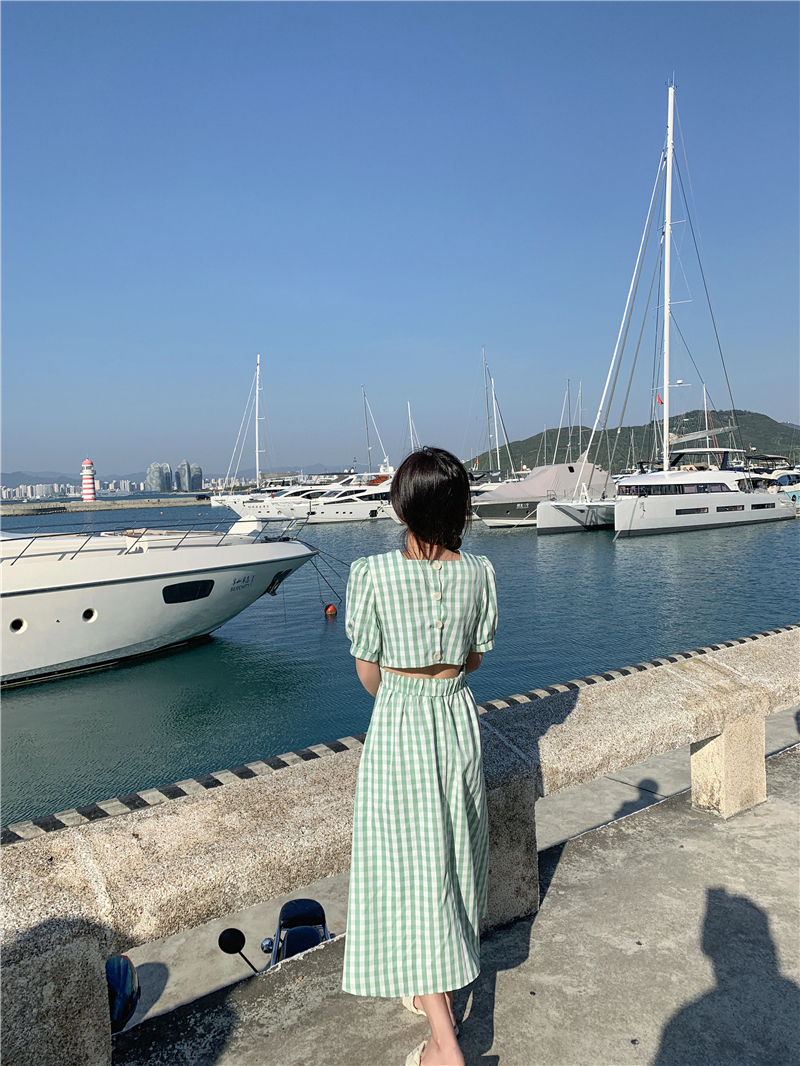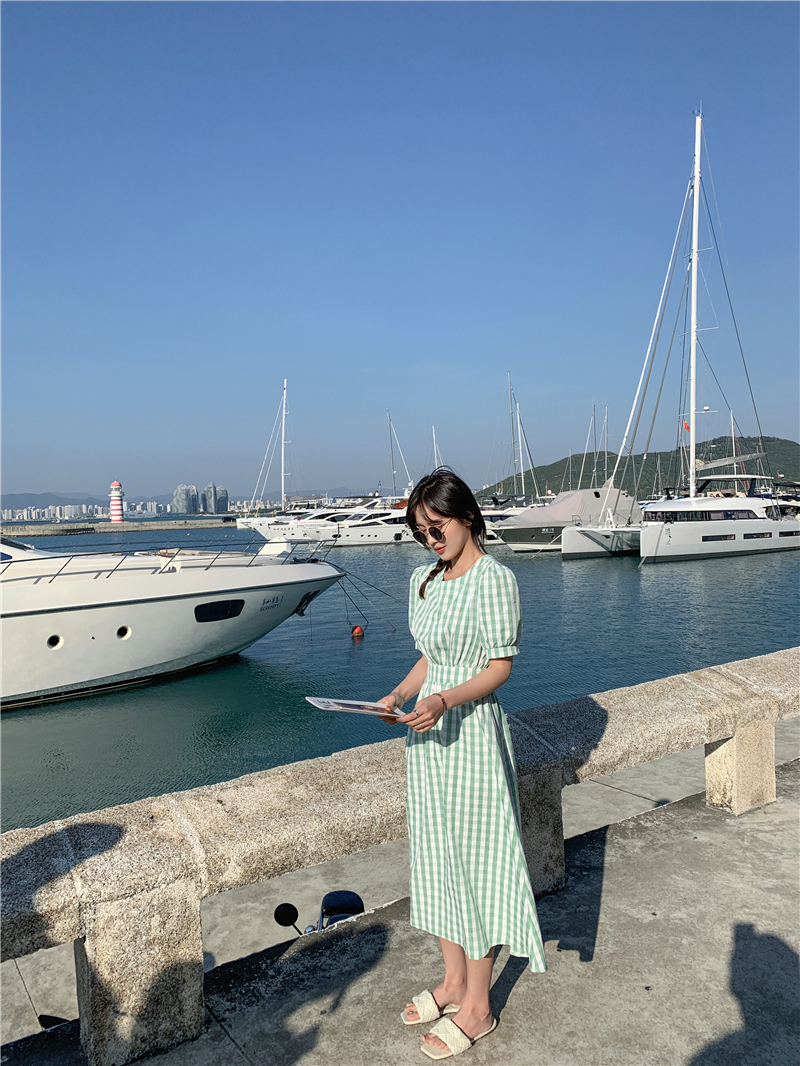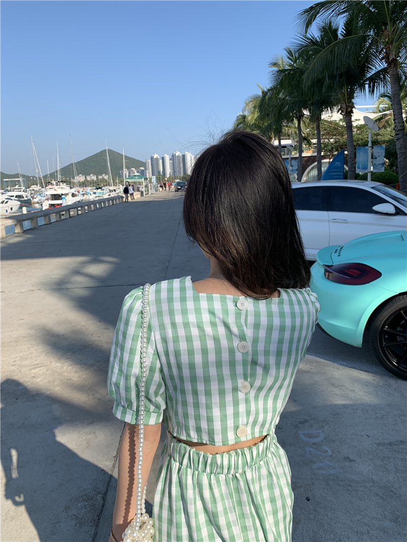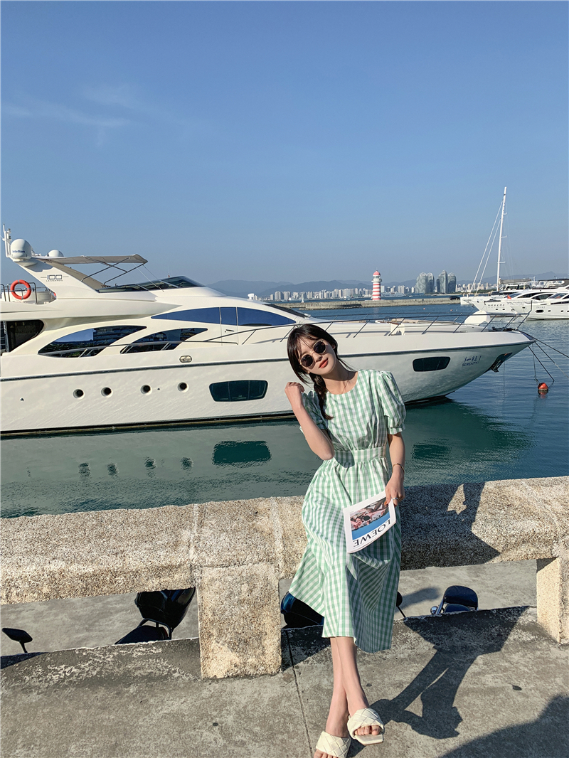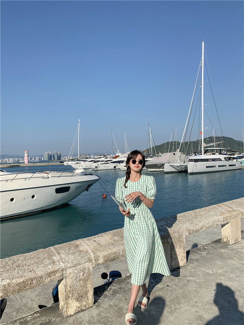 2021 New Summer Korean Simple Dress Whitening Green Plaid Puff Sleeve Loose Age-Reducing Dress