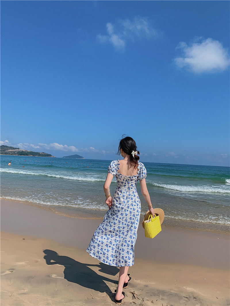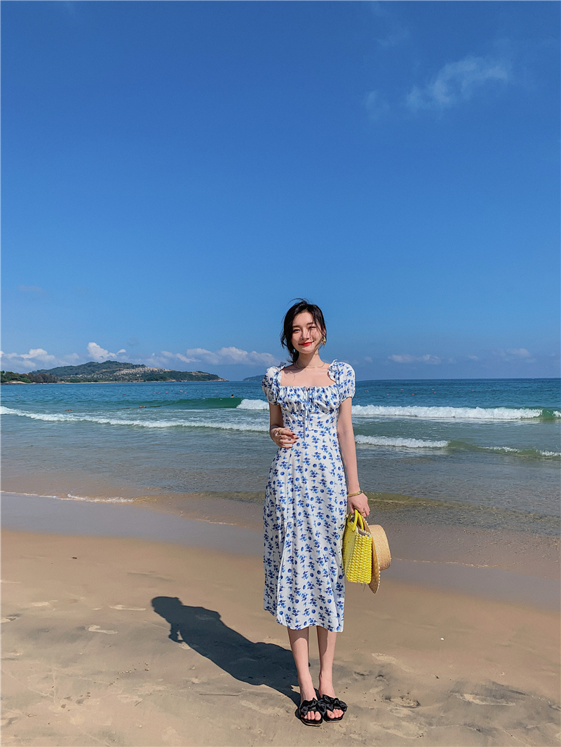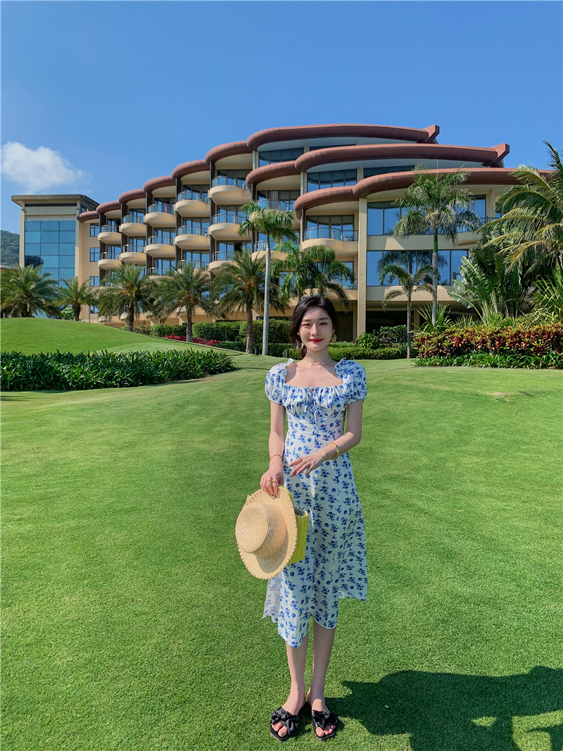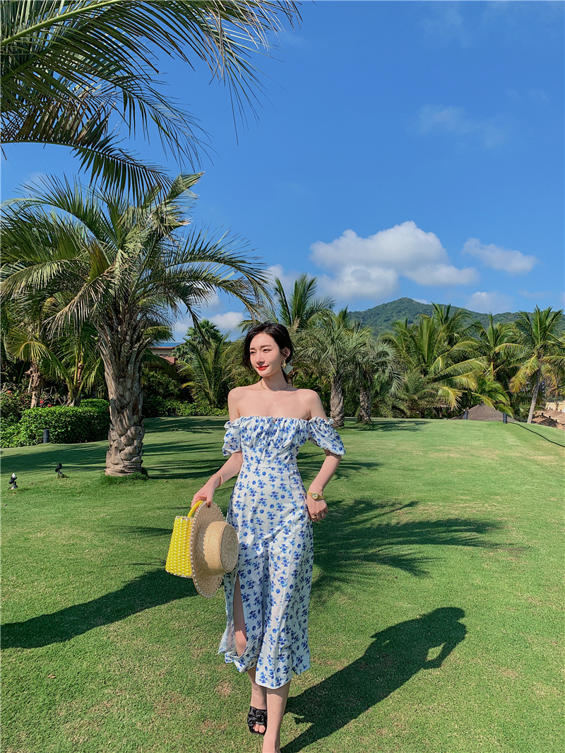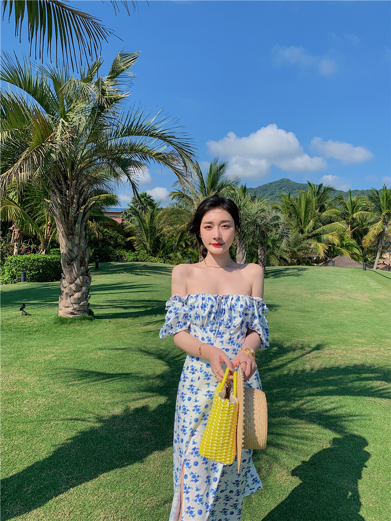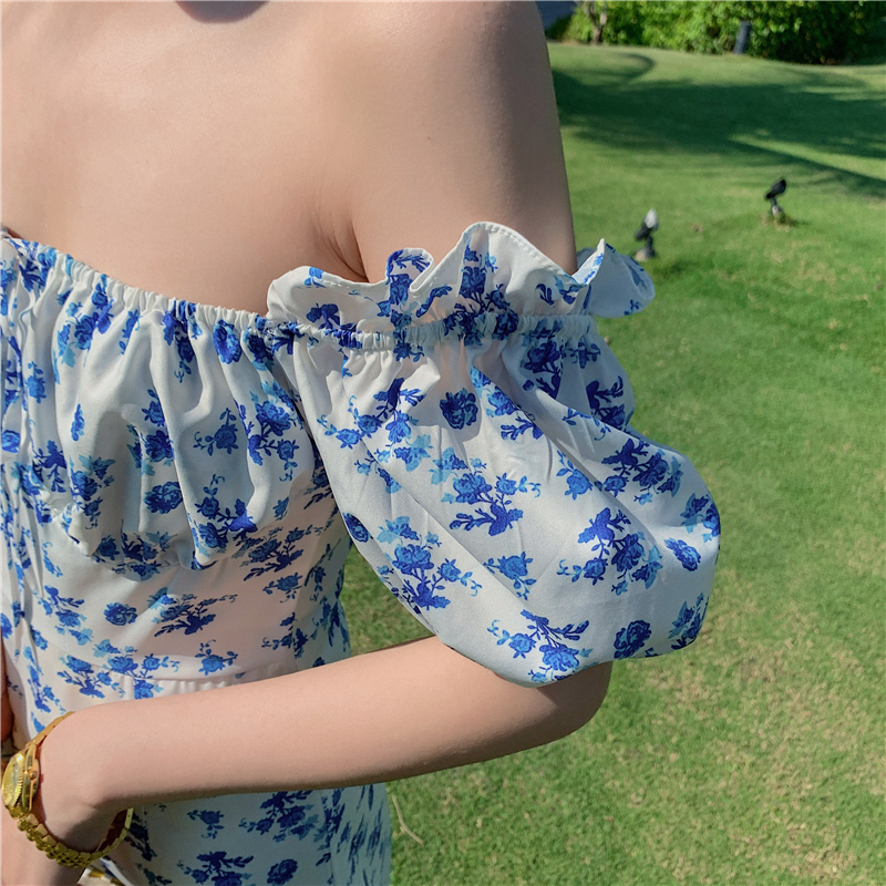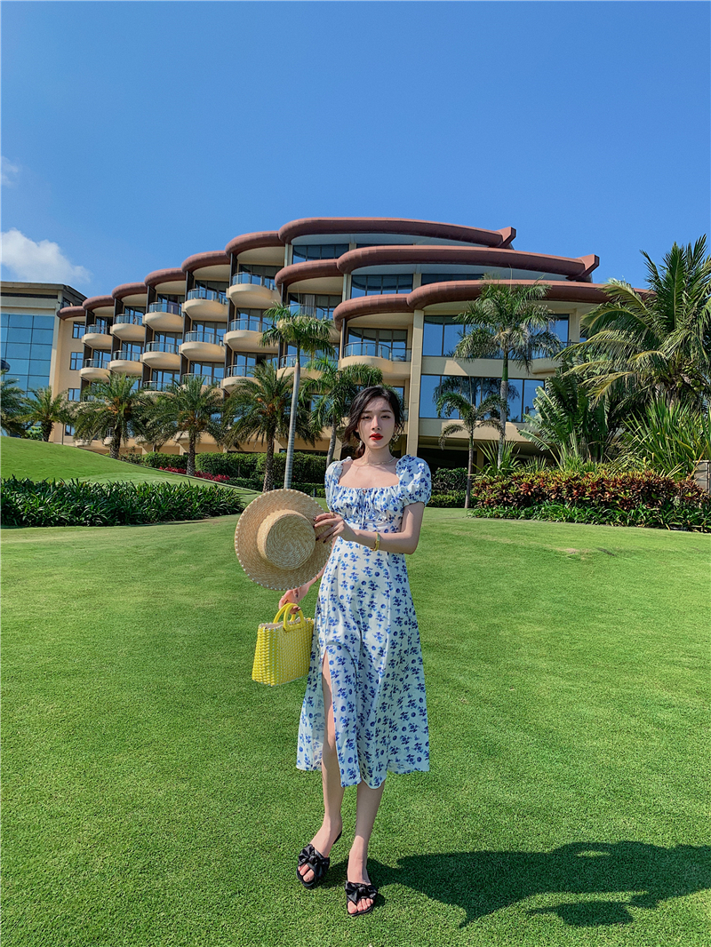 2021 real shot French retro style square neck floral short-sleeved long skirt slit sexy dress one-shoulder off-shoulder skirt
