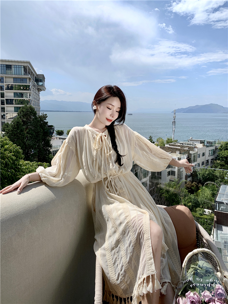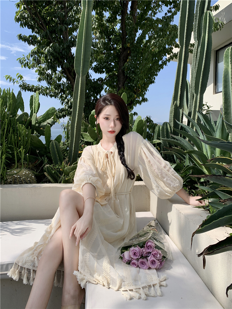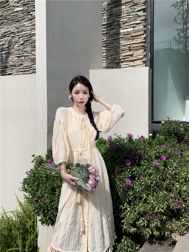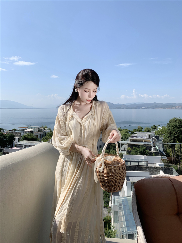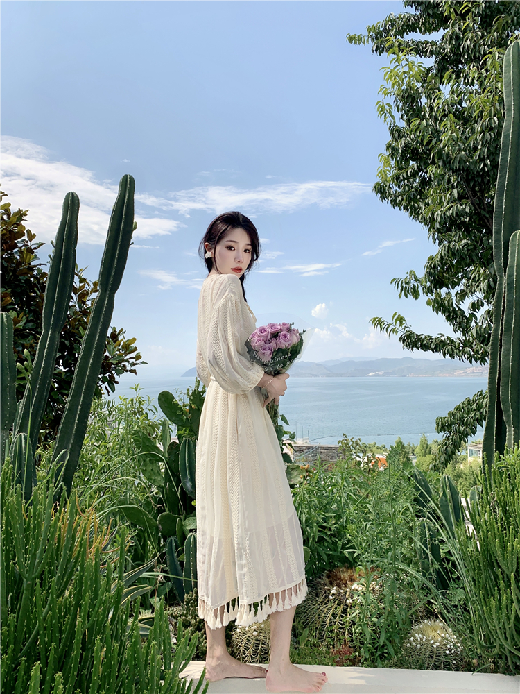 Real shot of French tassel beige cardigan dress for women with full-length embroidery jacquard niche sunscreen tassel skirt two-piece set