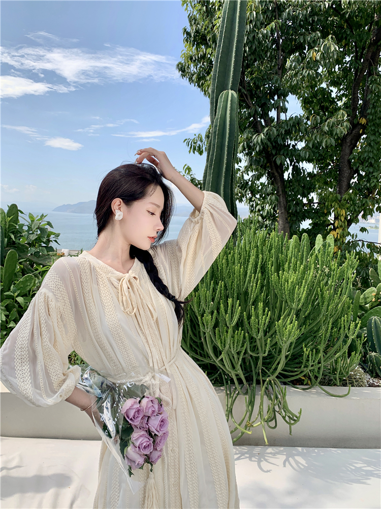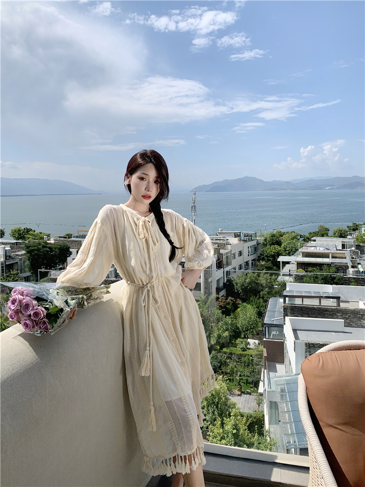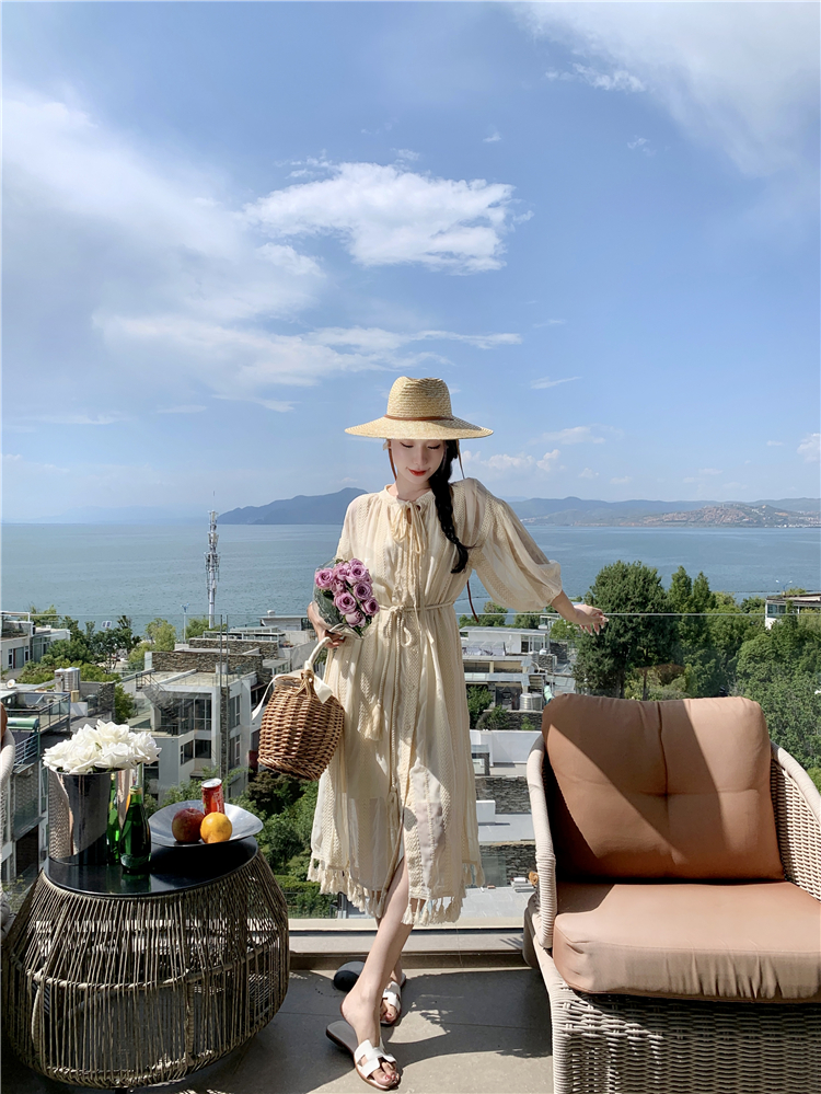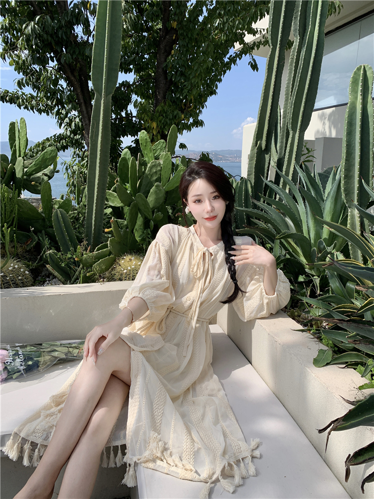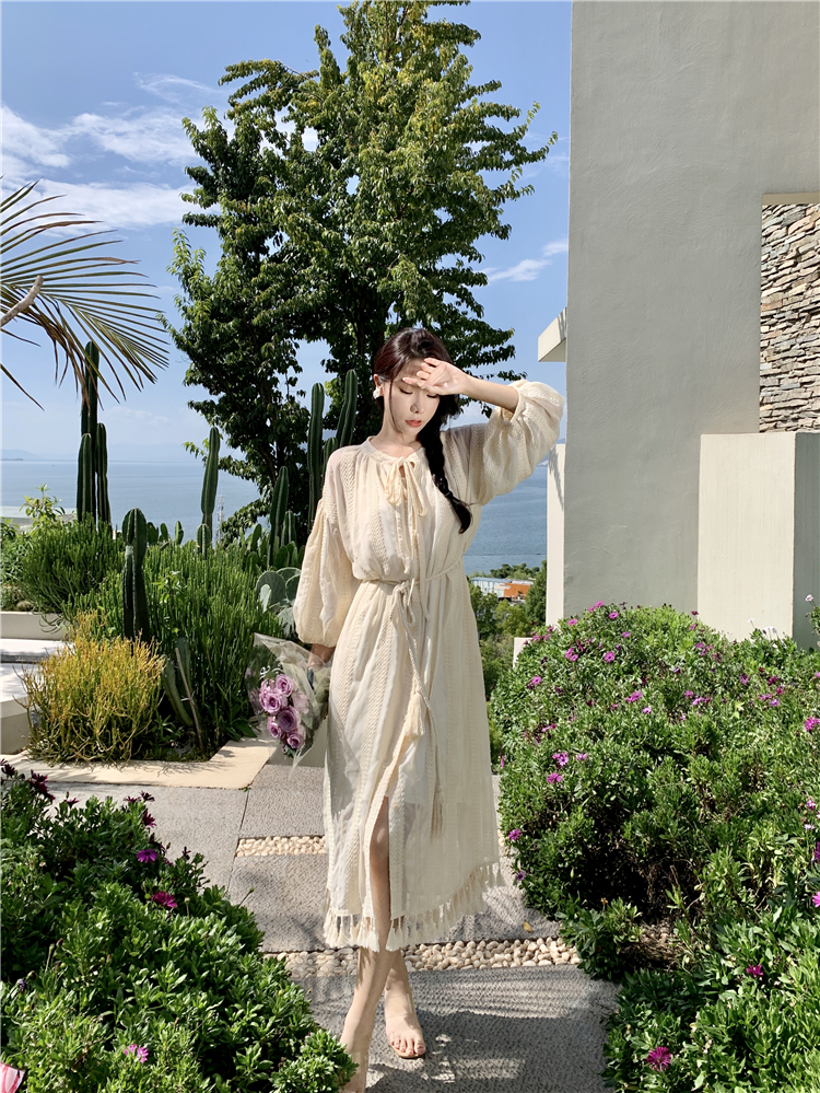 Real shot of French tassel beige cardigan dress for women with full-length embroidery jacquard niche sunscreen tassel skirt two-piece set