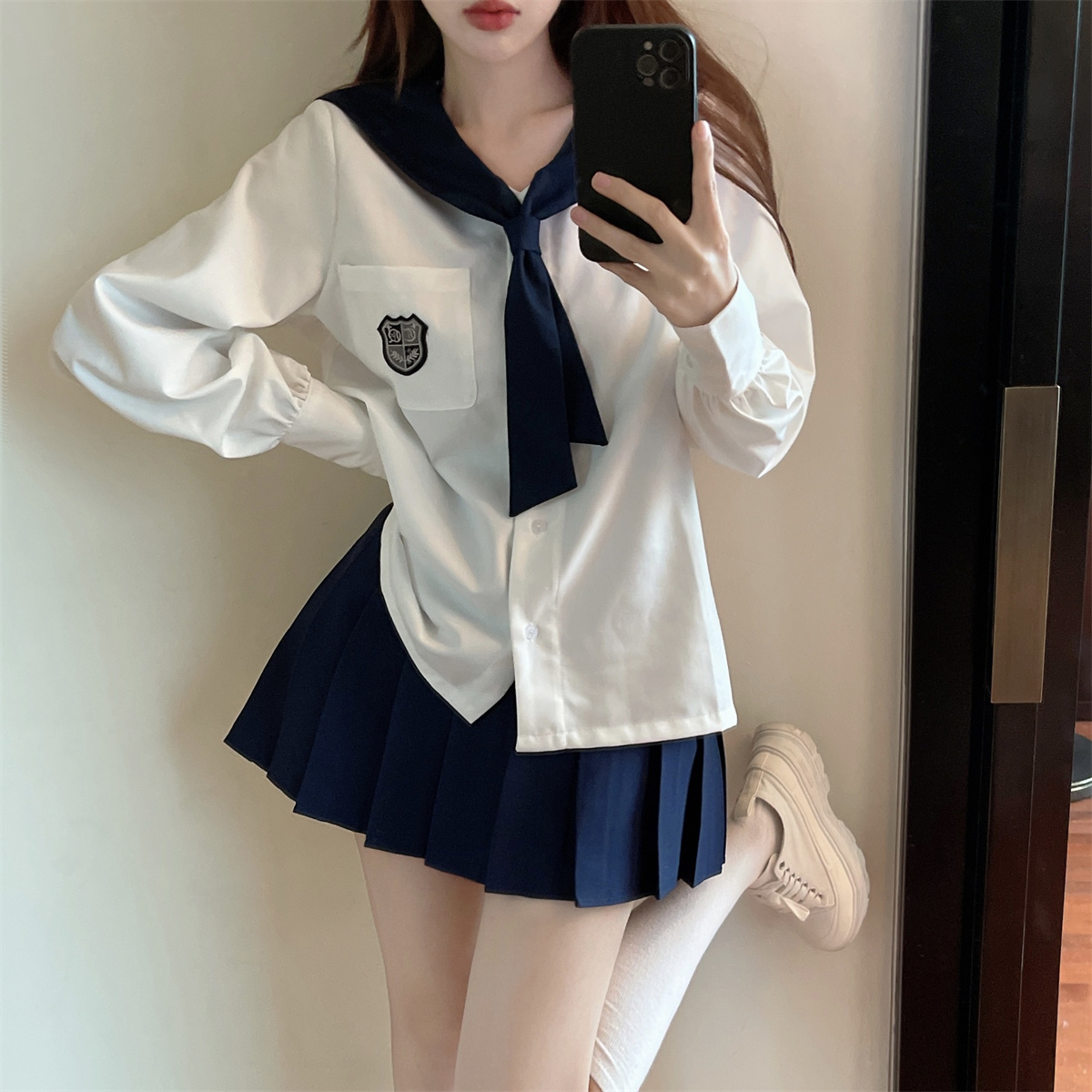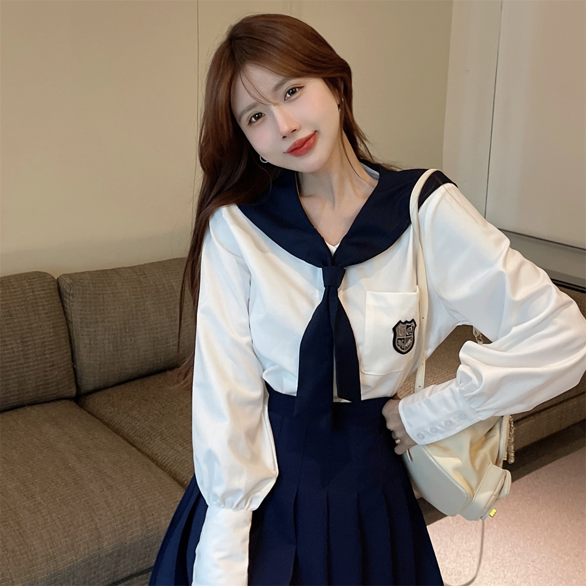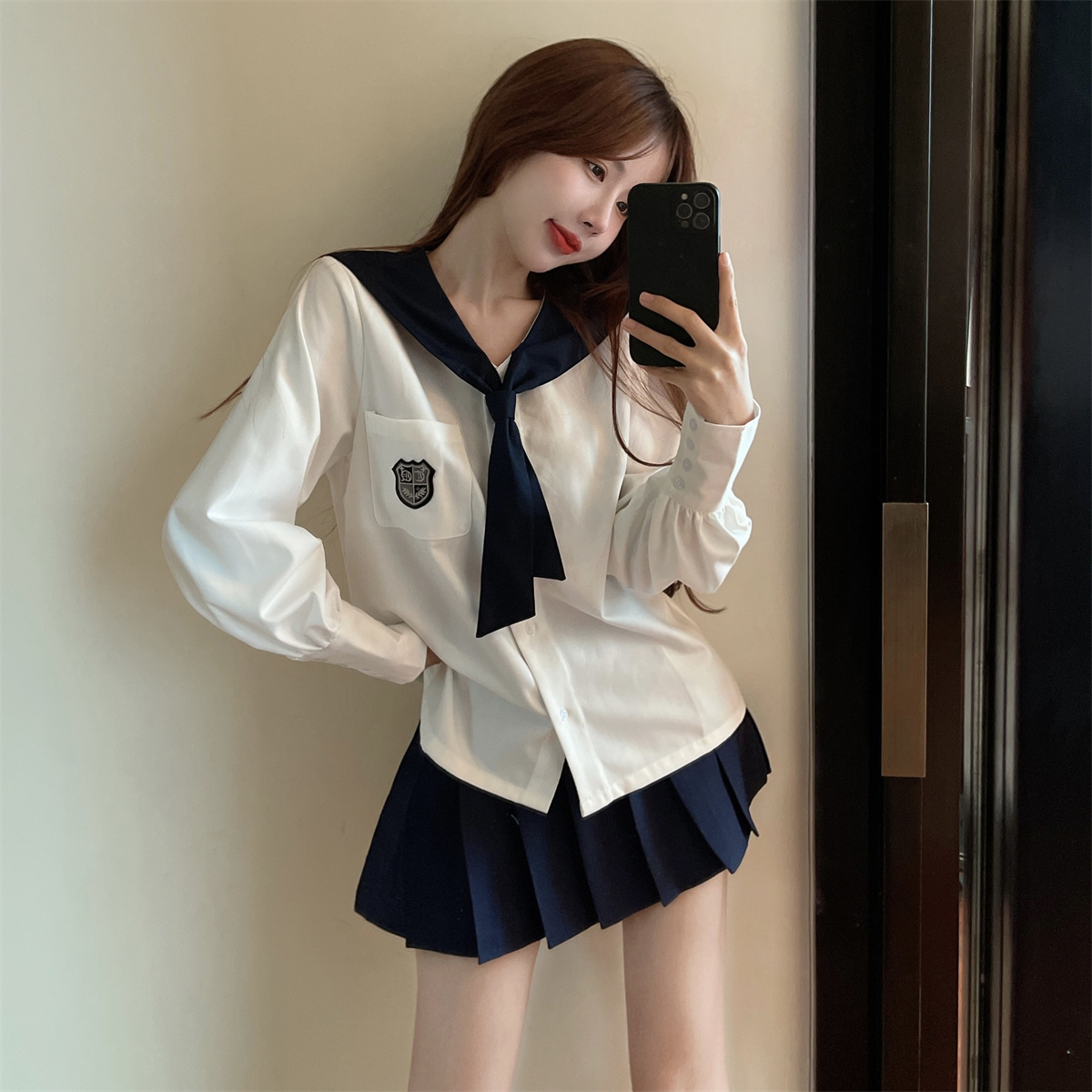 实拍实价 韩式制服学院风海军领长袖水手服高腰百褶裙jk两件套装