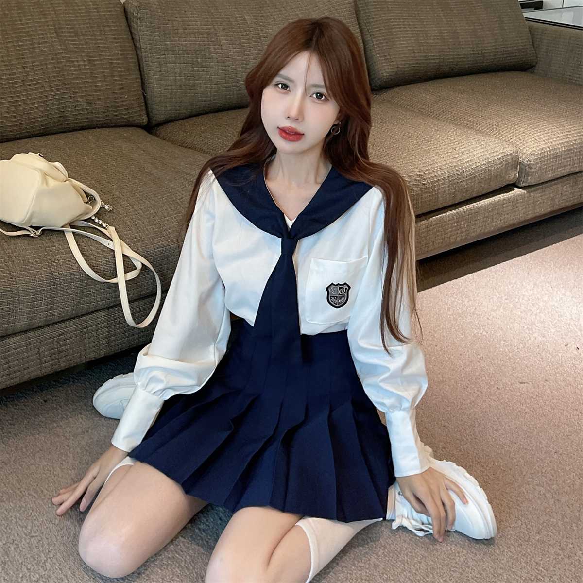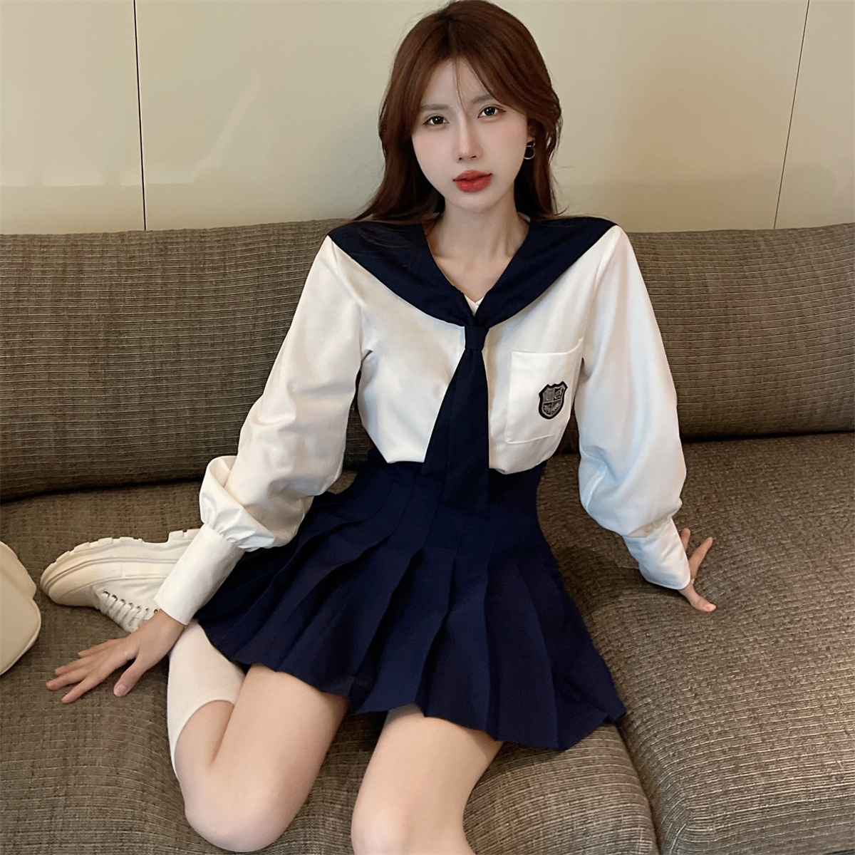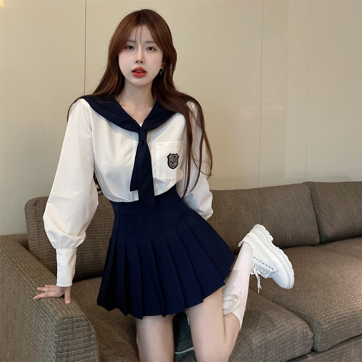 实拍实价 韩式制服学院风海军领长袖水手服高腰百褶裙jk两件套装