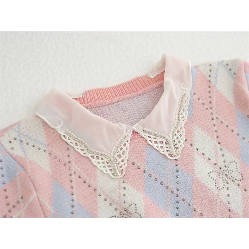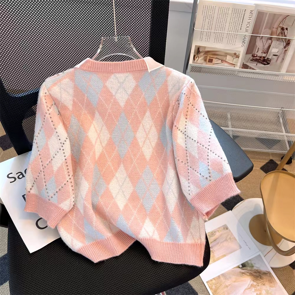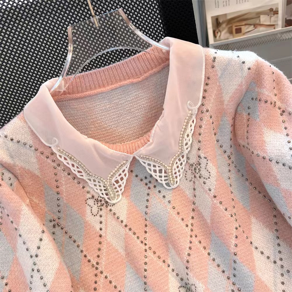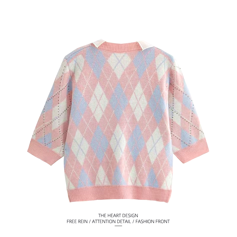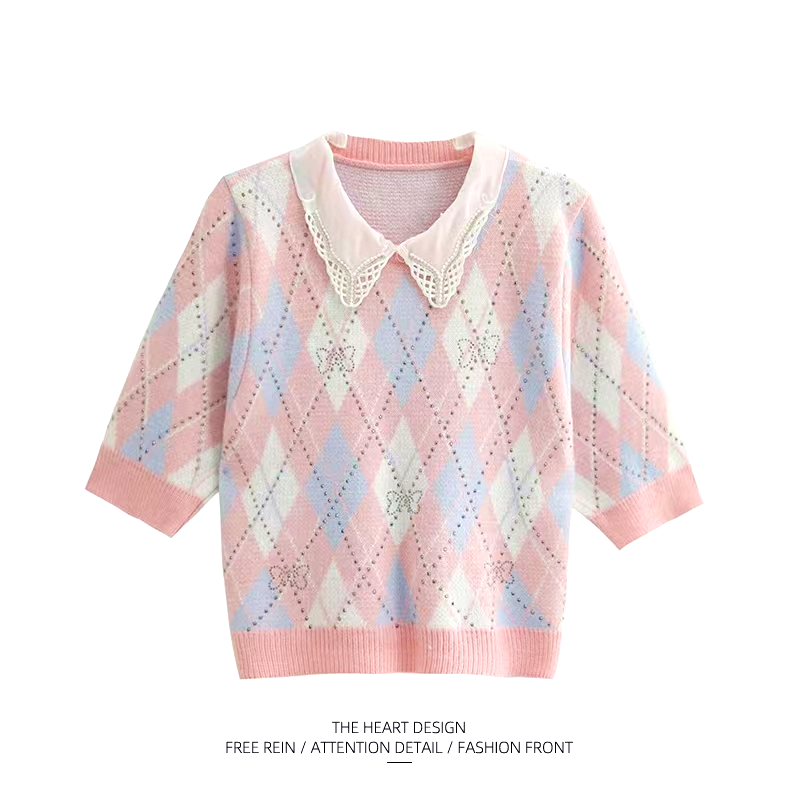 大牌女装捡漏清仓学院风甜美娃娃领针织面料菱格T恤女