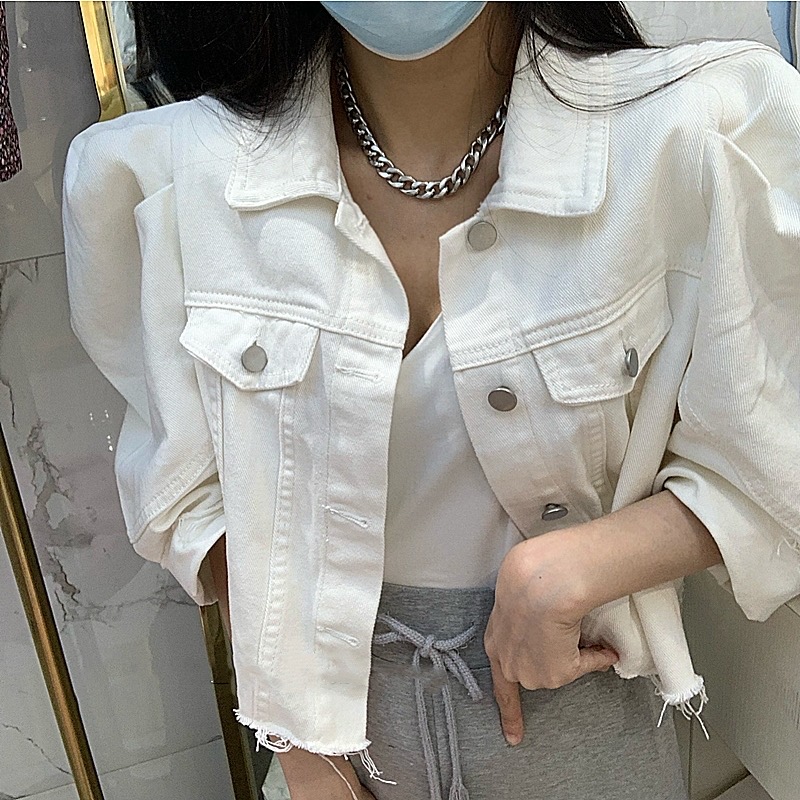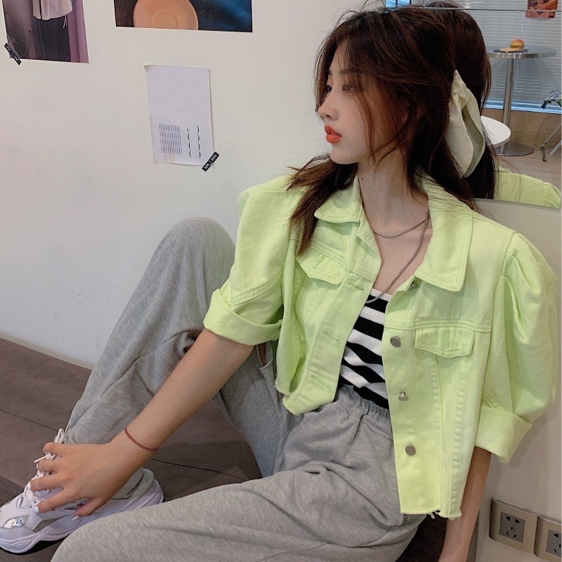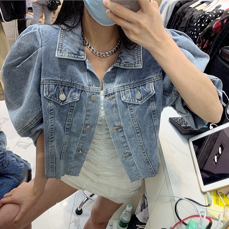 韩国东大门灯笼短袖古廓形七分泡泡袖牛仔短外套