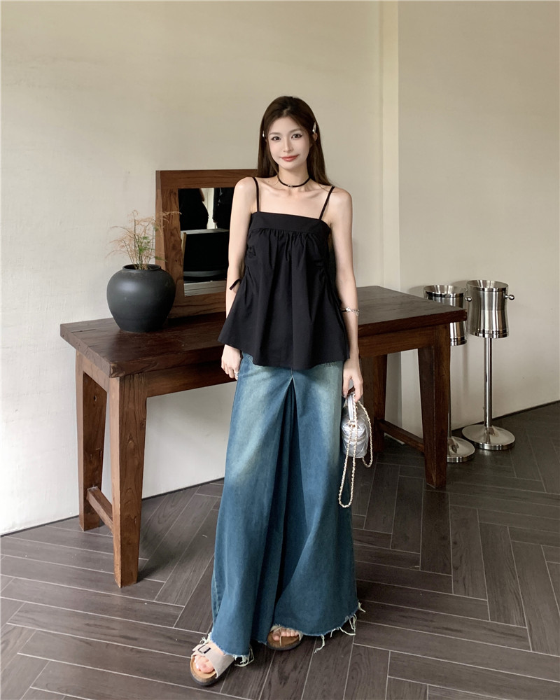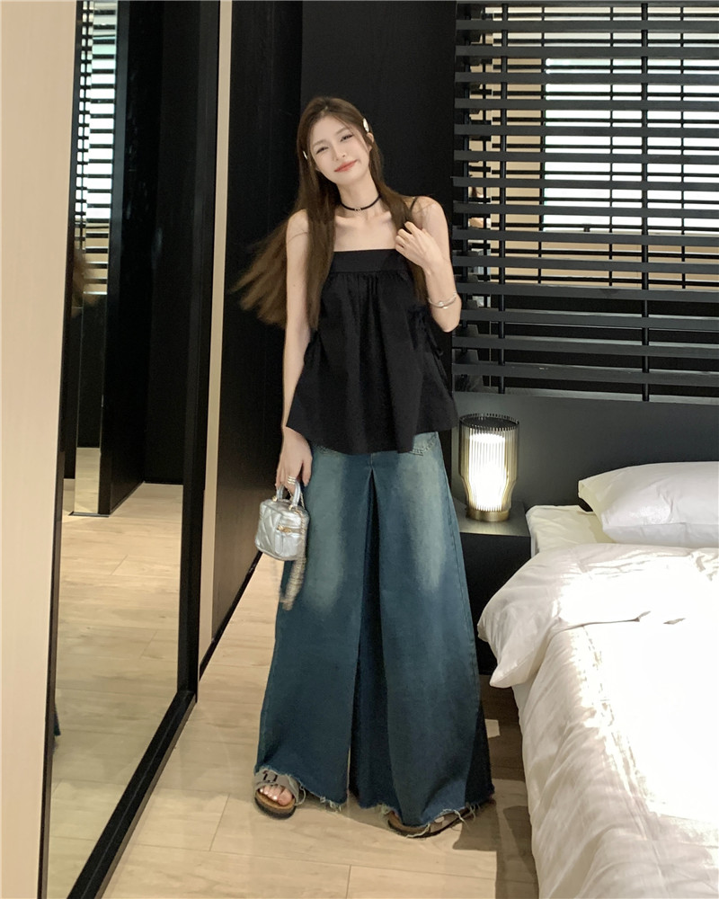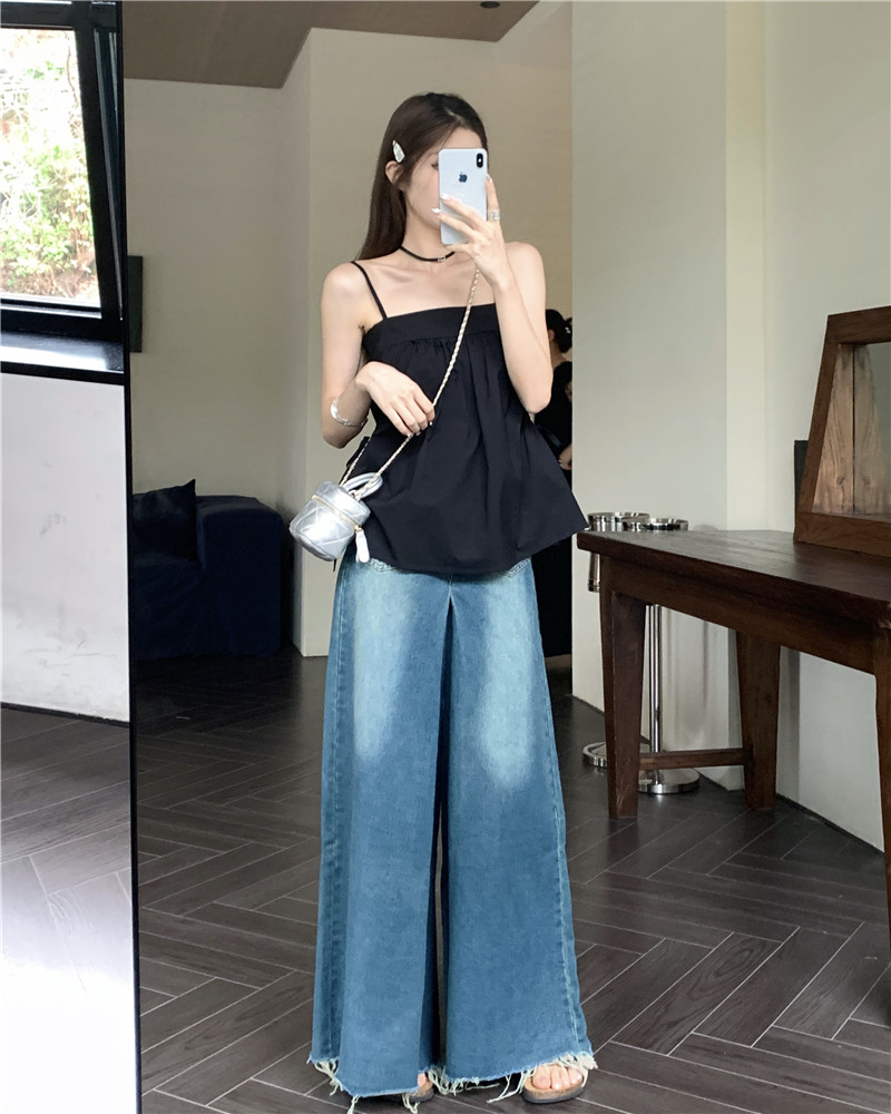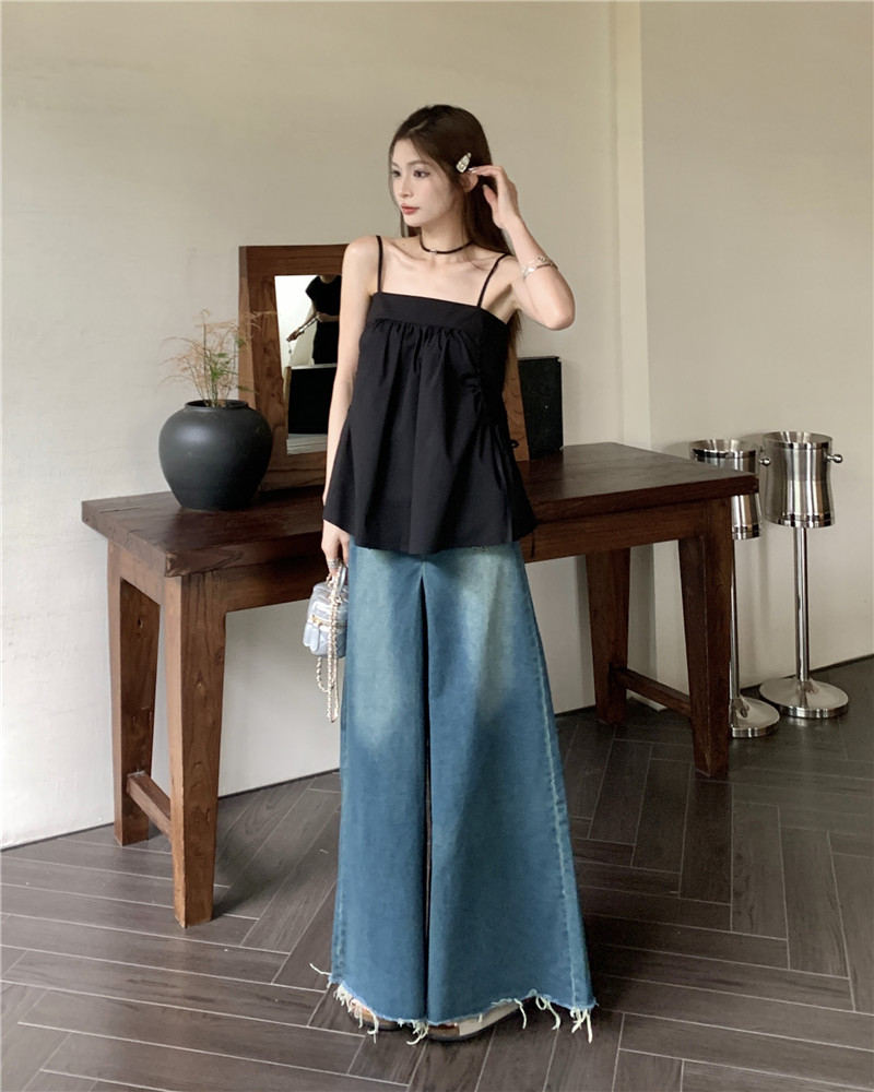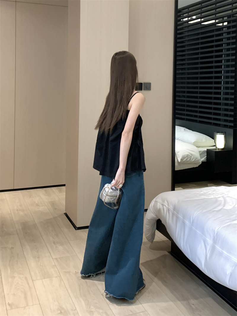 实拍实价 2023夏纯色镂空设计洋气韩版吊带上衣+牛仔宽松阔腿长裤
