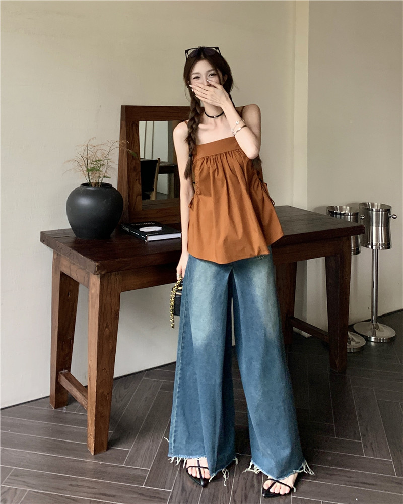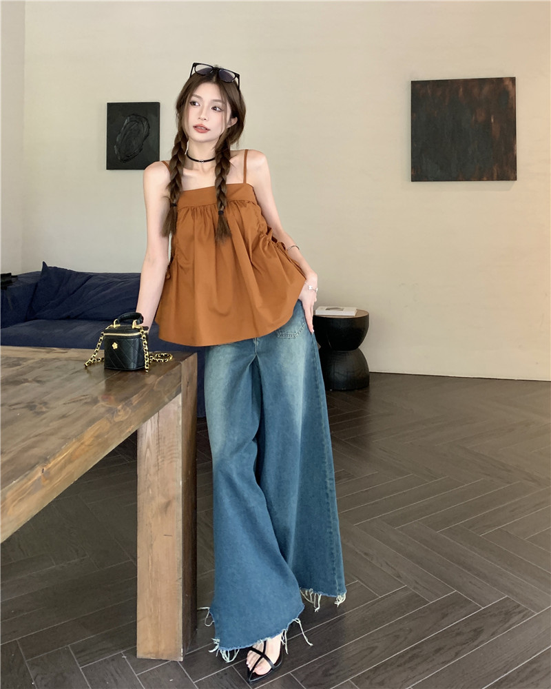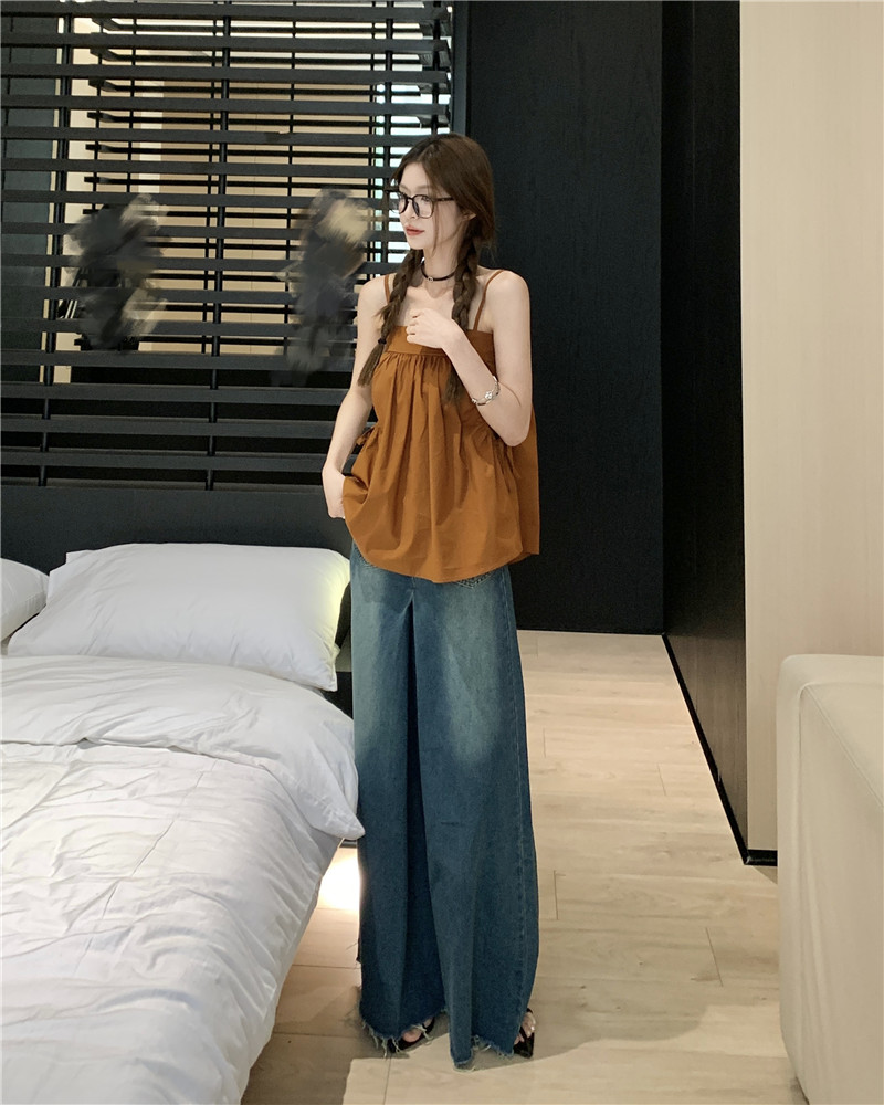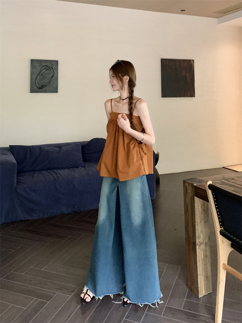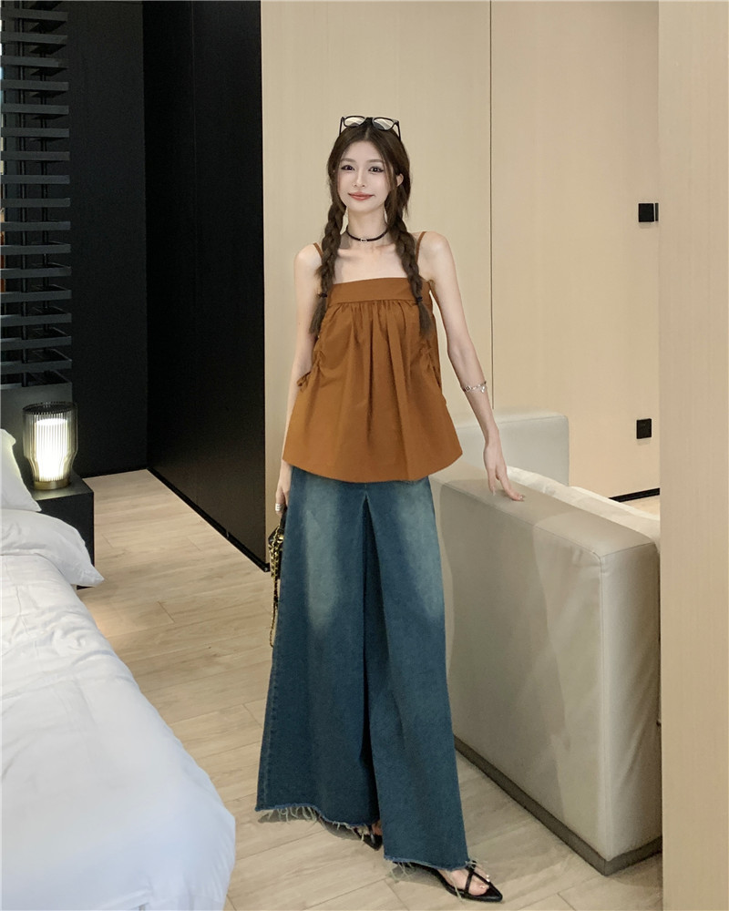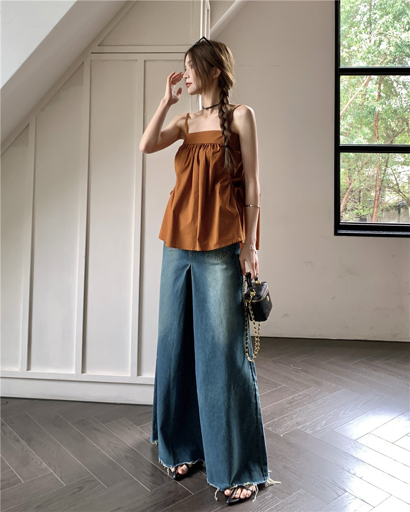 实拍实价 2023夏纯色镂空设计洋气韩版吊带上衣+牛仔宽松阔腿长裤