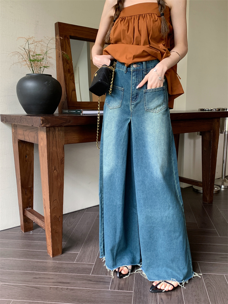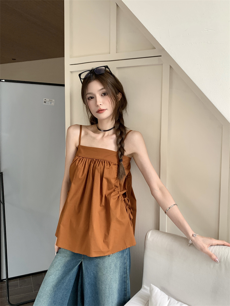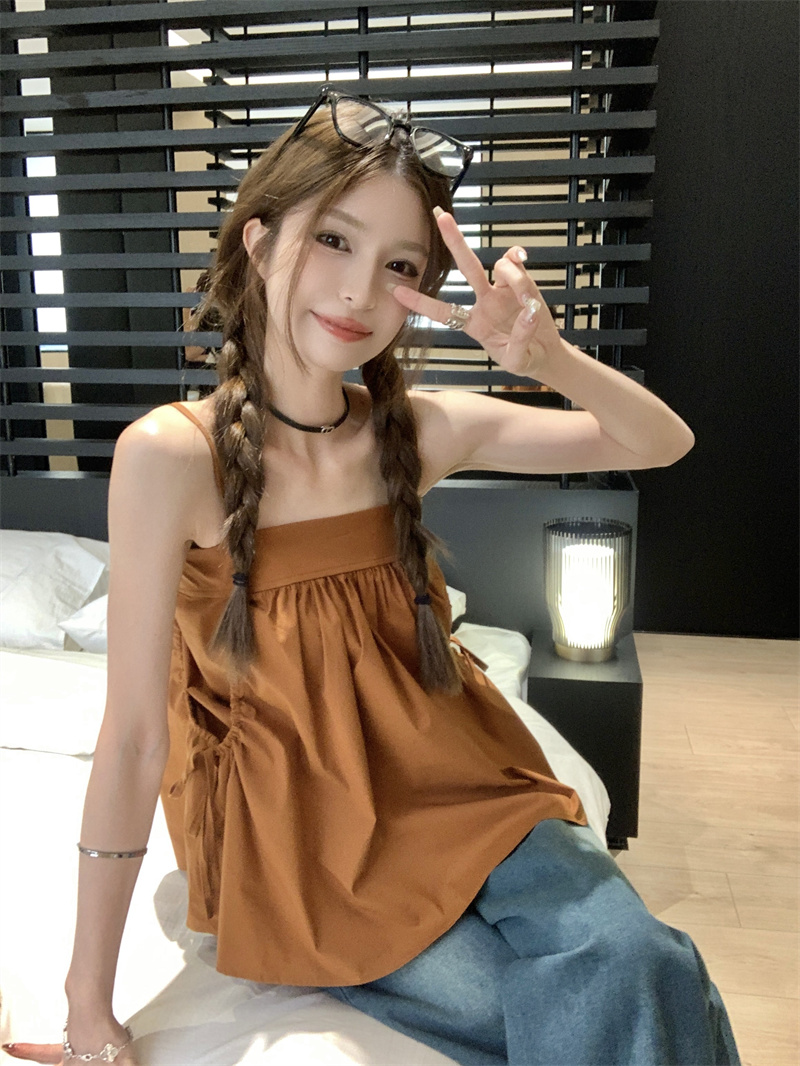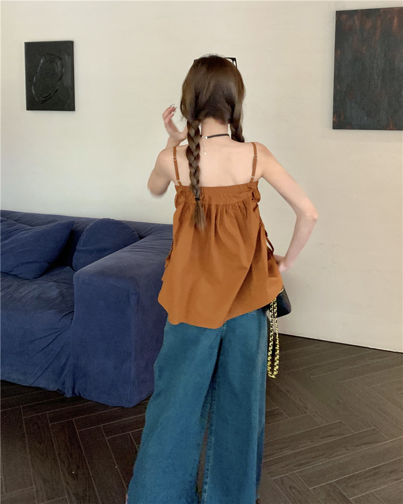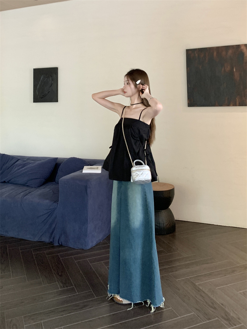实拍实价 2023夏纯色镂空设计洋气韩版吊带上衣+牛仔宽松阔腿长裤