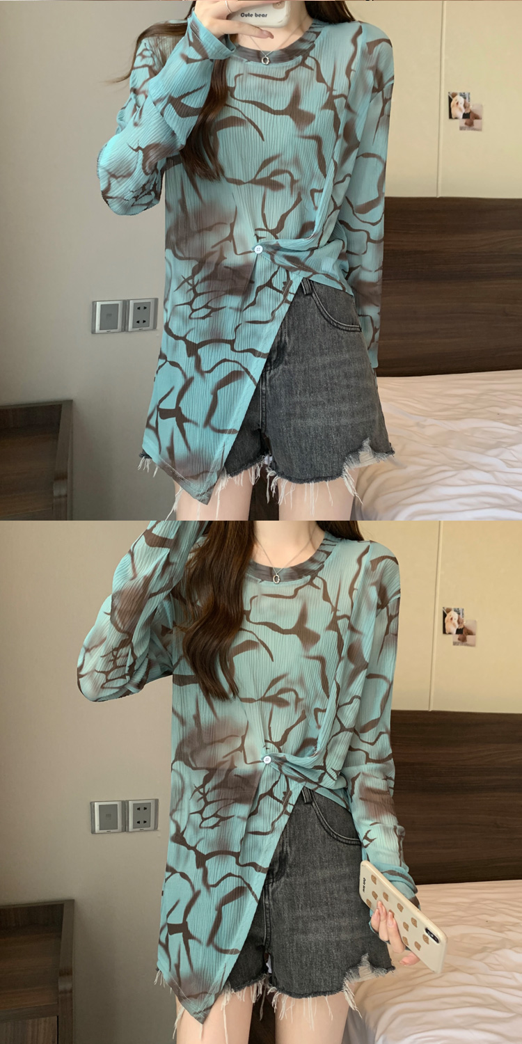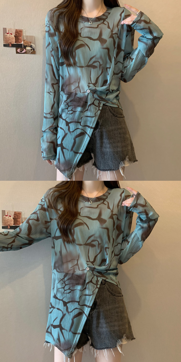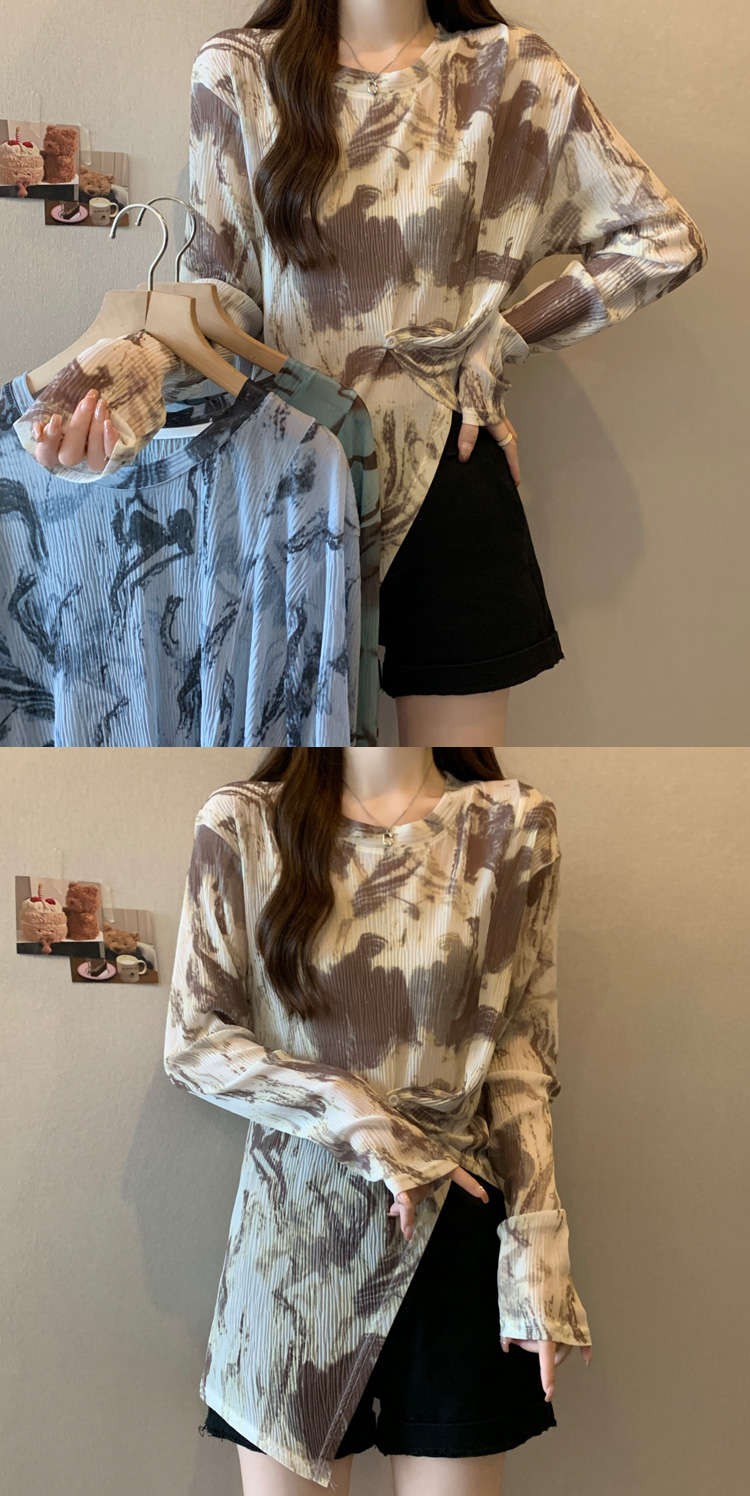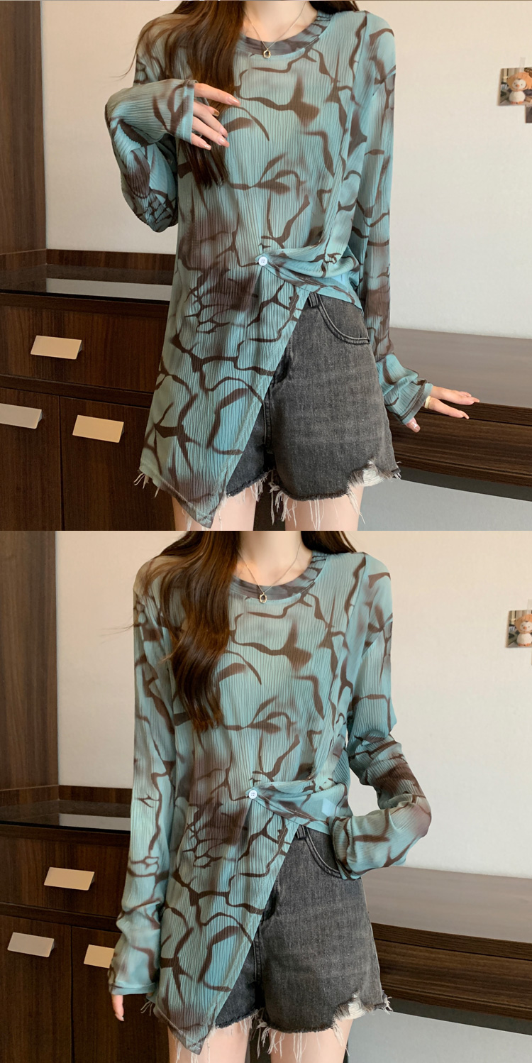 实拍大码扎染网纱打底衫女2023夏季新长款内搭防晒长袖t恤薄款
