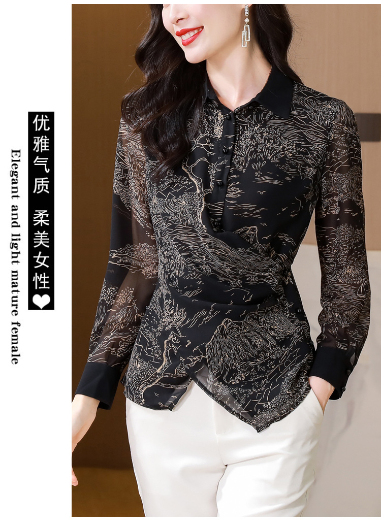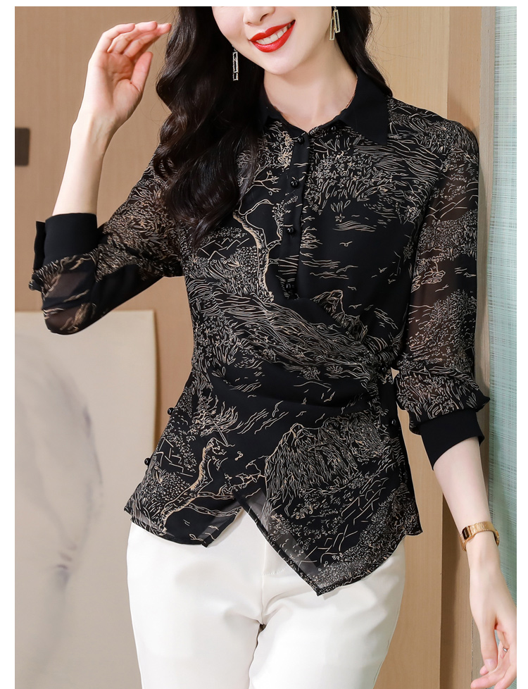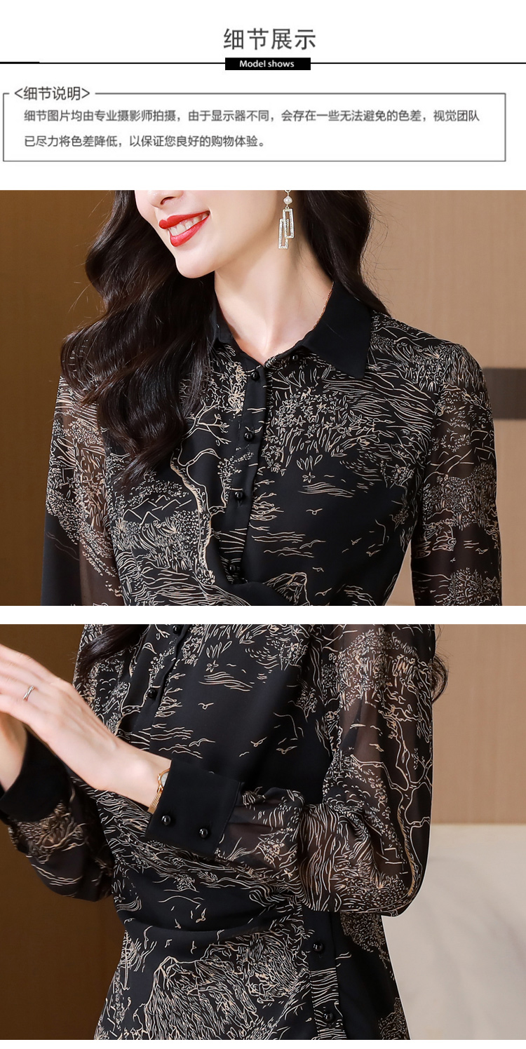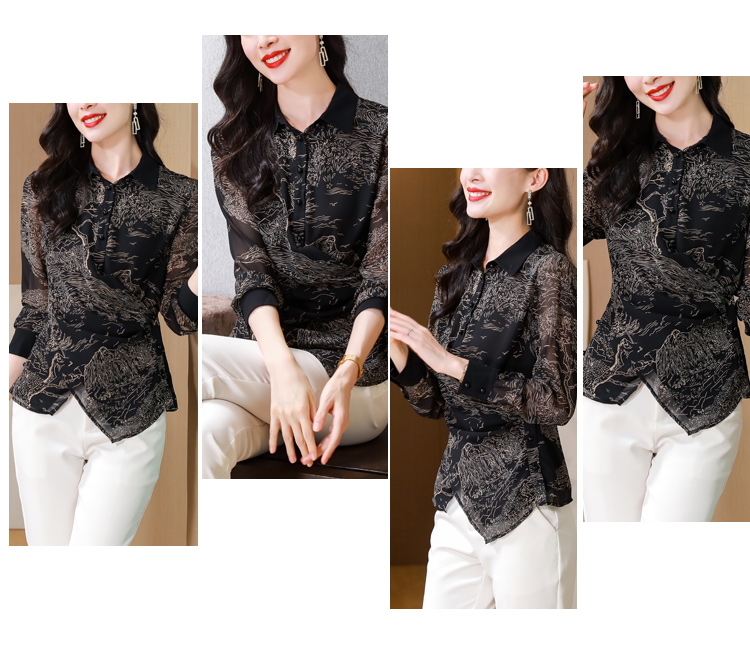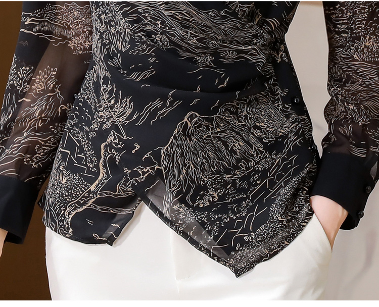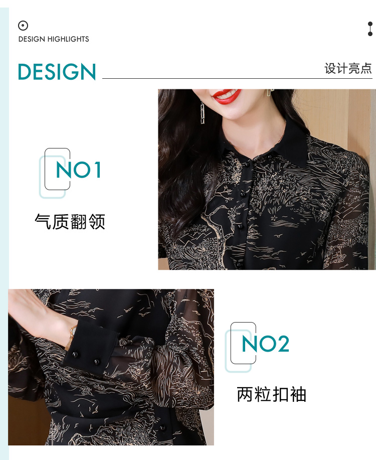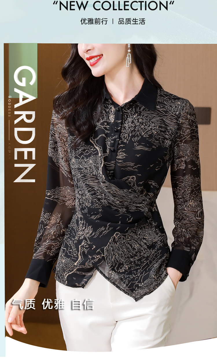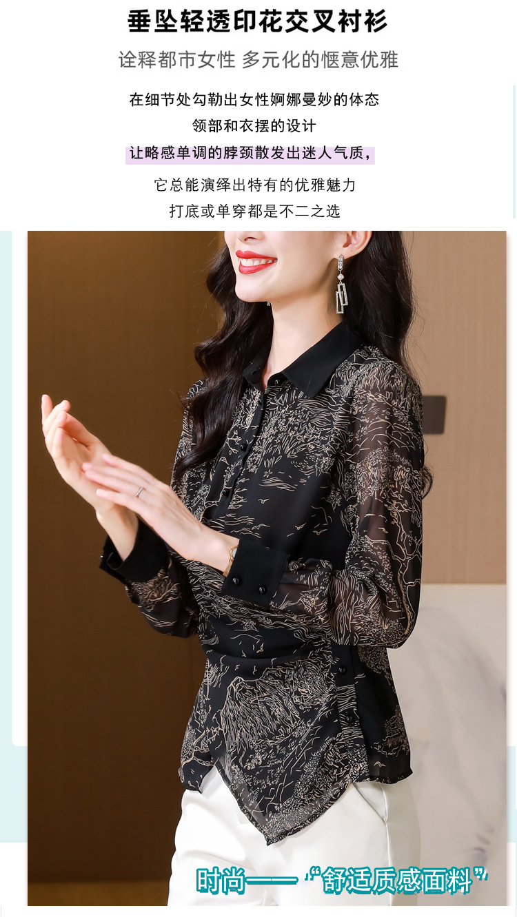 Real shot of high-end retro printed chiffon shirt for women 2023 early autumn new French design waist long sleeves stylish