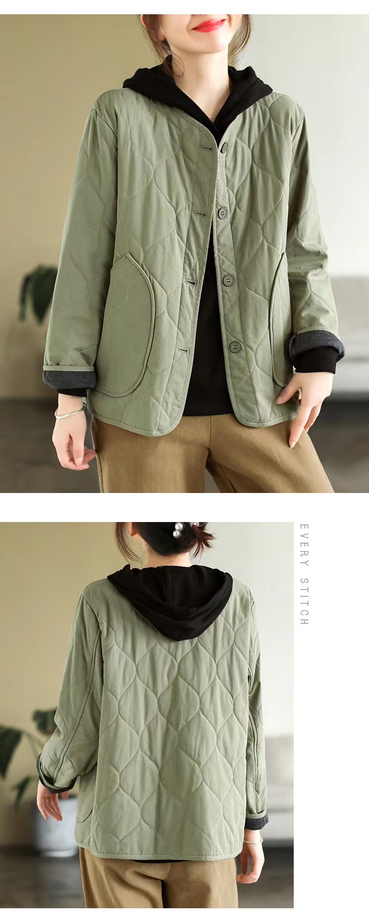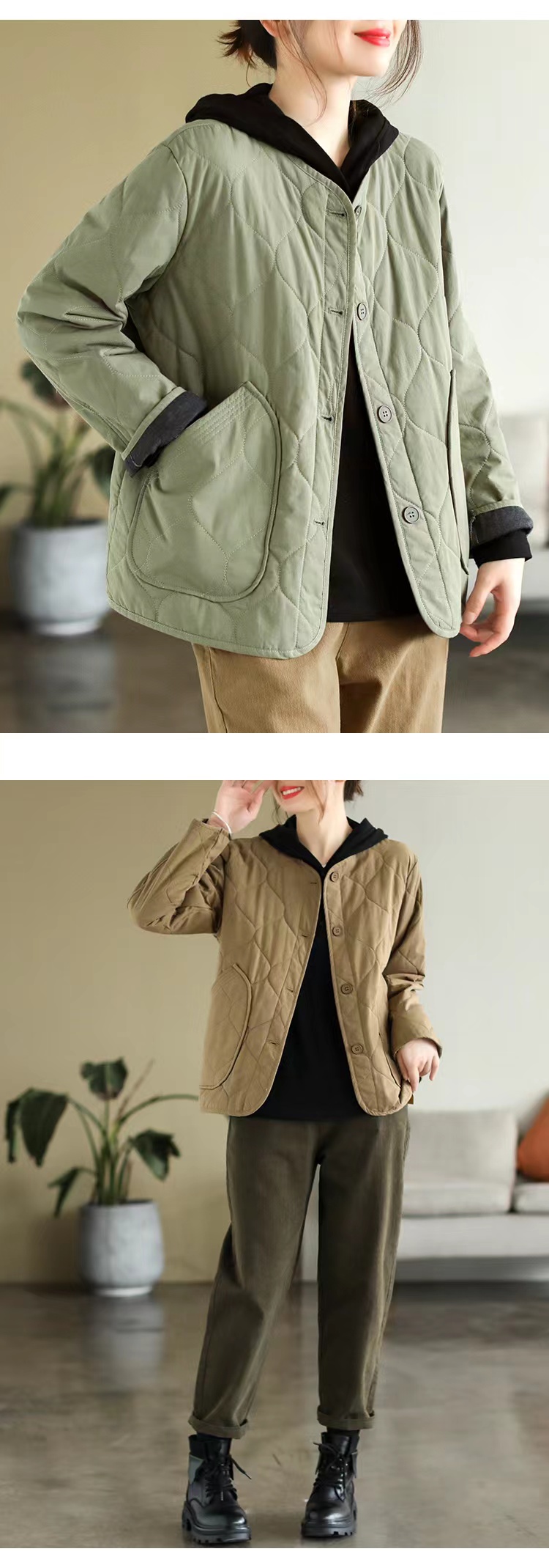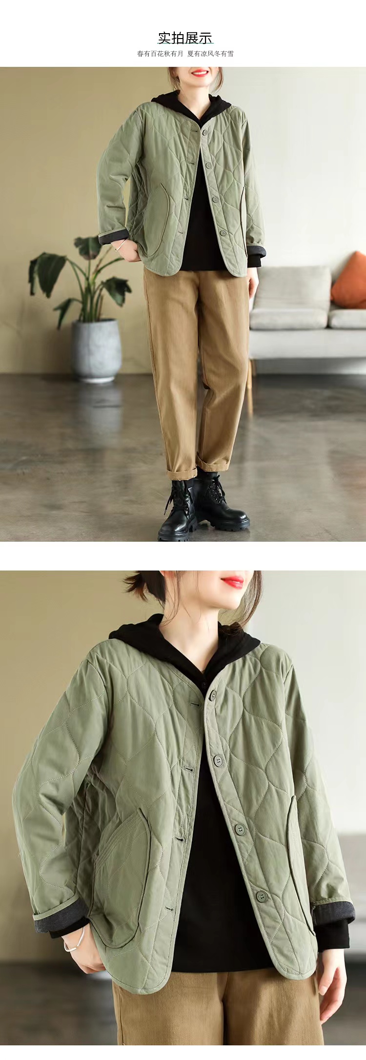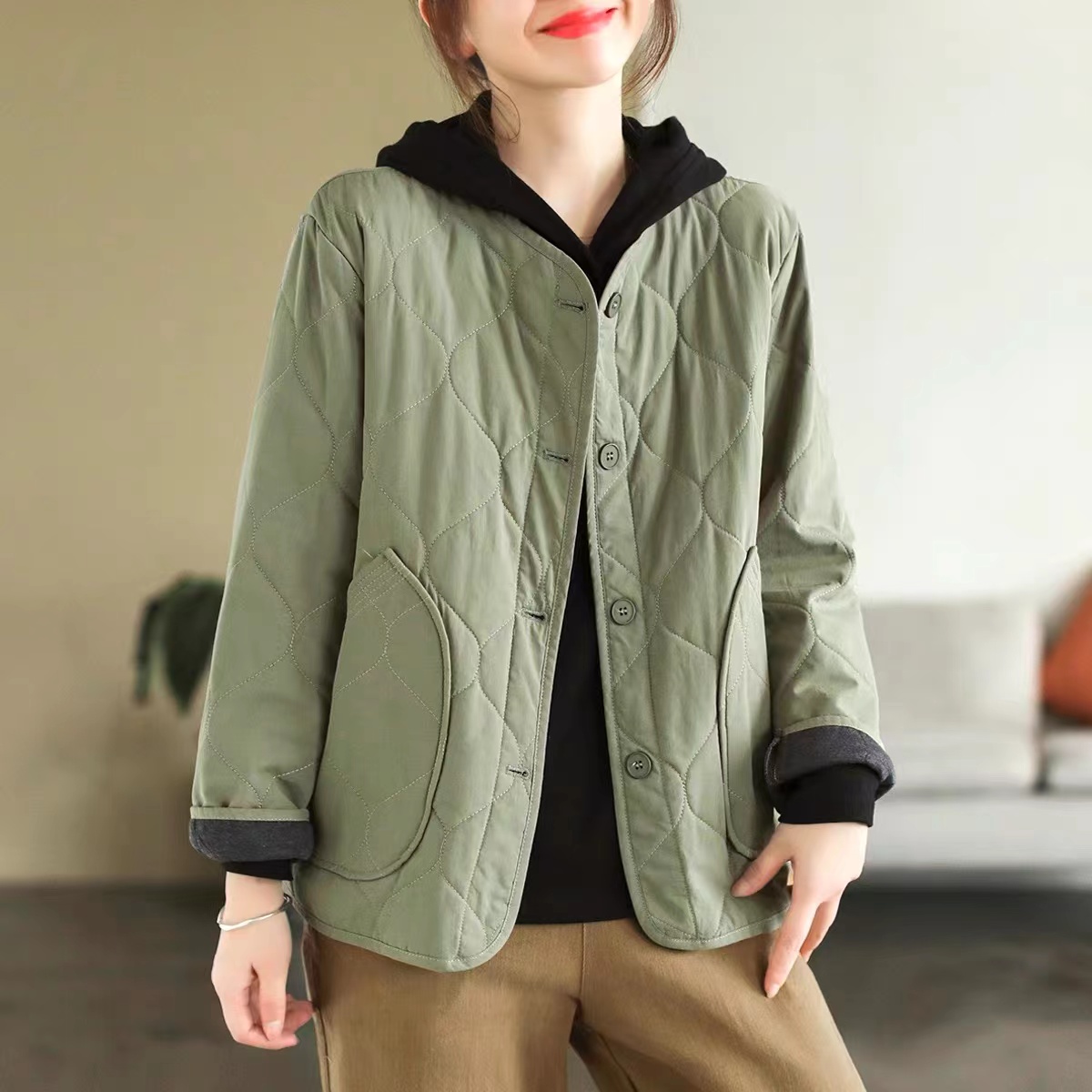 复古棉质冬季夹棉保暖长袖棉衣女2022新款纯色菱格棉袄短外套