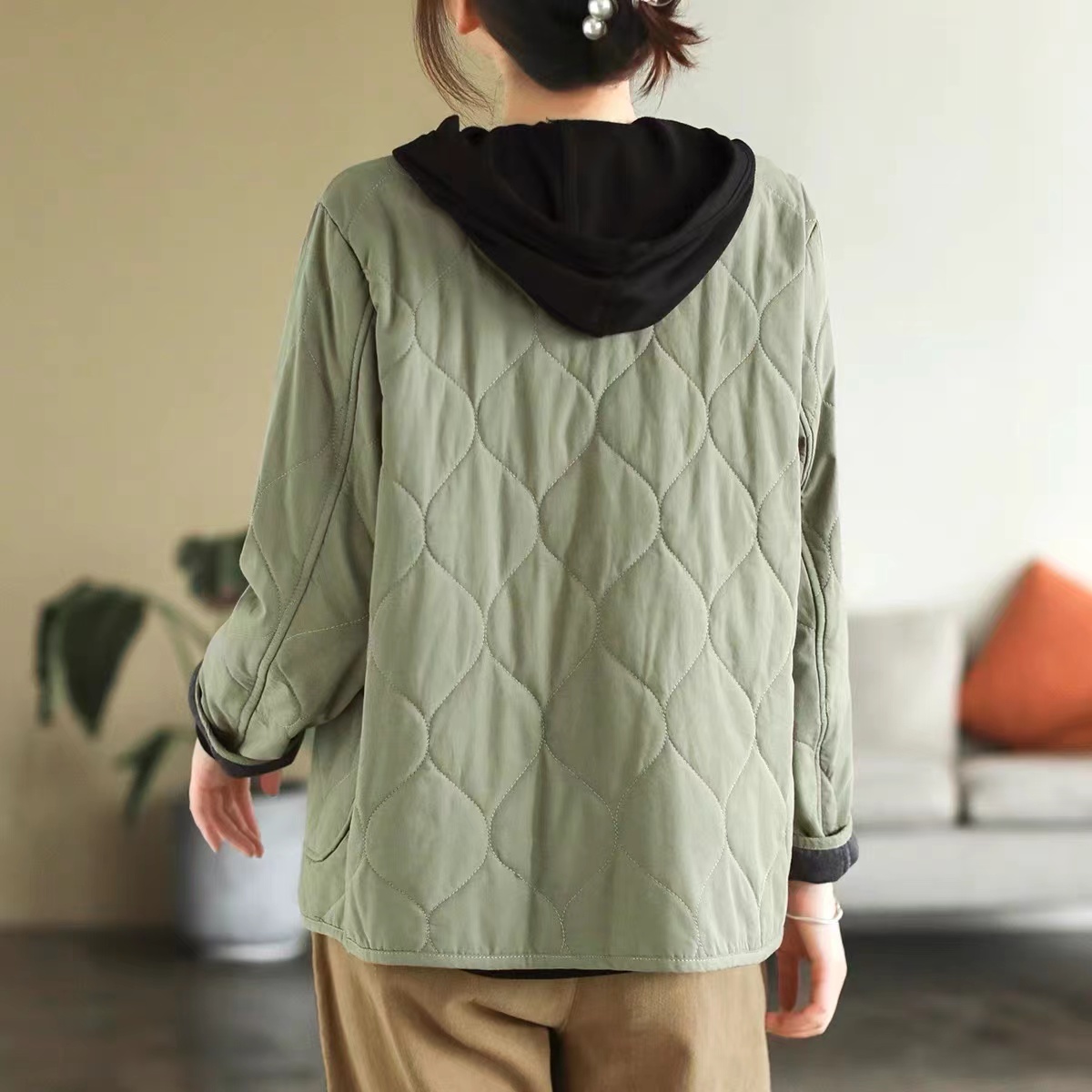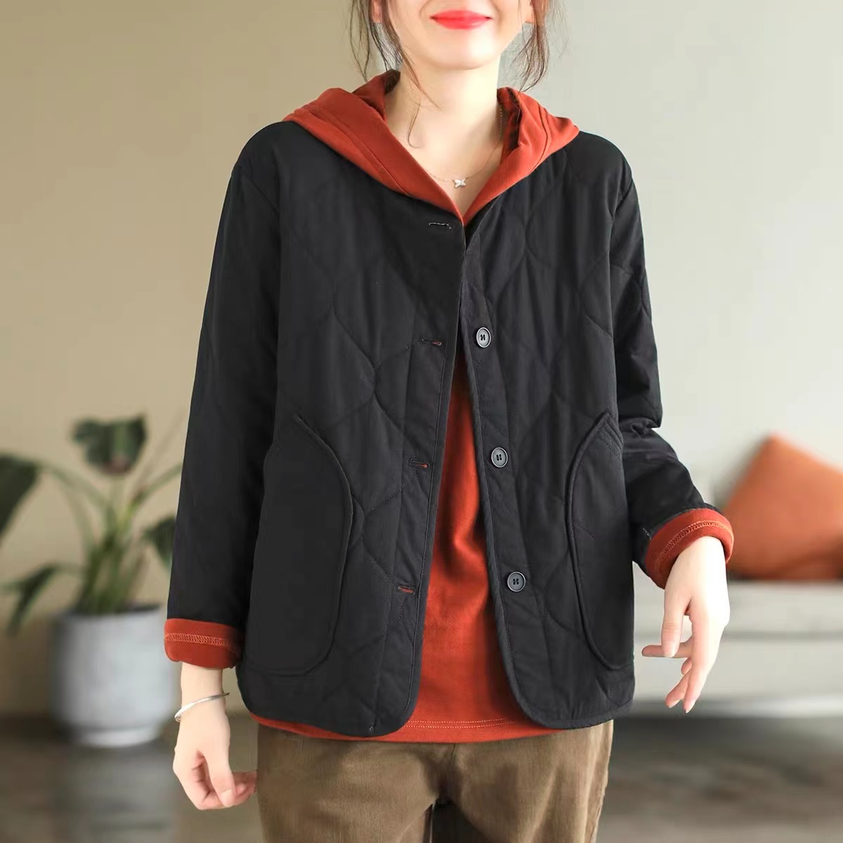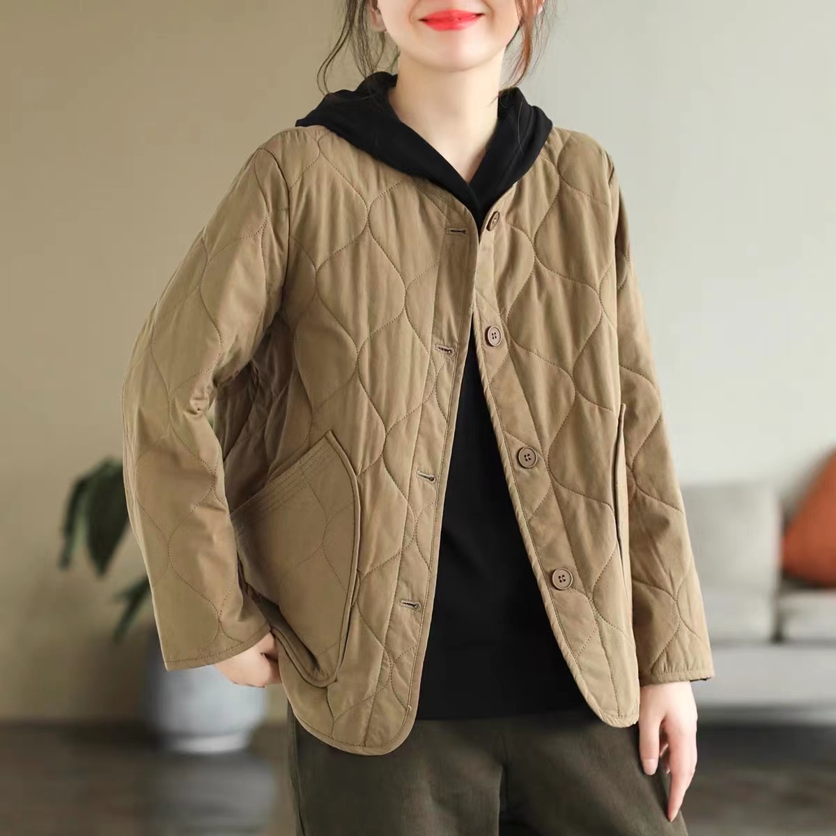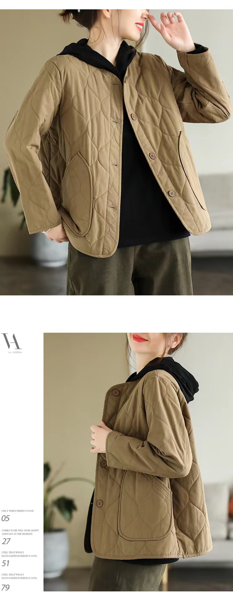 复古棉质冬季夹棉保暖长袖棉衣女2022新款纯色菱格棉袄短外套