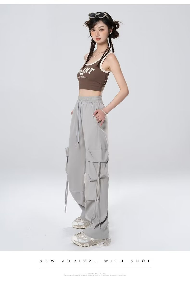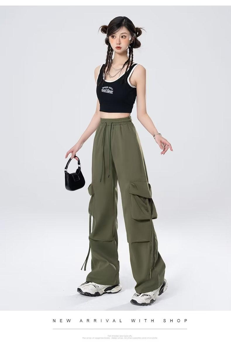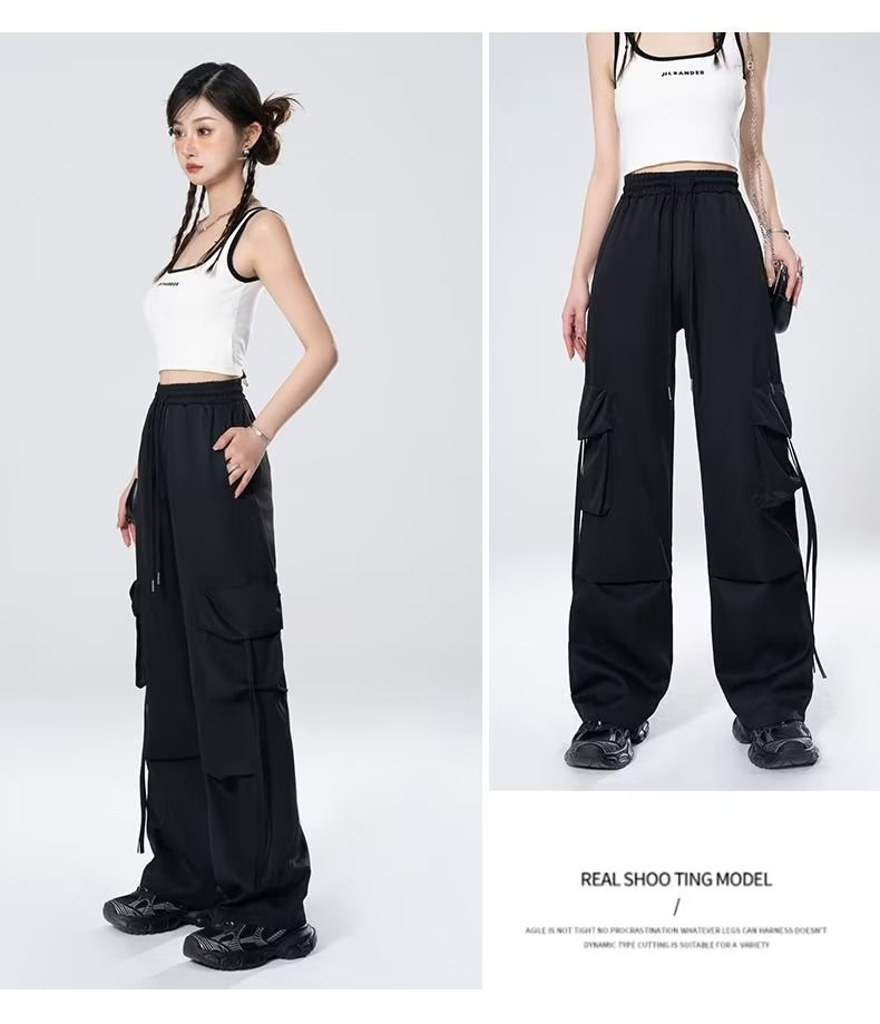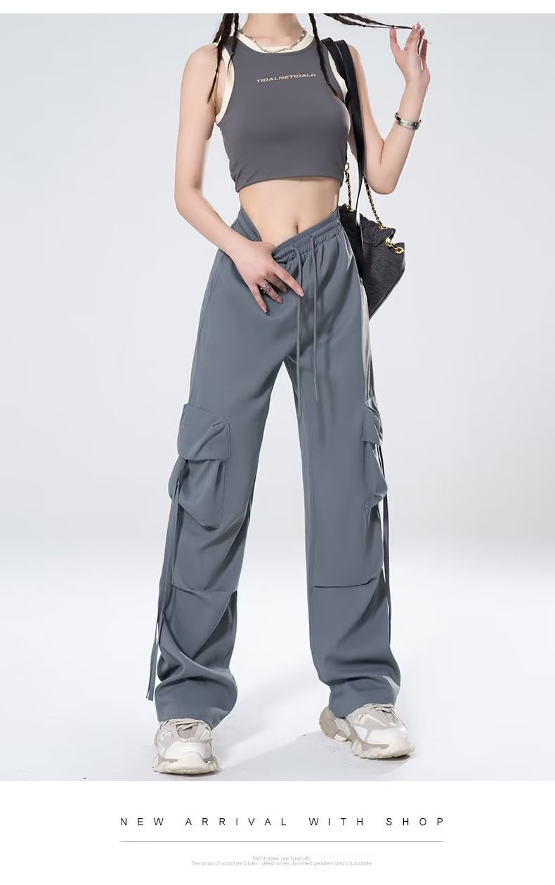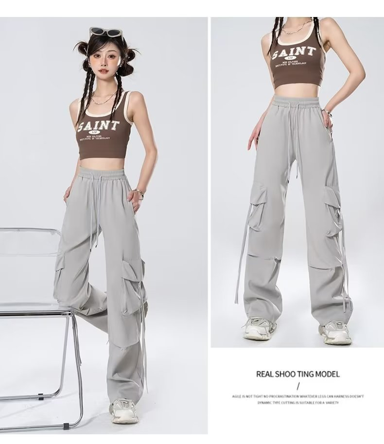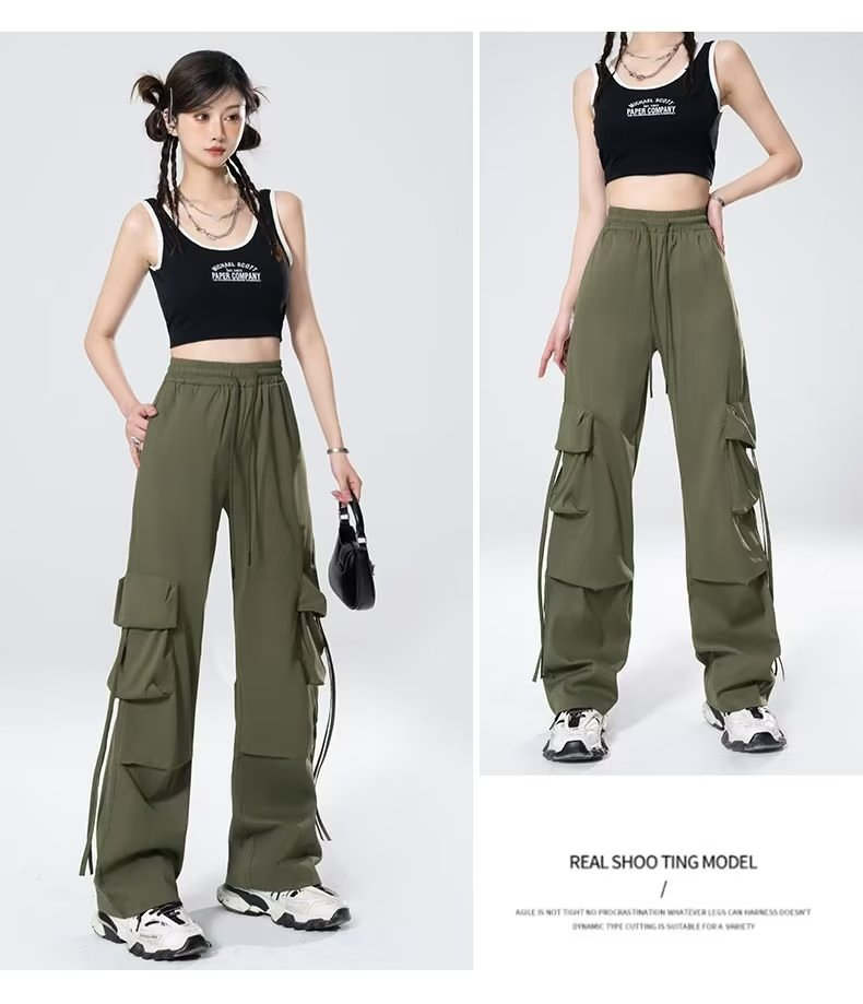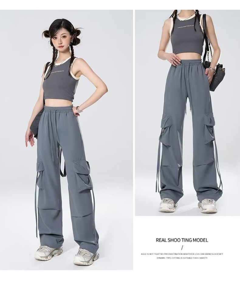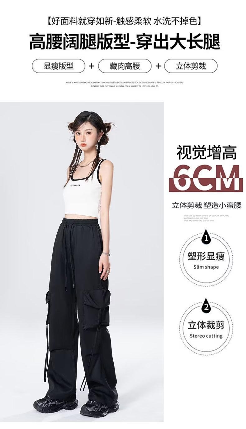 官图 春秋美式工装裤女夏季薄款阔腿高腰直筒垂感长裤休闲运动裤