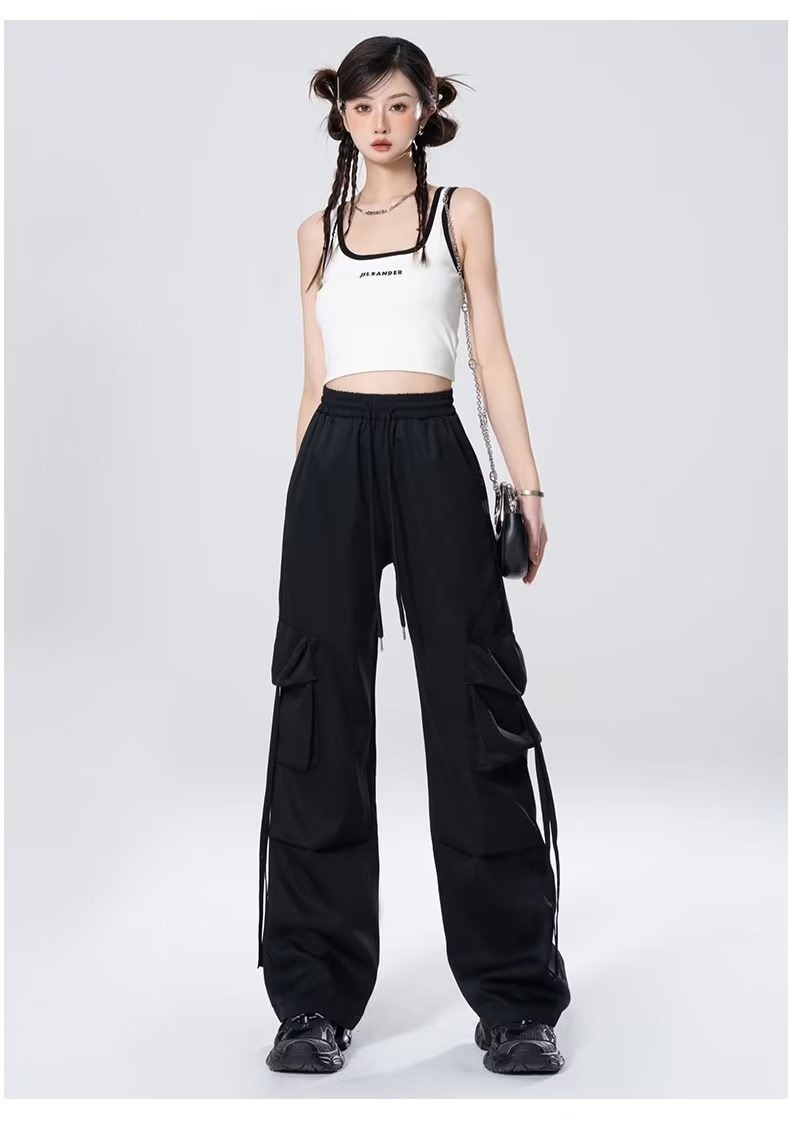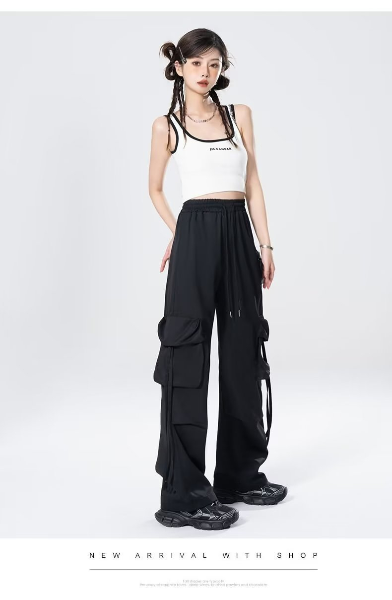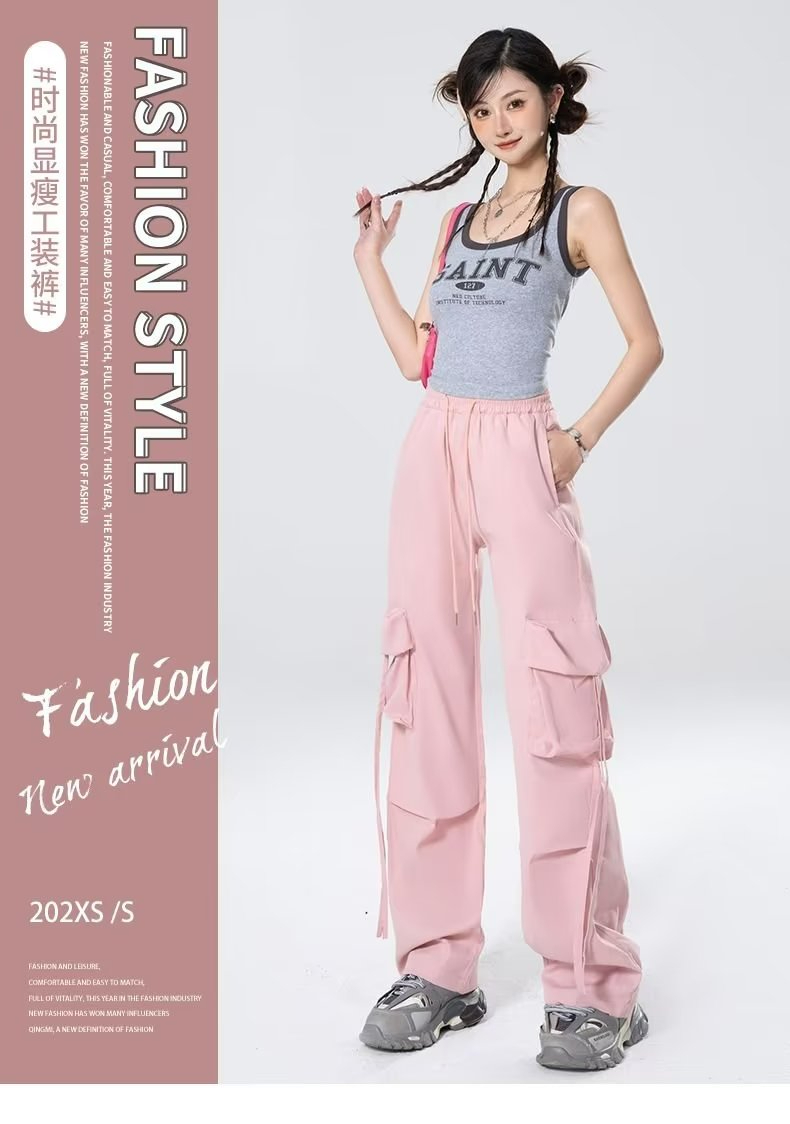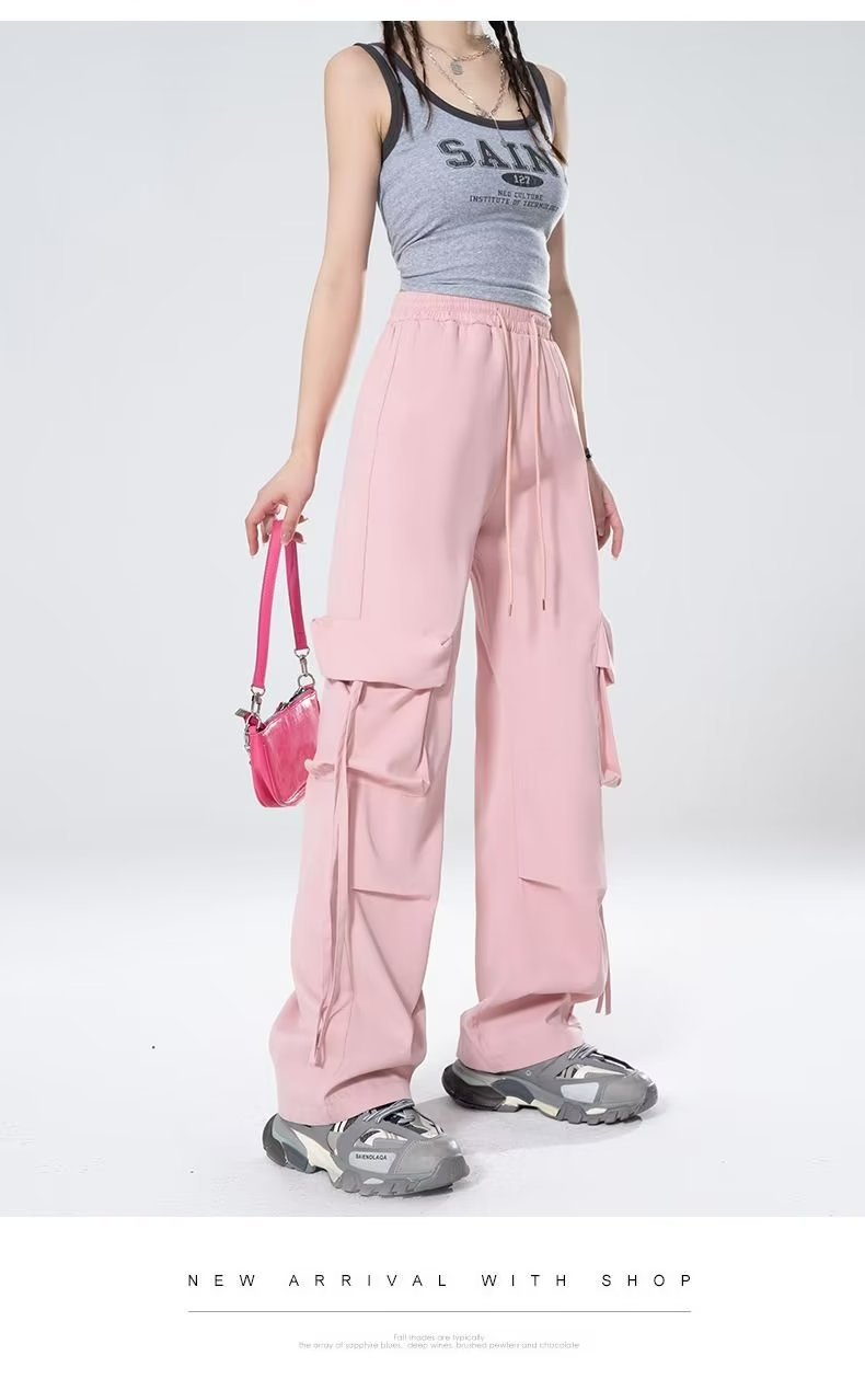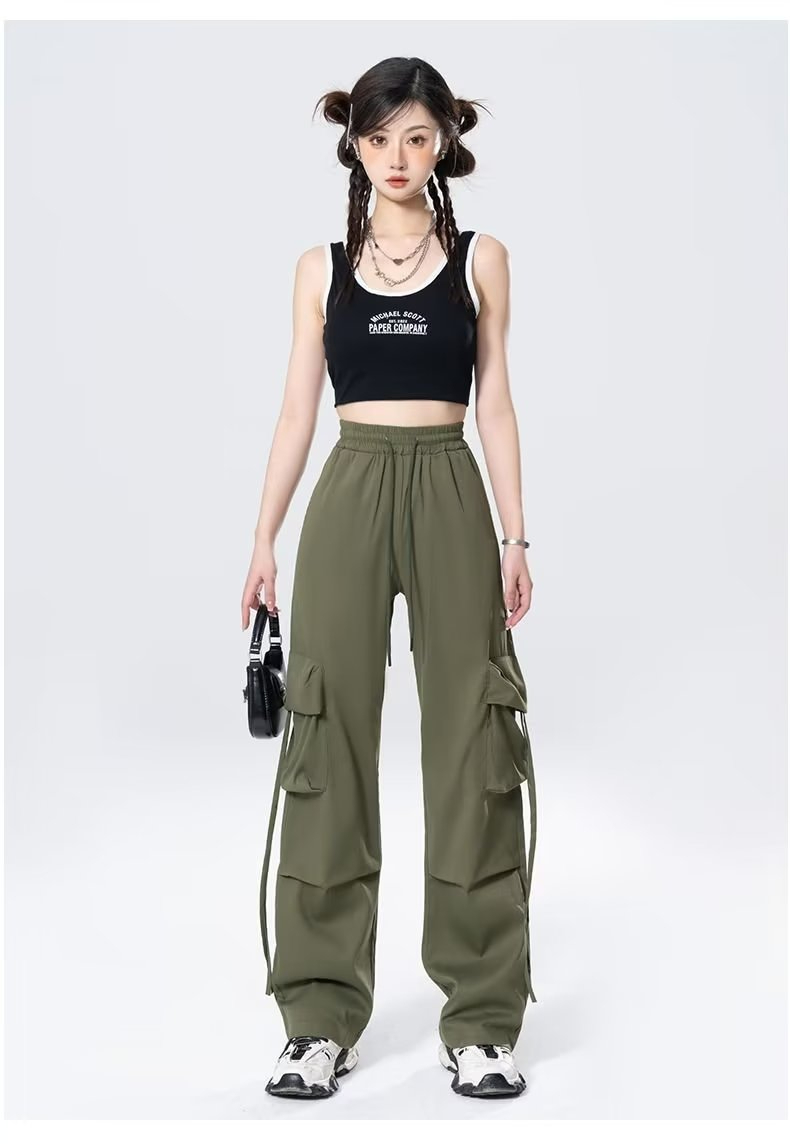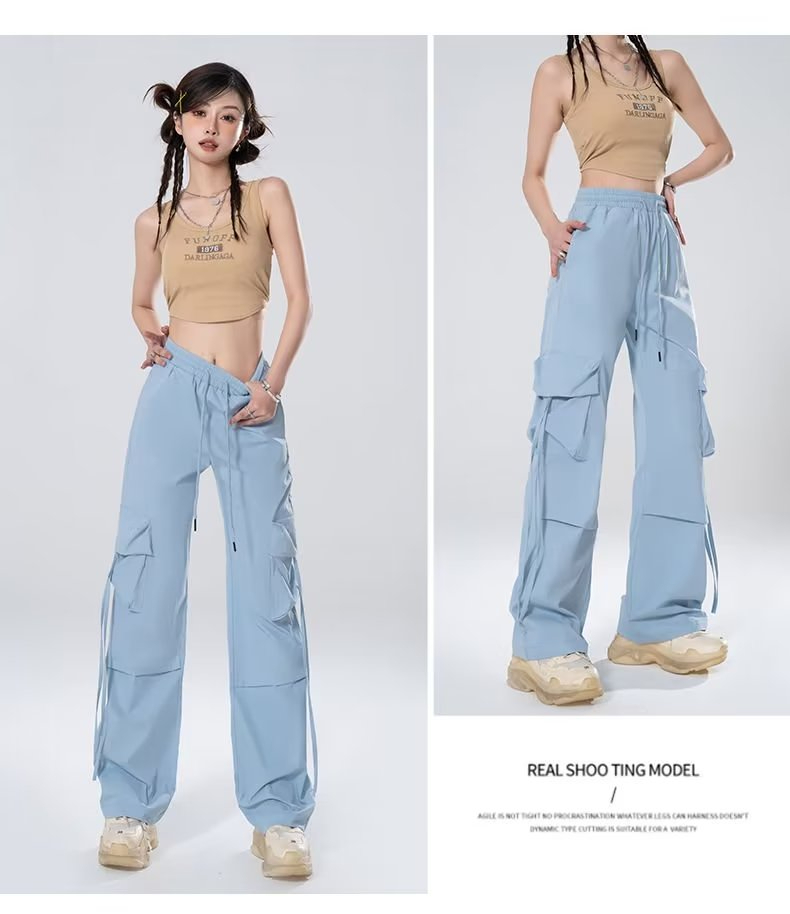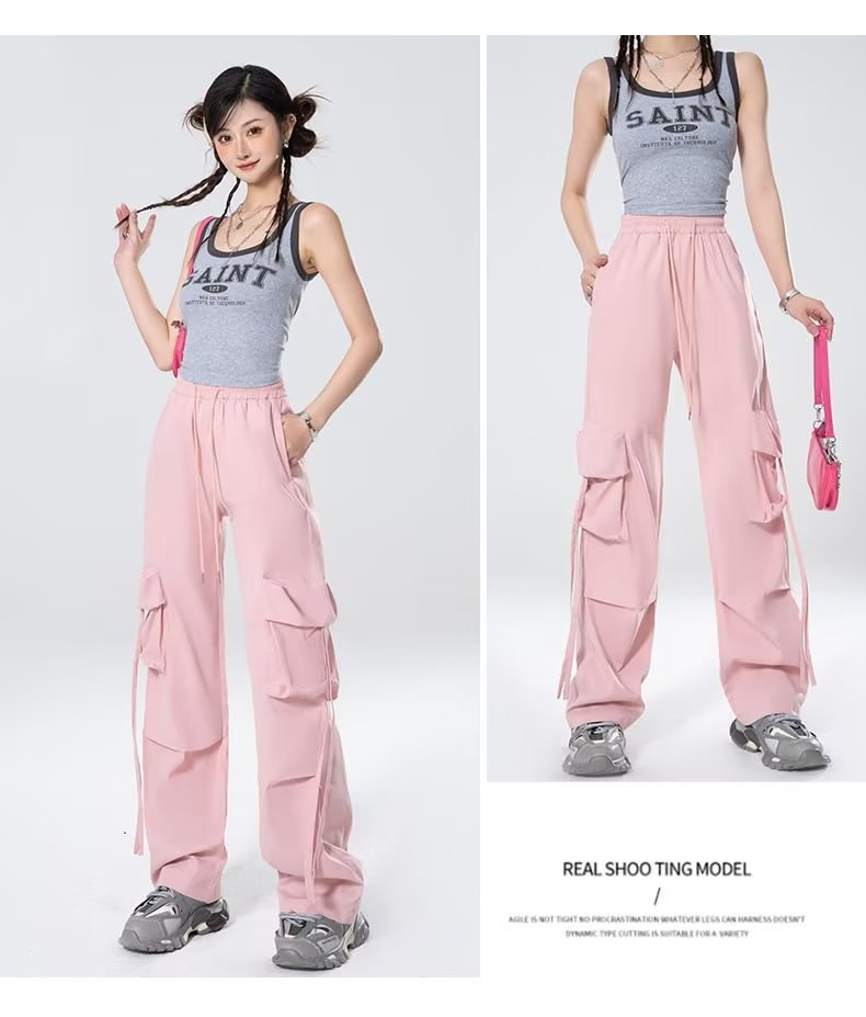官图 春秋美式工装裤女夏季薄款阔腿高腰直筒垂感长裤休闲运动裤