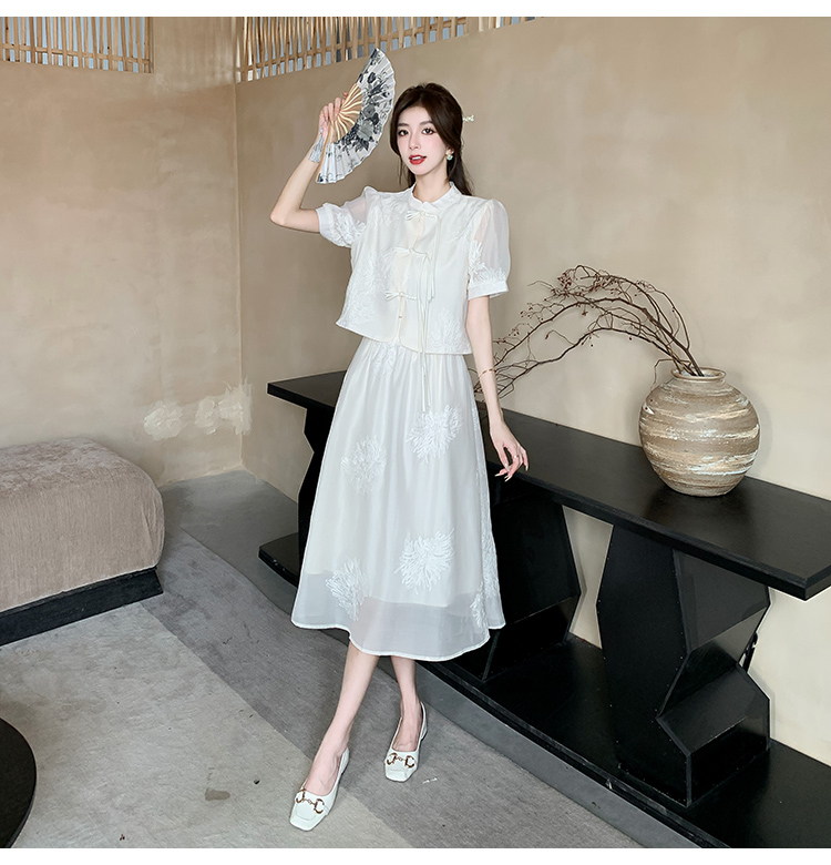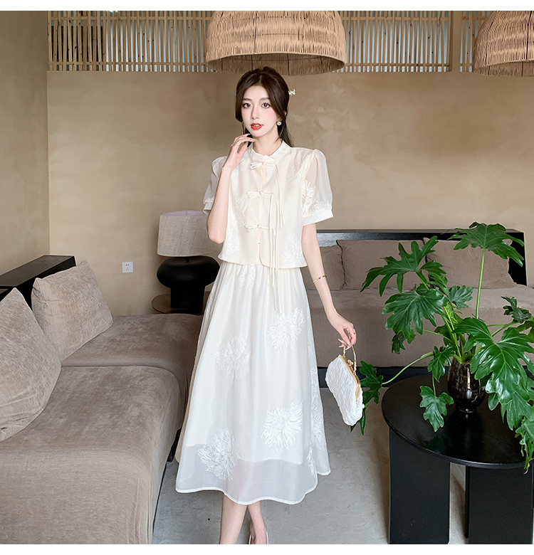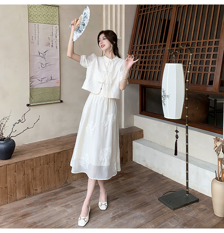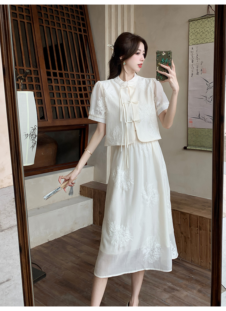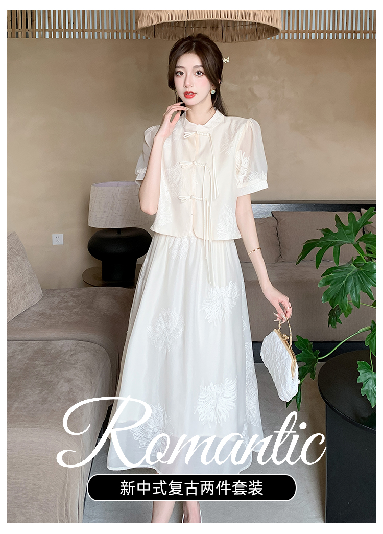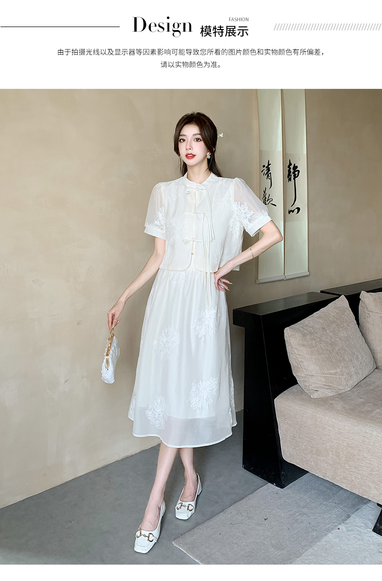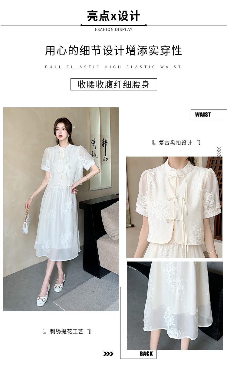 实拍新中式提花盘扣短袖2024新款夏季高腰A字半身裙两件套