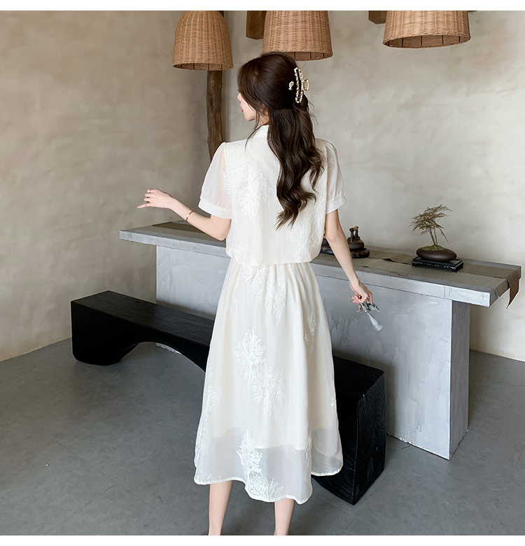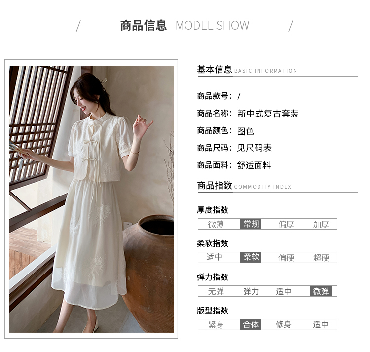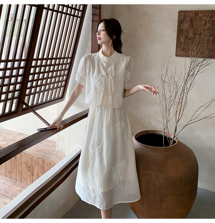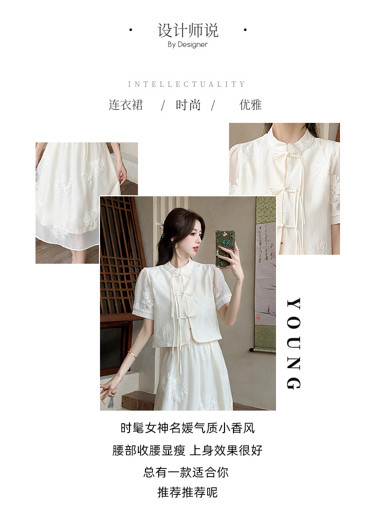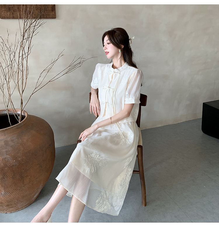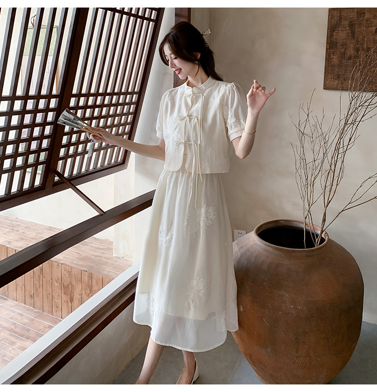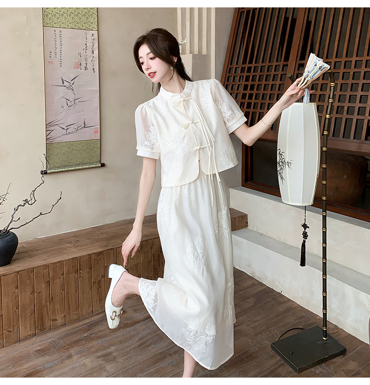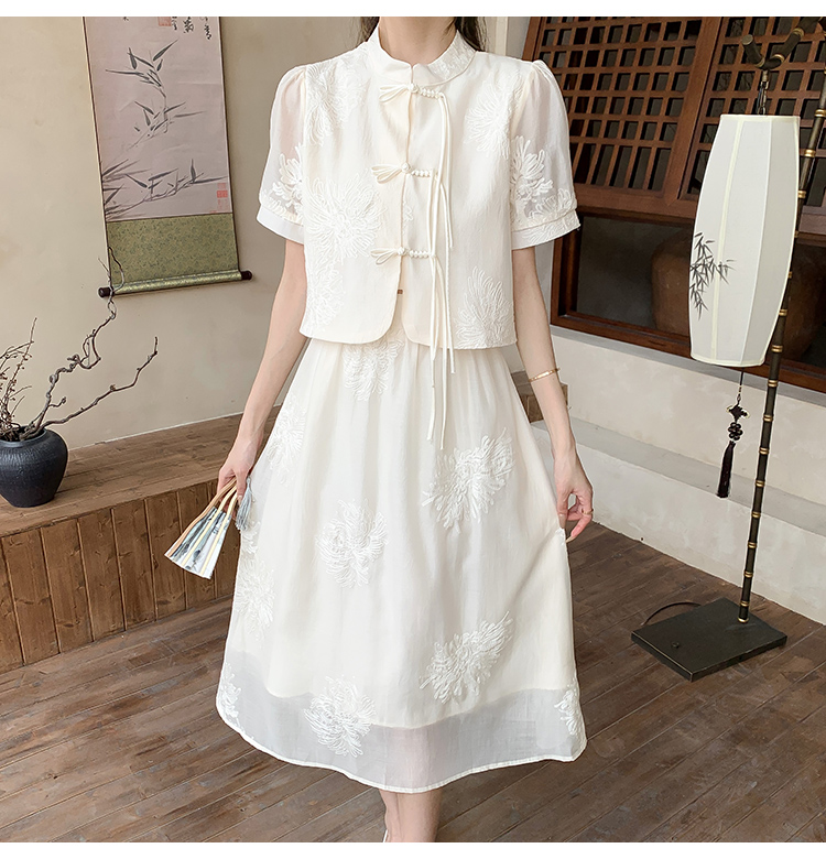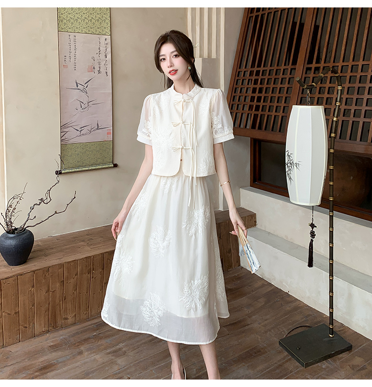实拍新中式提花盘扣短袖2024新款夏季高腰A字半身裙两件套