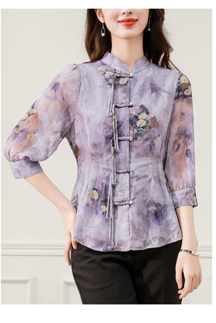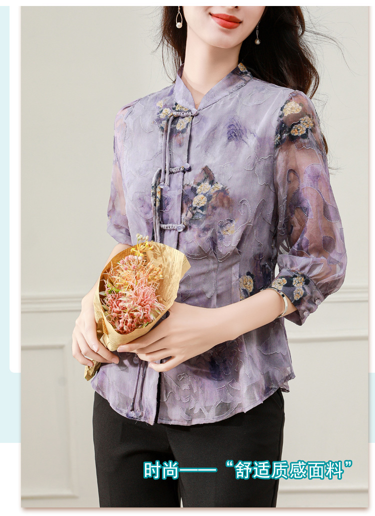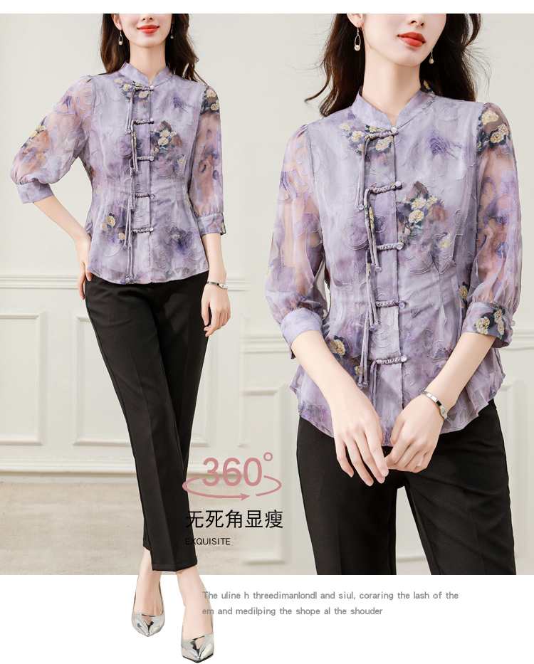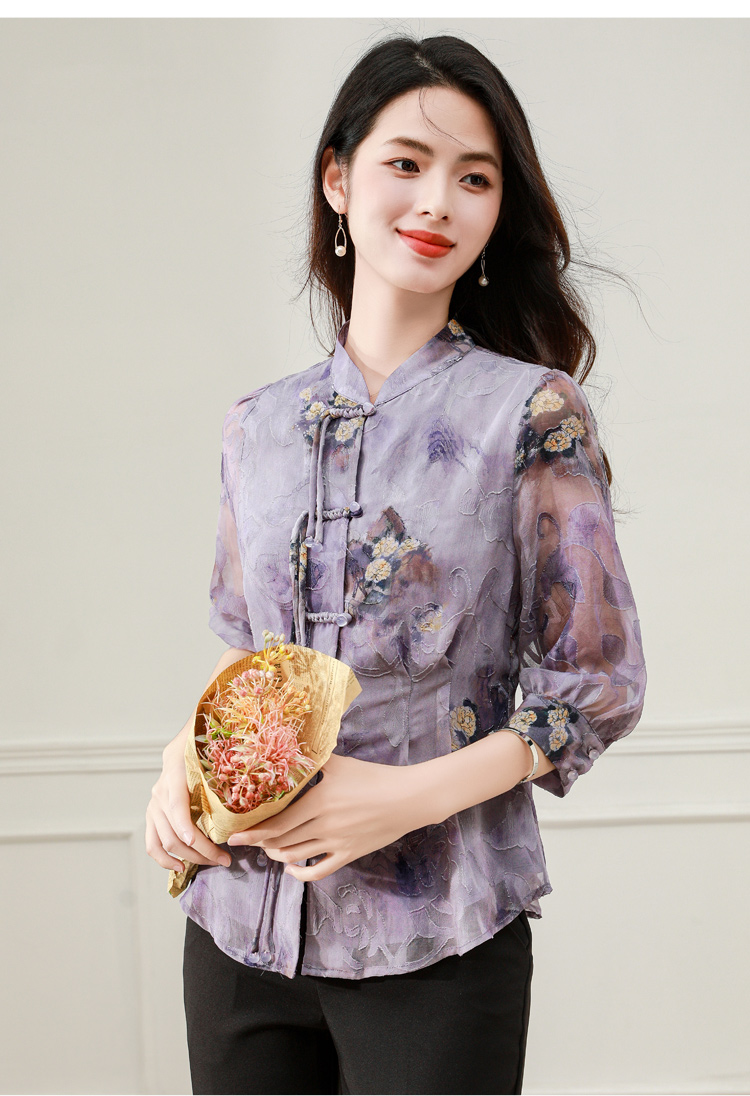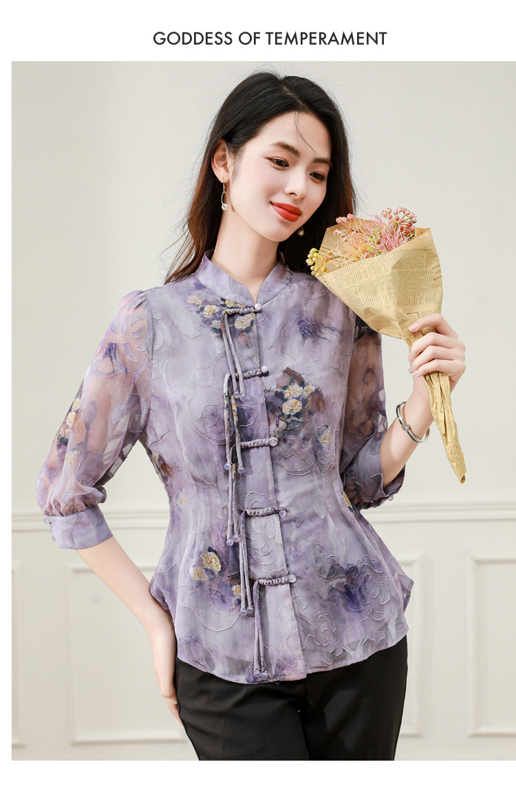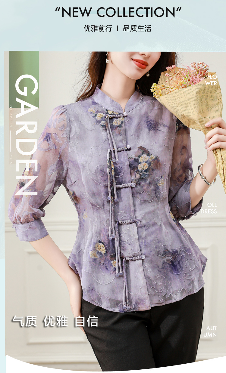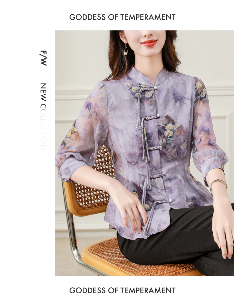 Real shot Chinese retro chiffon shirt women's improved tops Chinese style stand-up collar buttoned floral shirt 2024 summer light