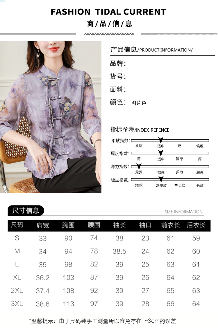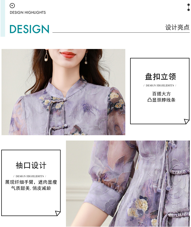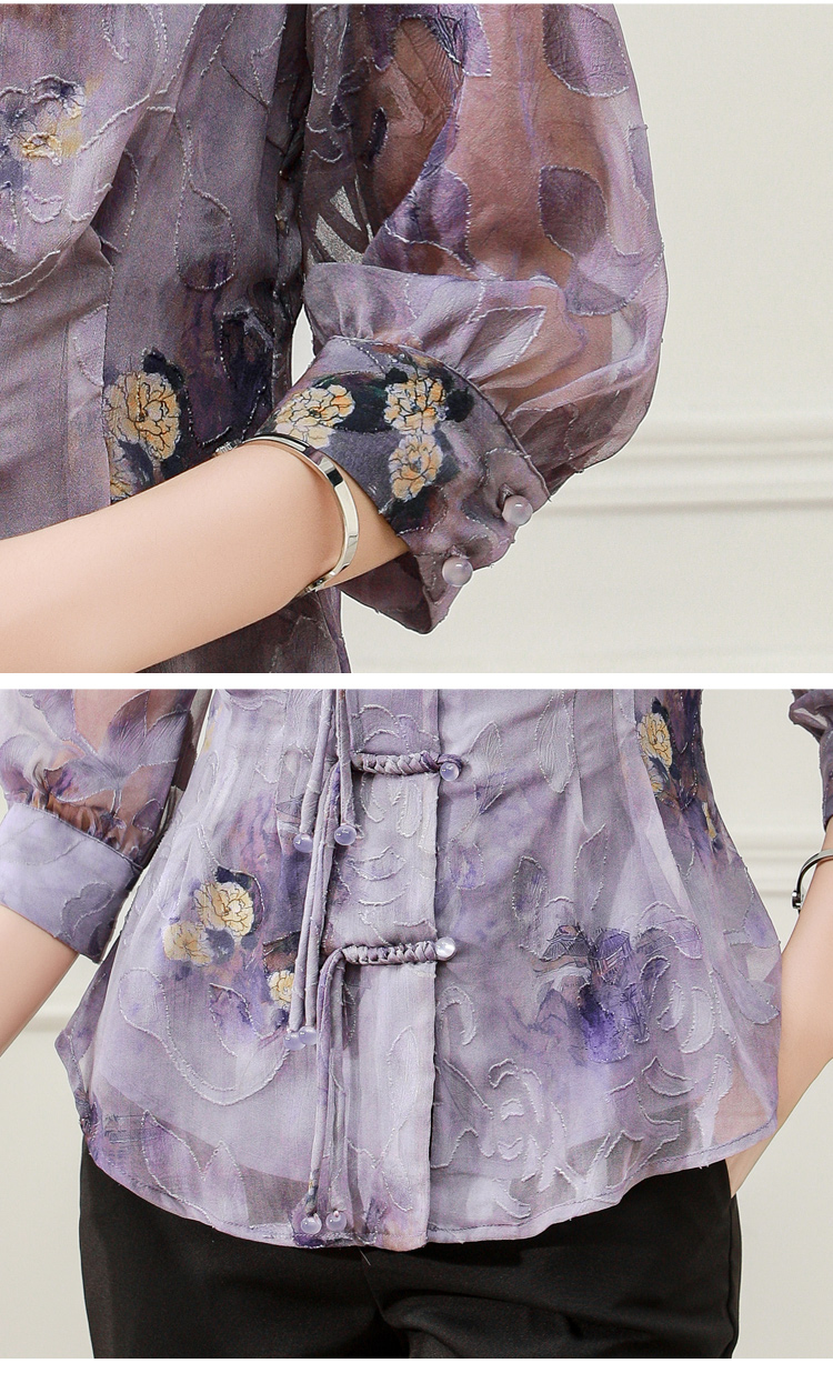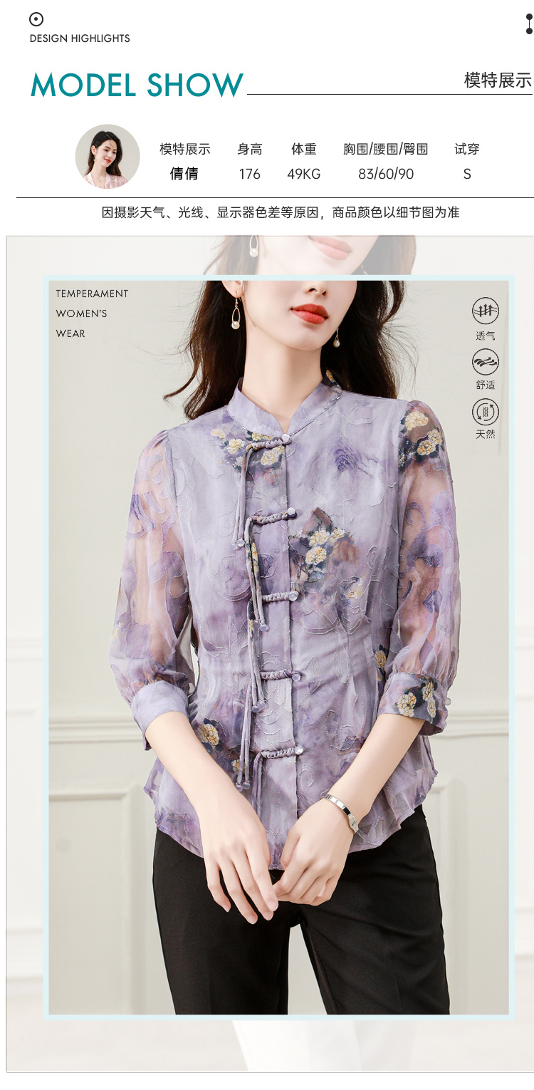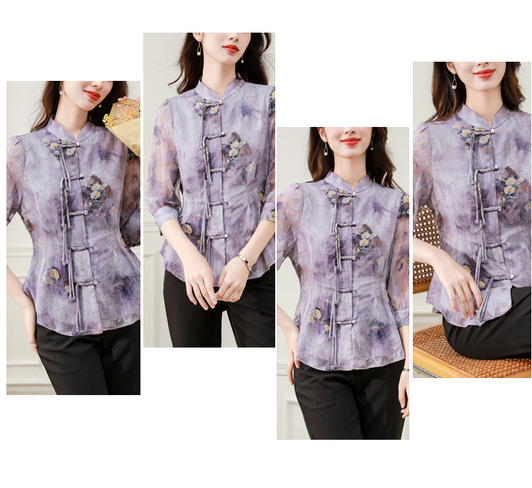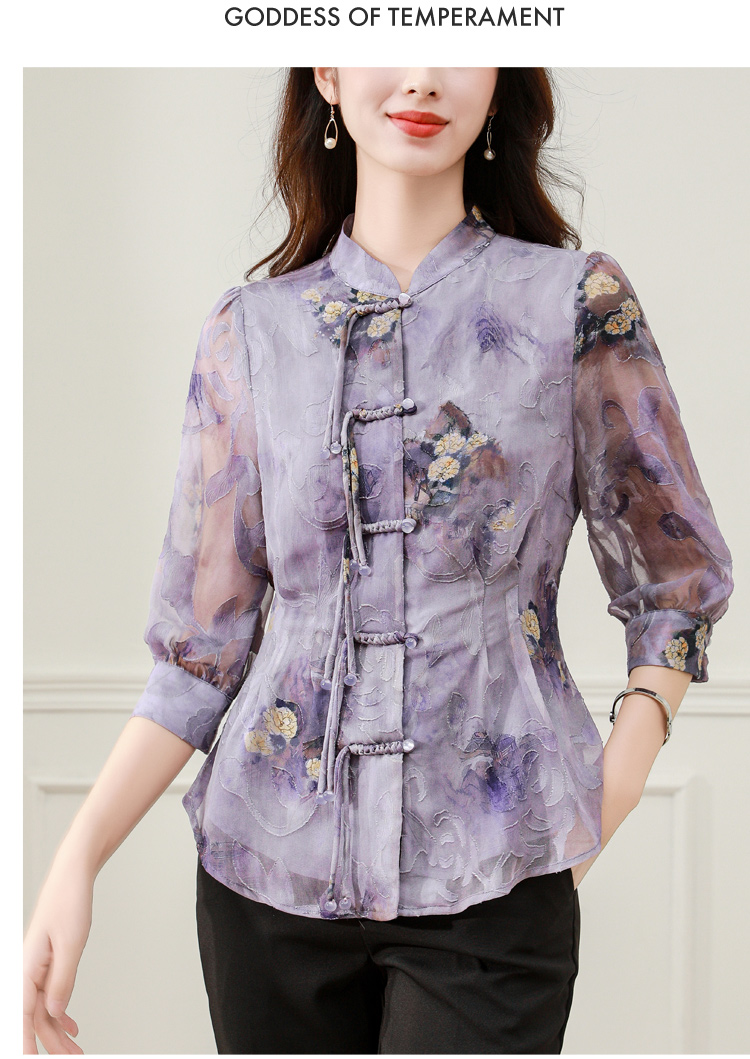 Real shot Chinese retro chiffon shirt women's improved tops Chinese style stand-up collar buttoned floral shirt 2024 summer light