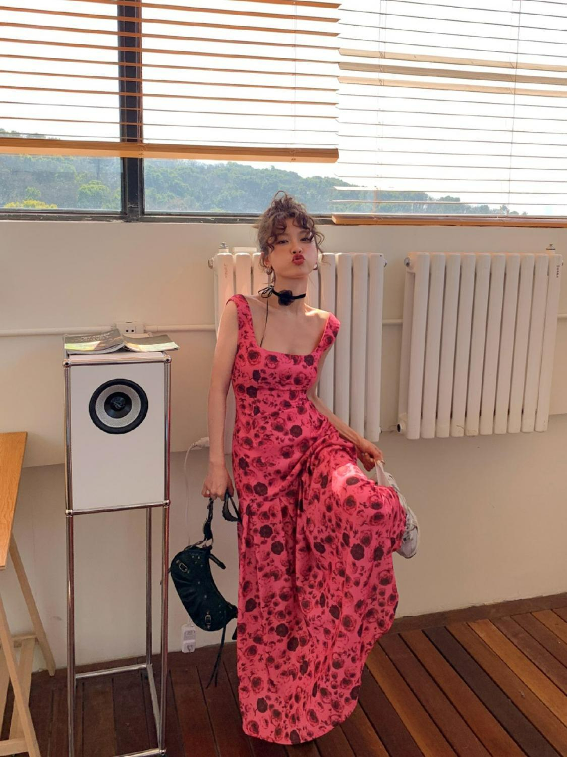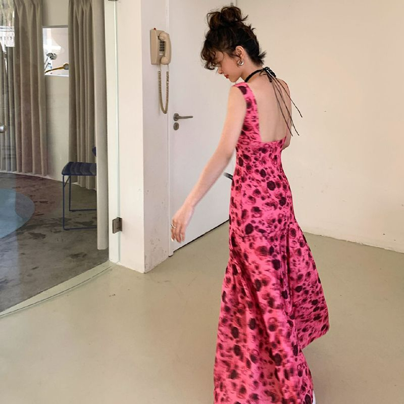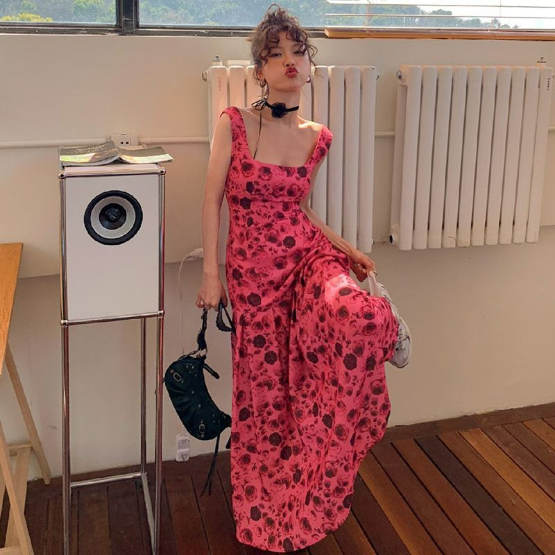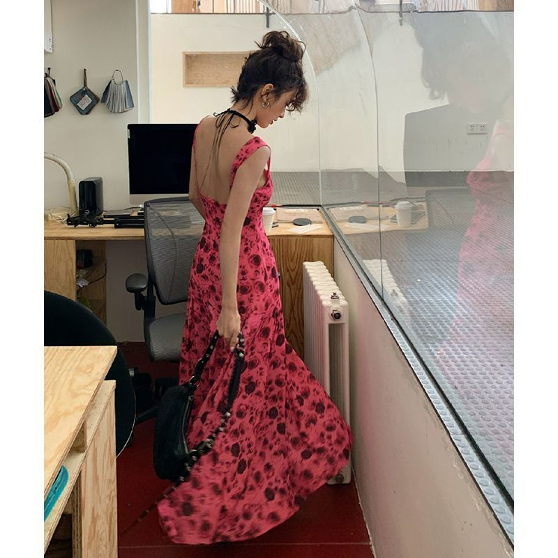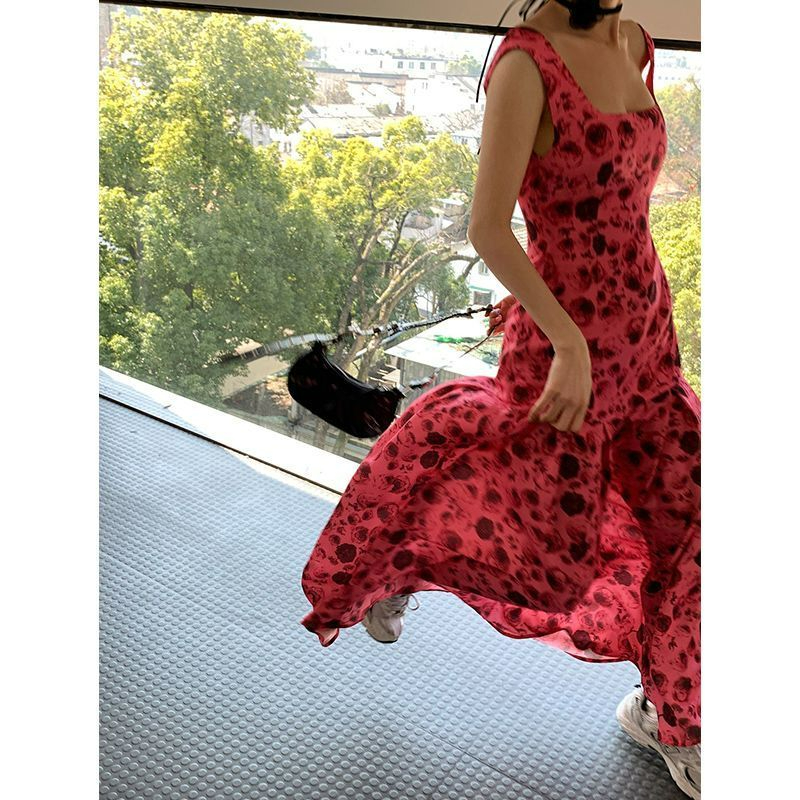 方领露背雪纺连衣裙女2023高腰显瘦碎花长裙到脚踝西双版纳度假裙