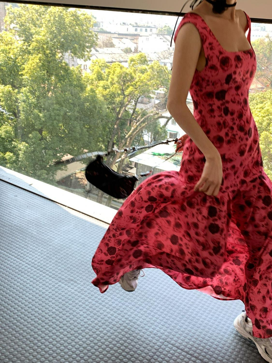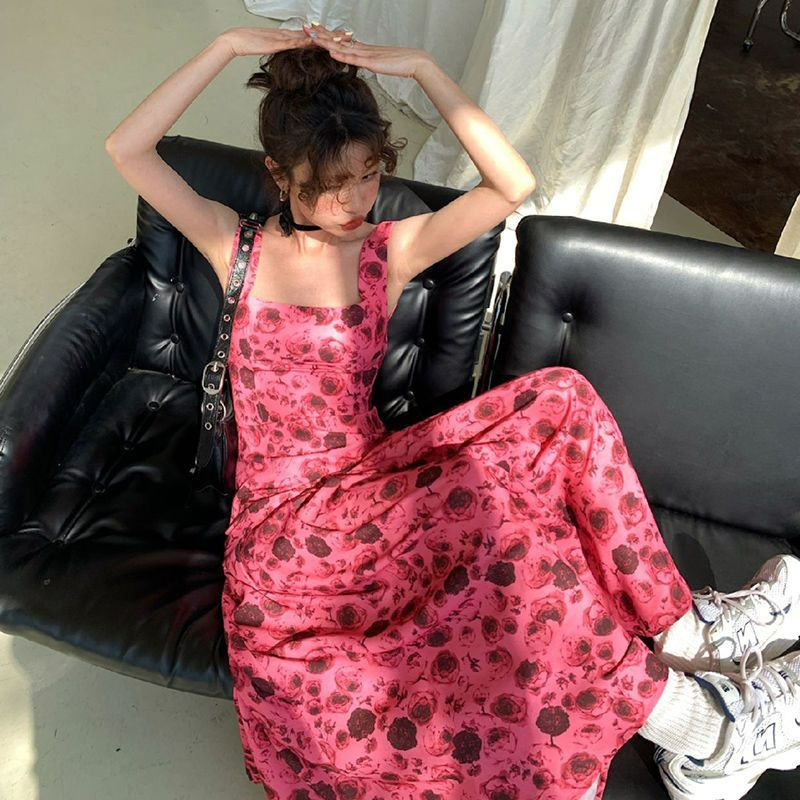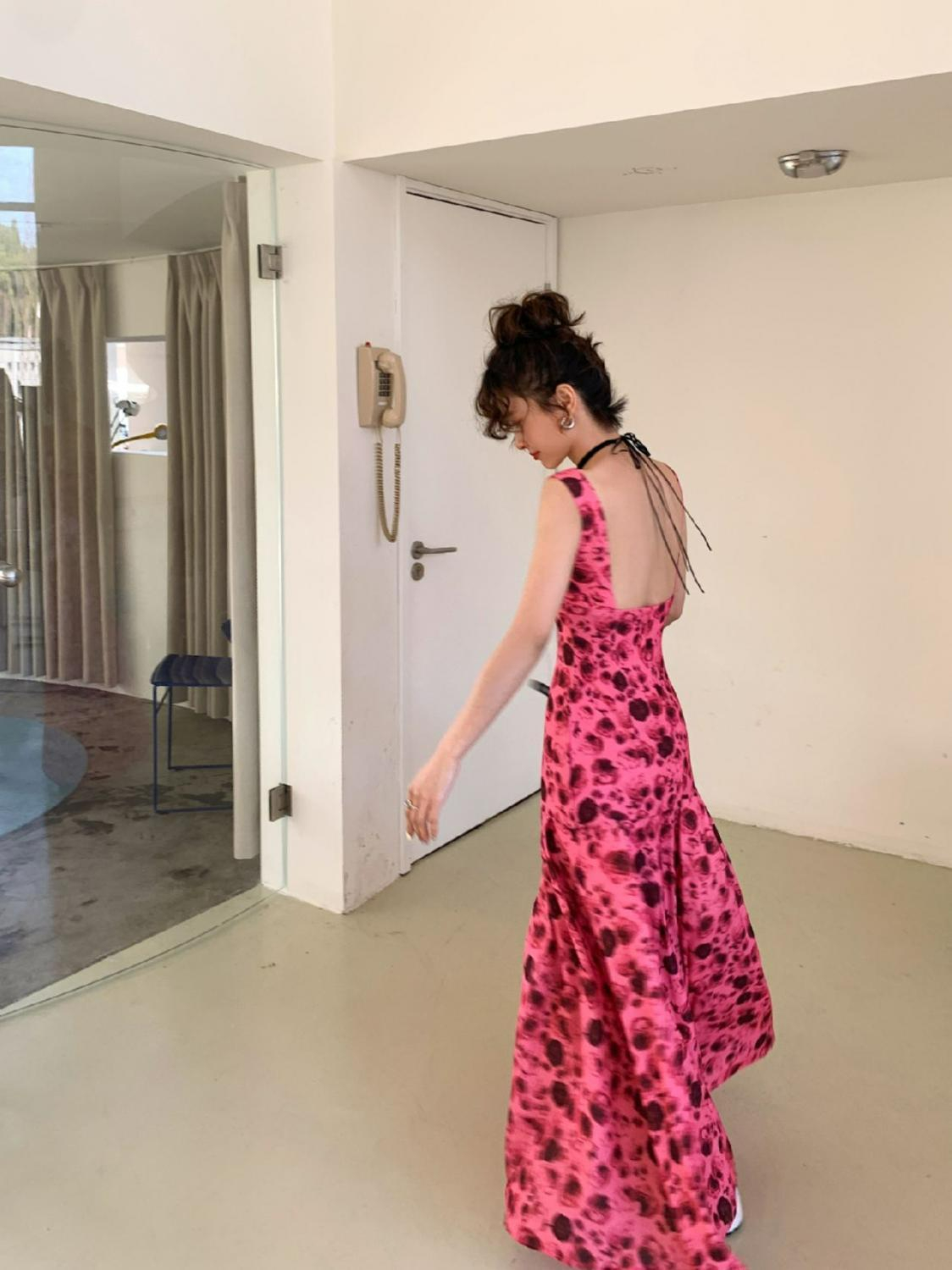 方领露背雪纺连衣裙女2023高腰显瘦碎花长裙到脚踝西双版纳度假裙