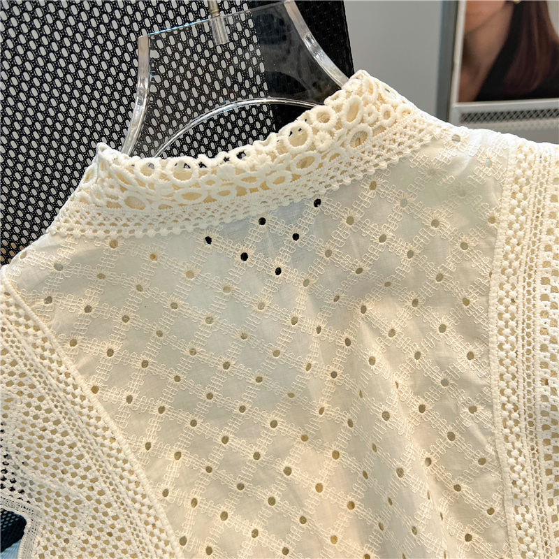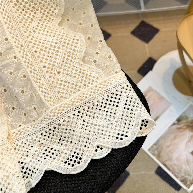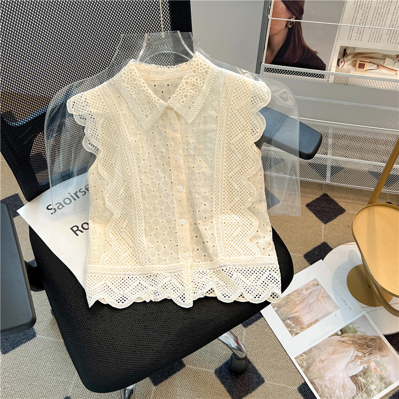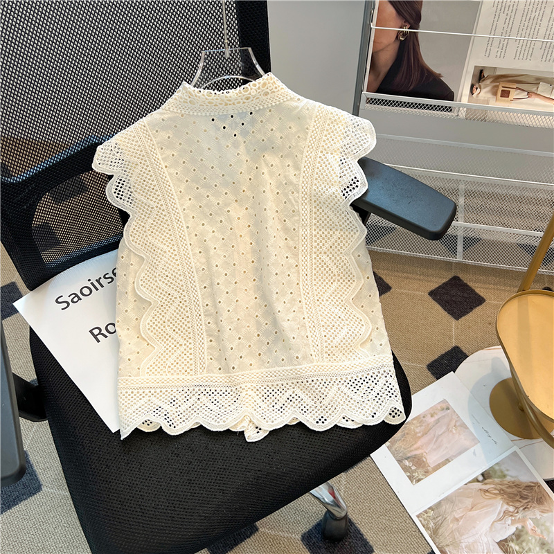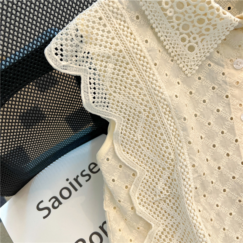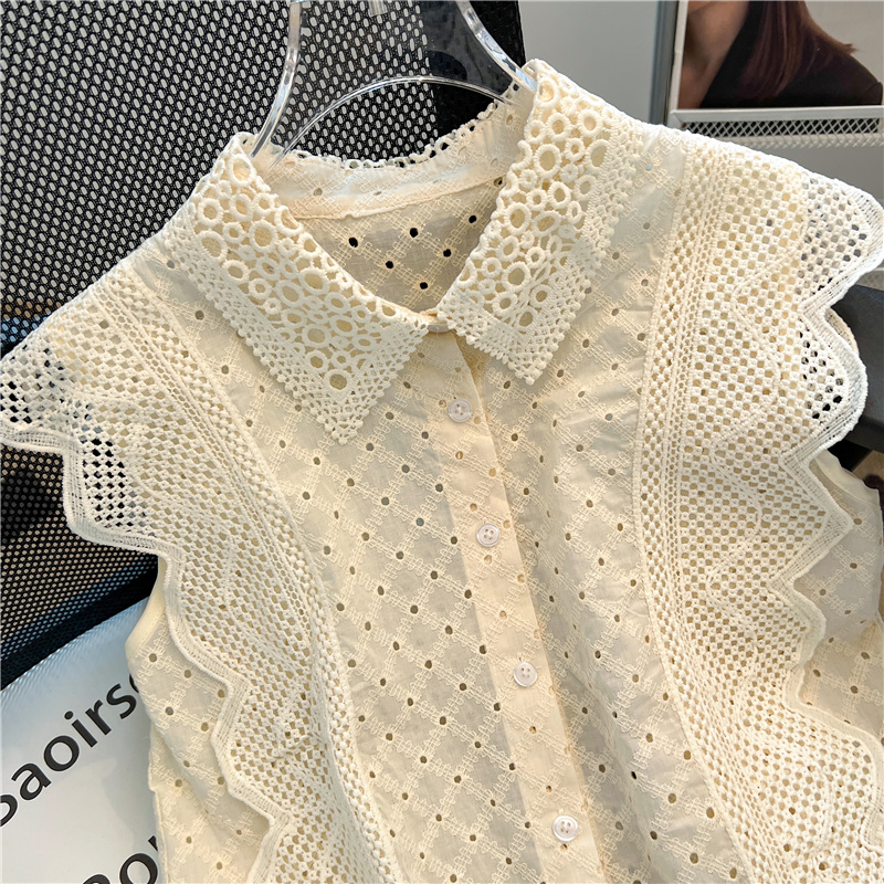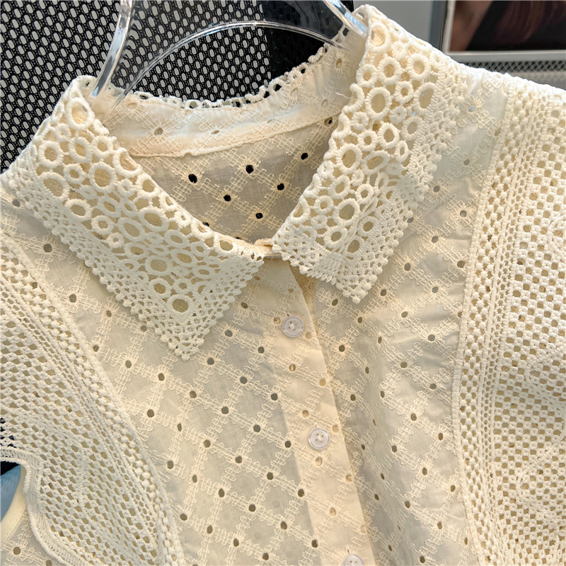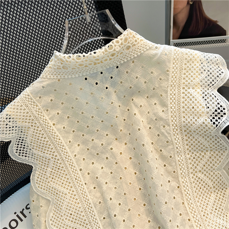实拍~蕾丝镂空翻领钩花飞飞袖甜美衬衫女2024新款洋气小衫上衣潮