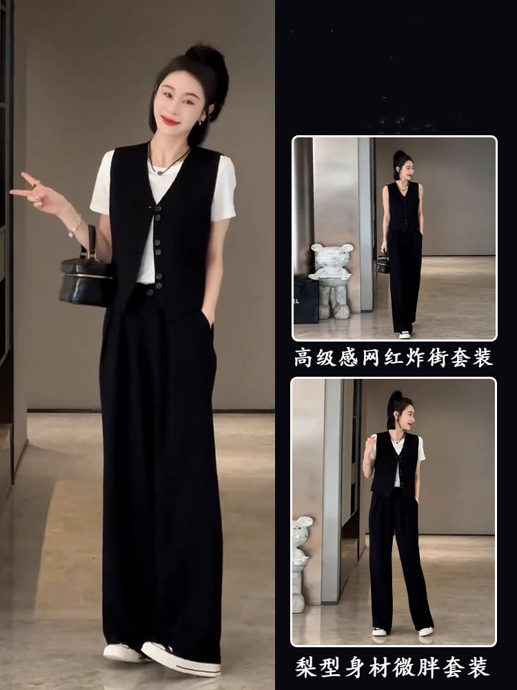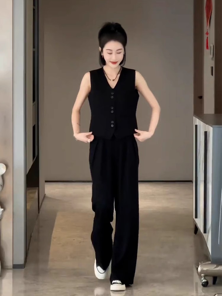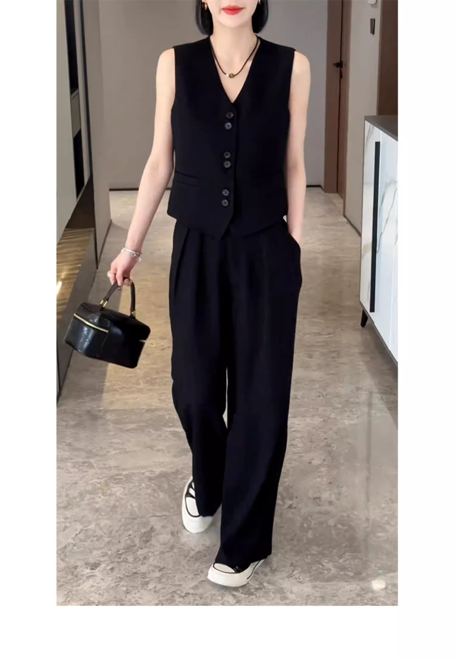 Salty light mature sister fan high-end light luxury age-reducing black vest two-piece suit pants female 2024 summer new
