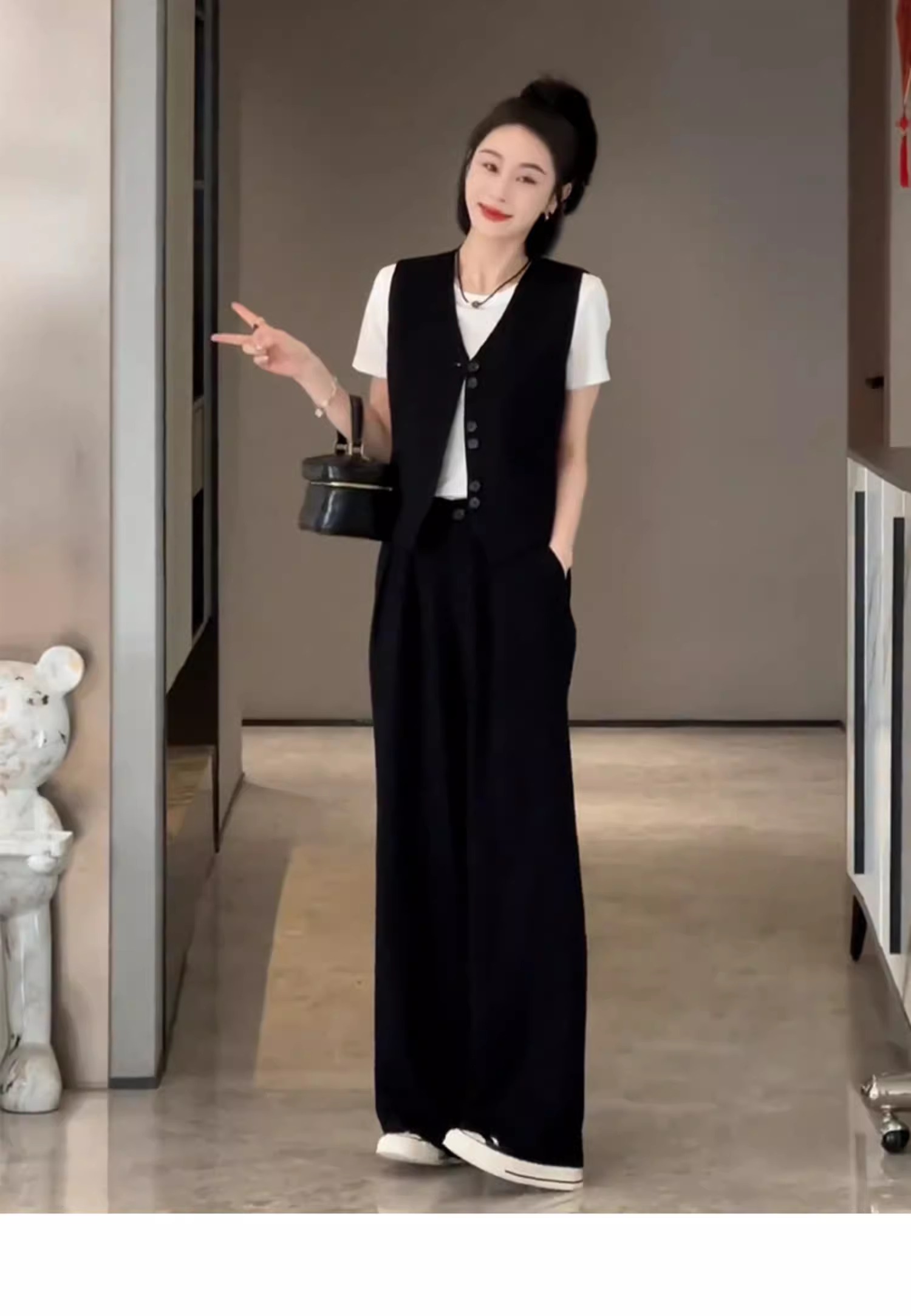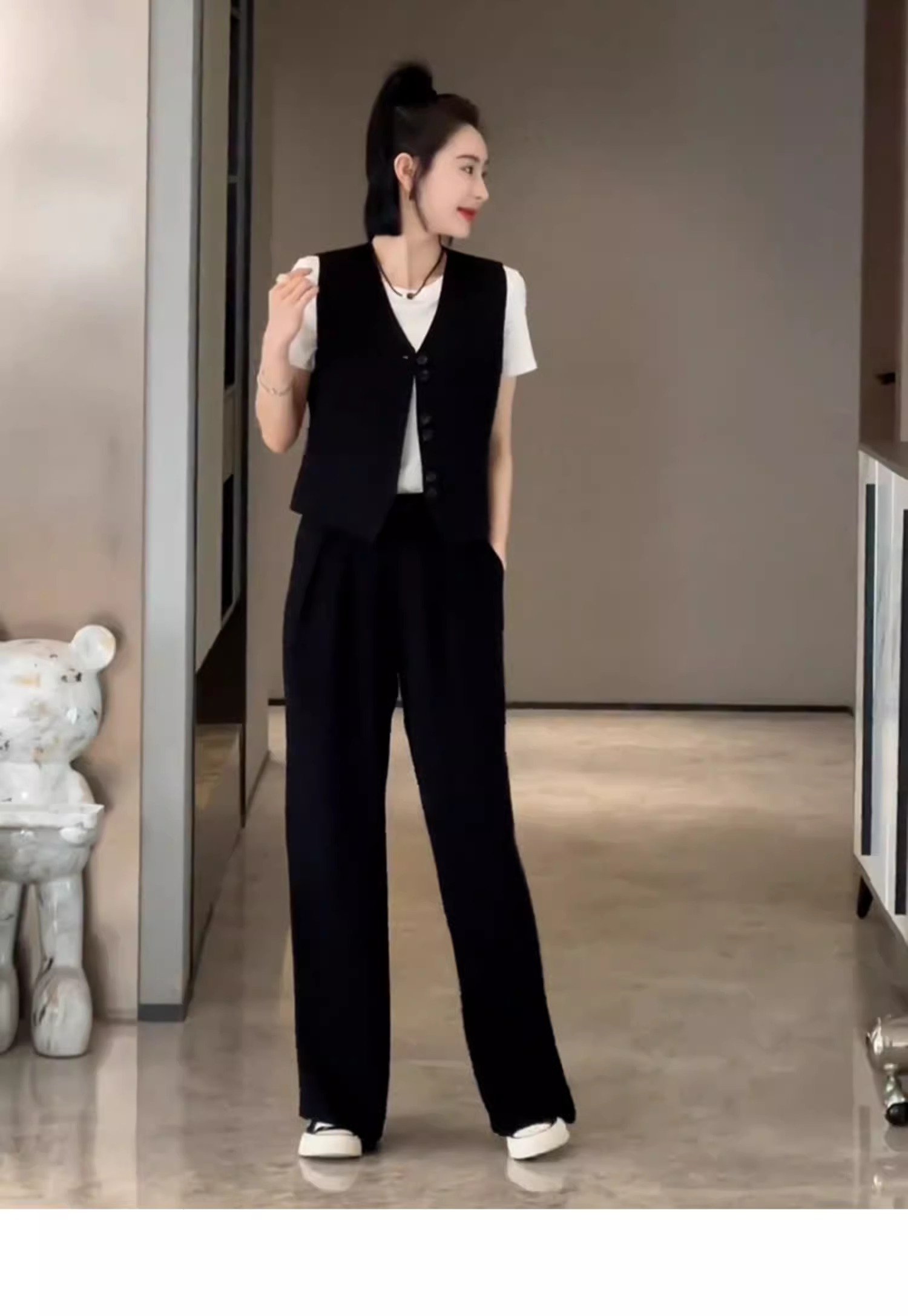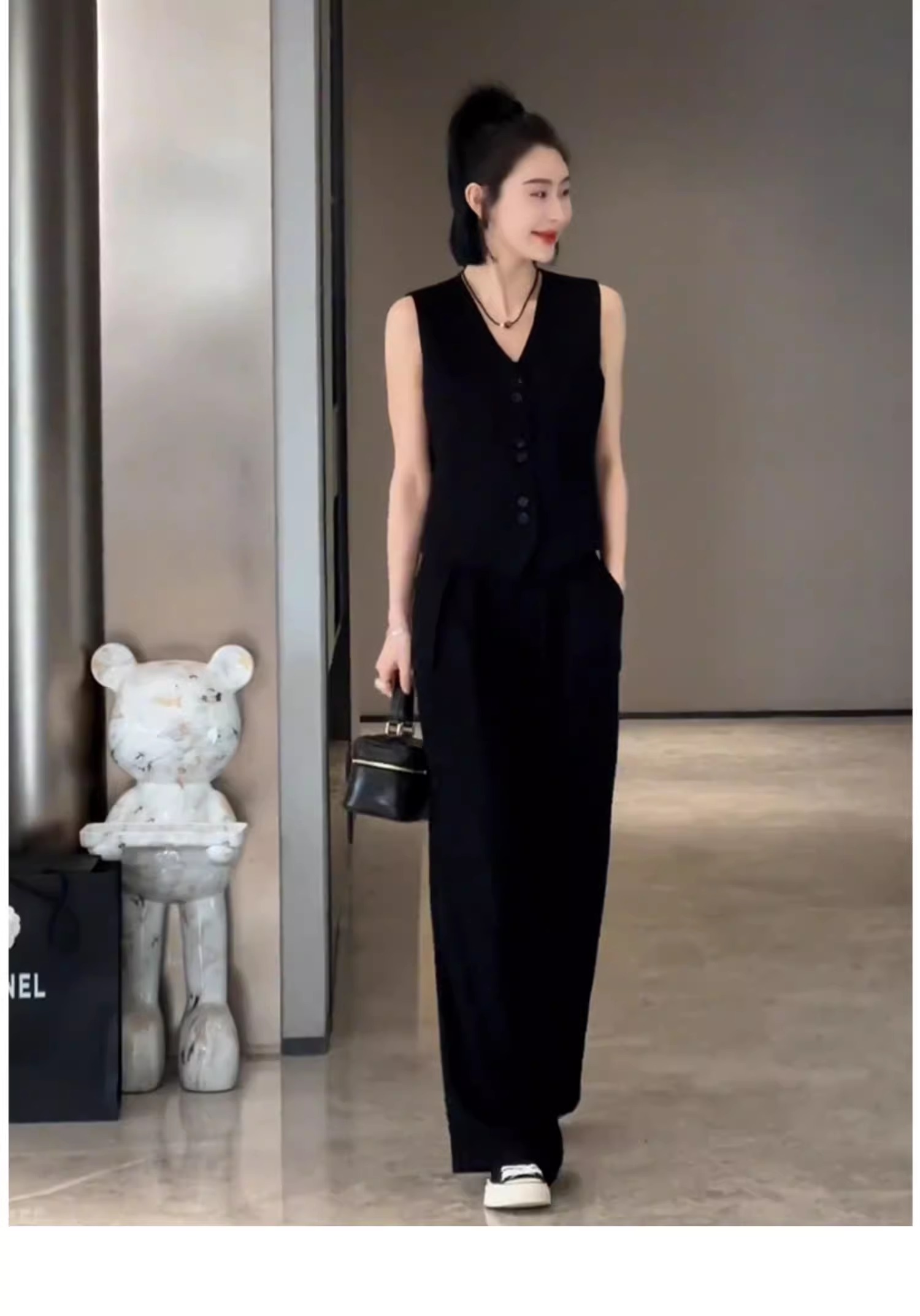Salty light mature sister fan high-end light luxury age-reducing black vest two-piece suit pants female 2024 summer new