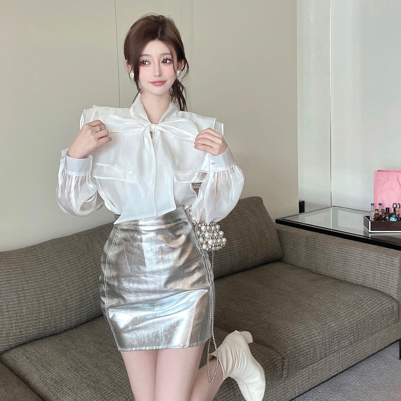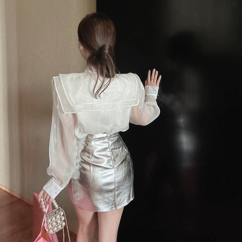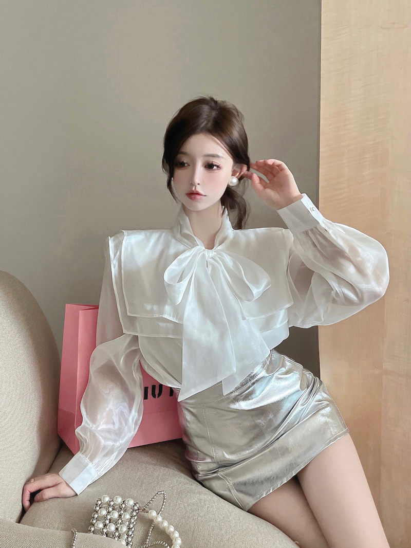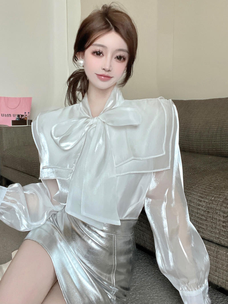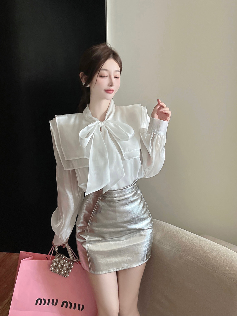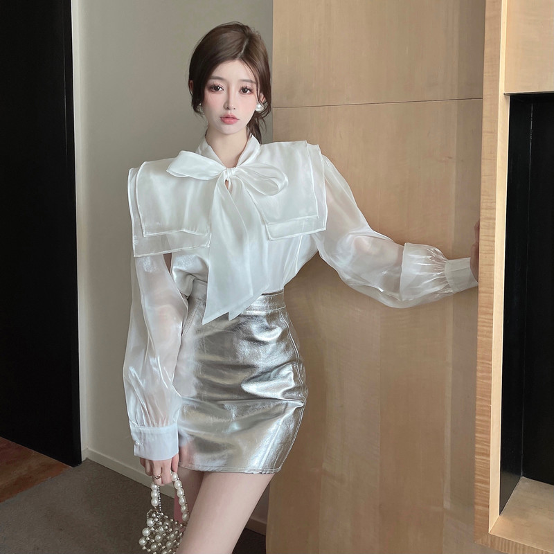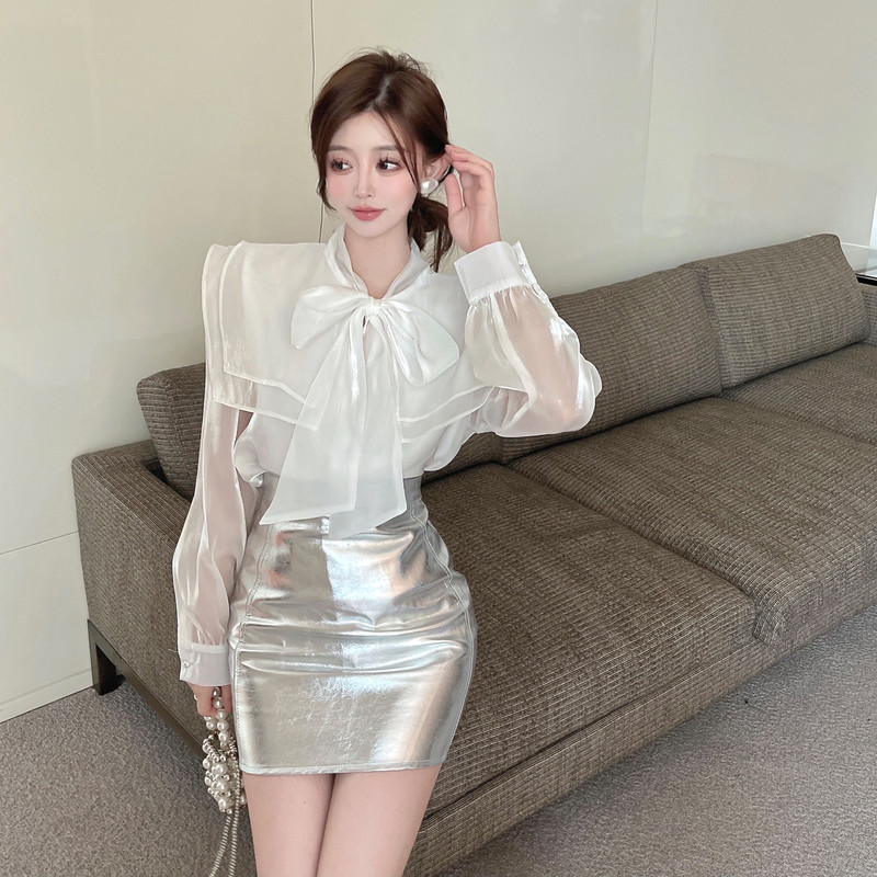 实拍超仙设计感小众洋气蝴蝶结双层娃娃领仙女衣+银色包臀半身裙