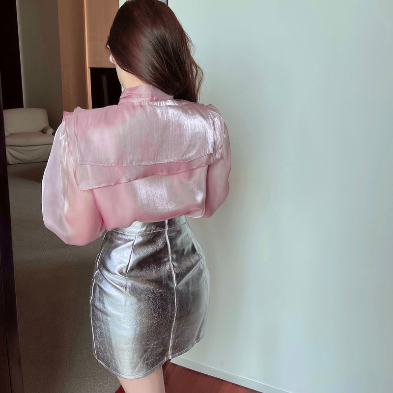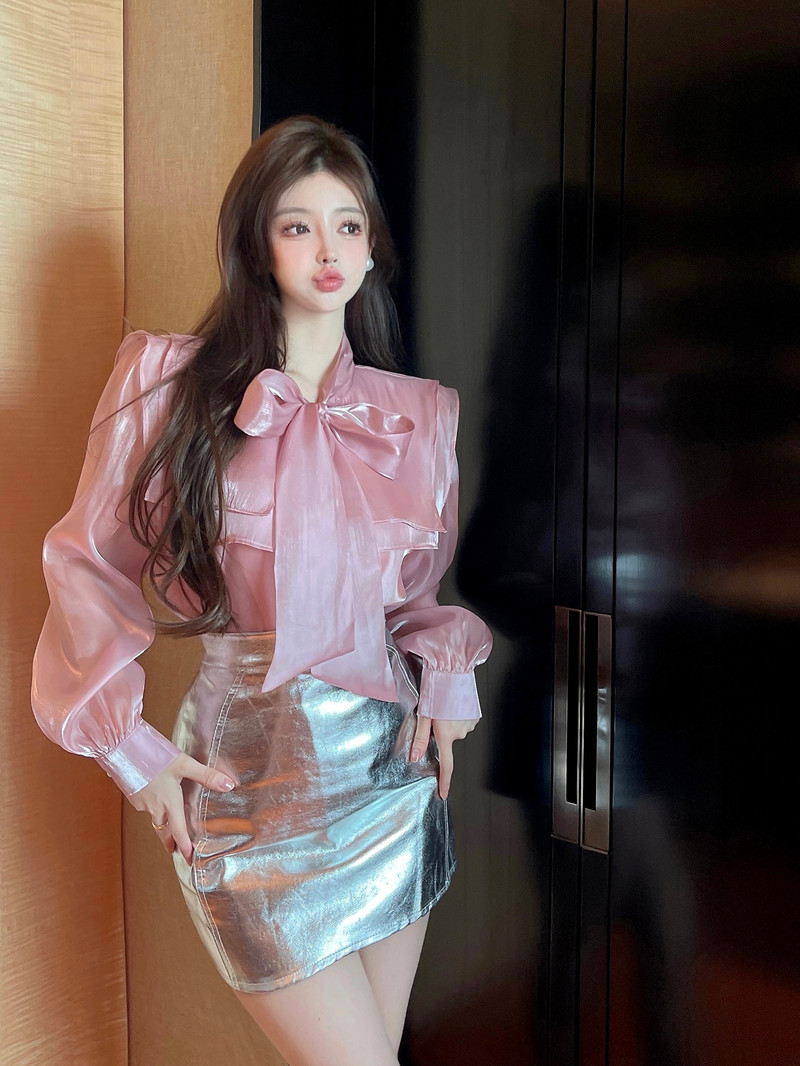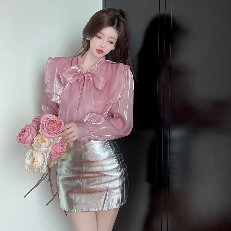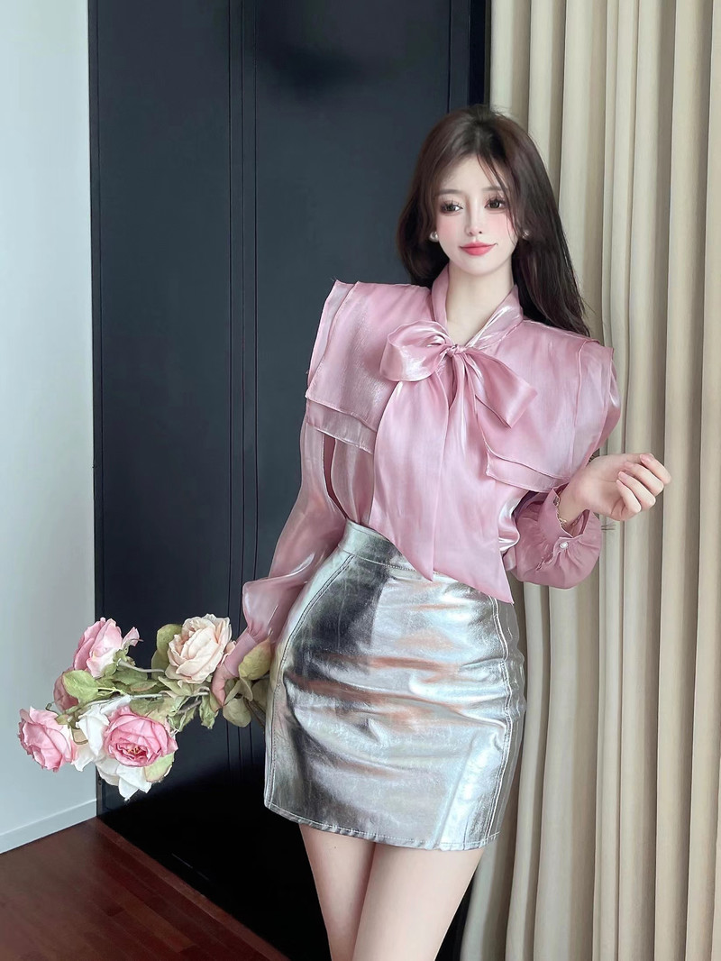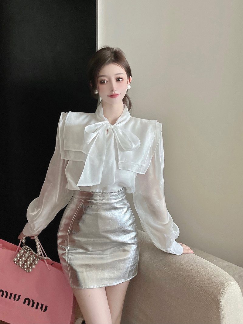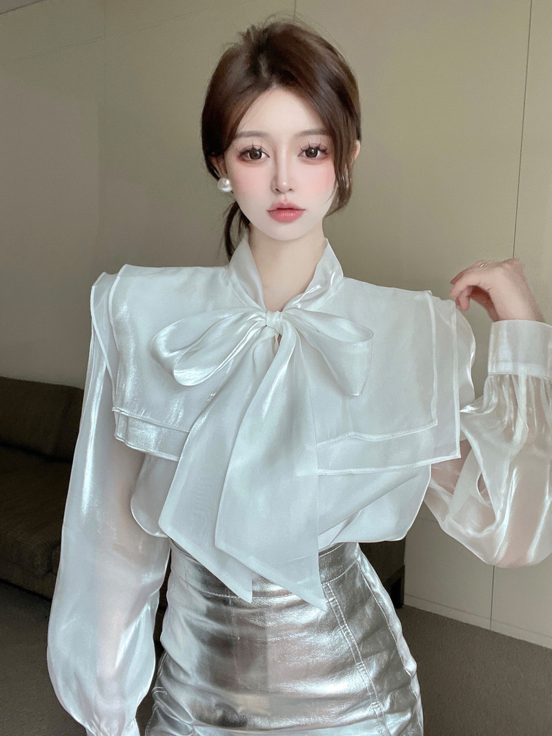 实拍超仙设计感小众洋气蝴蝶结双层娃娃领仙女衣+银色包臀半身裙