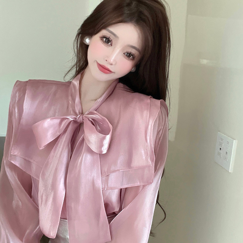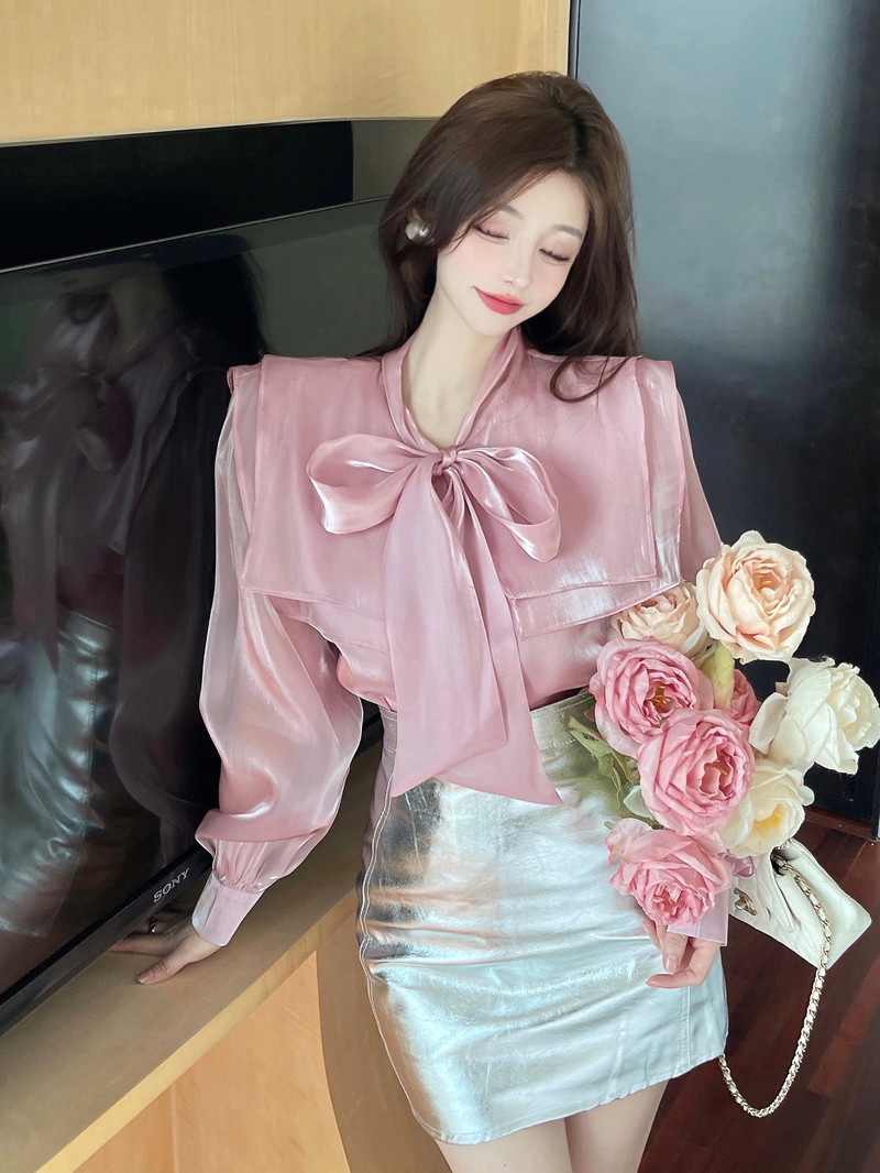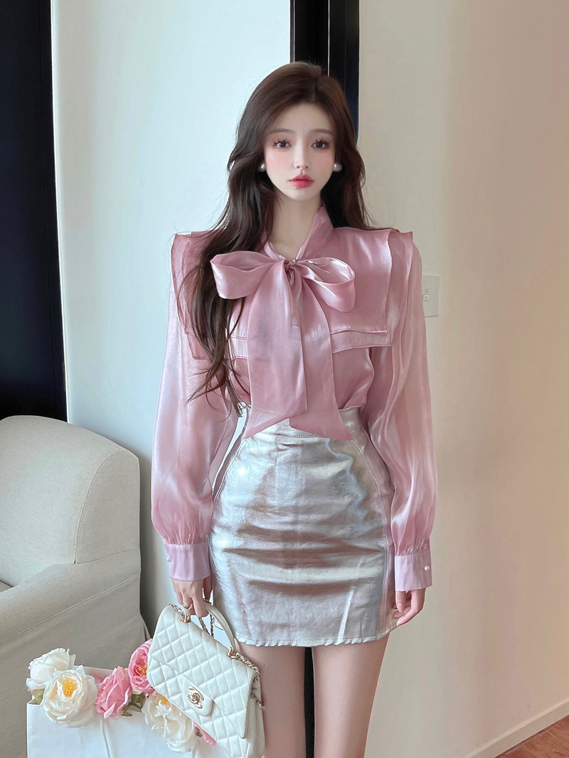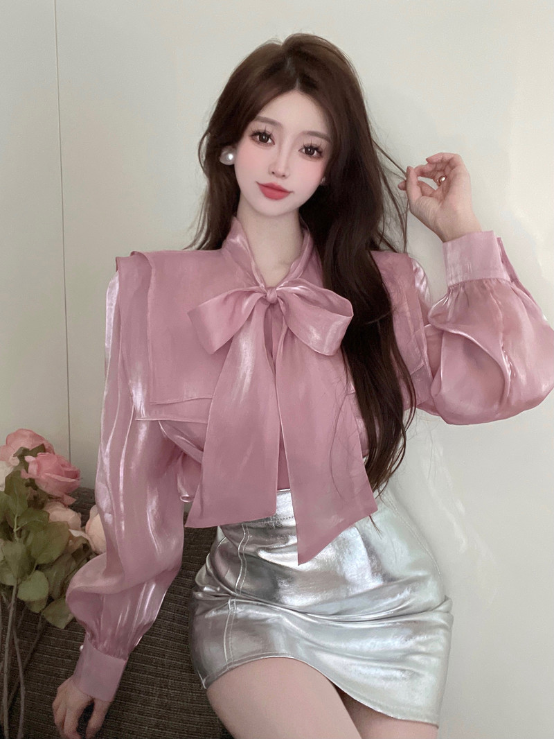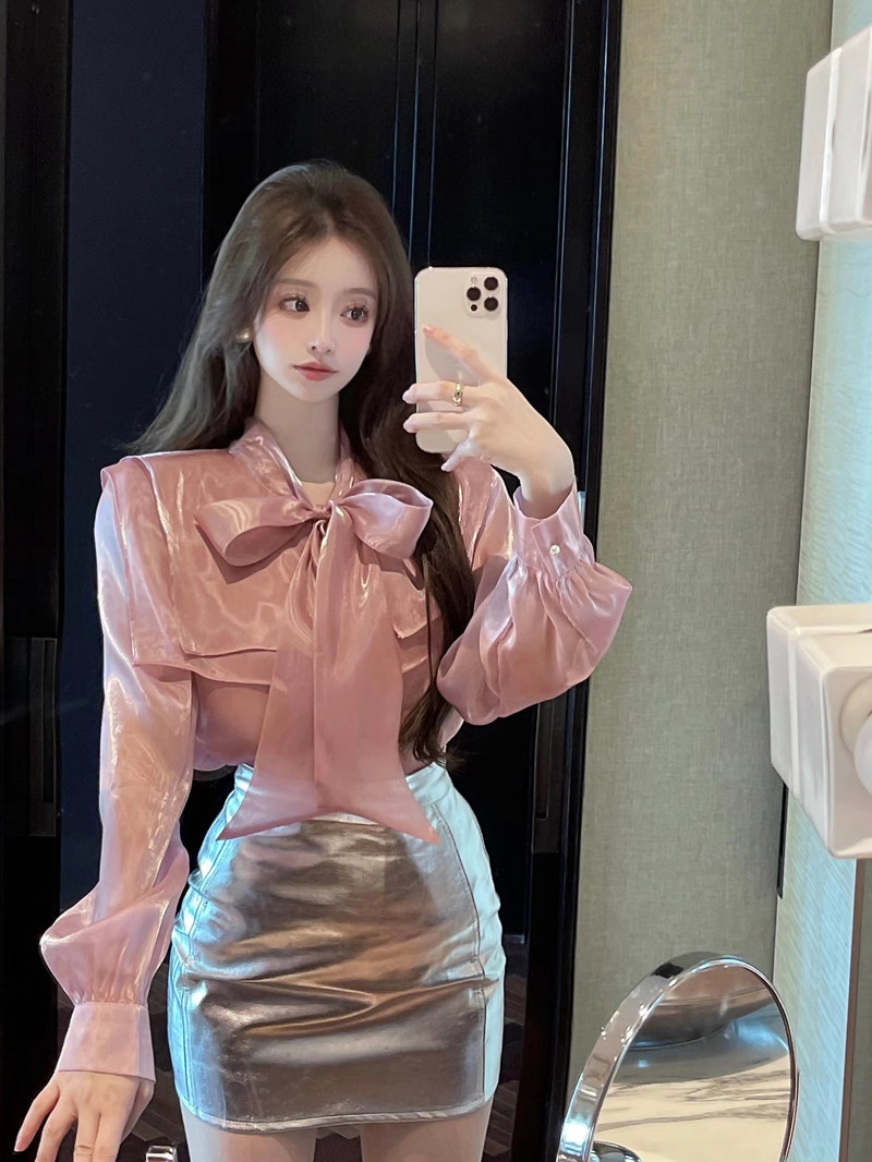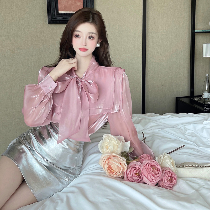 实拍超仙设计感小众洋气蝴蝶结双层娃娃领仙女衣+银色包臀半身裙