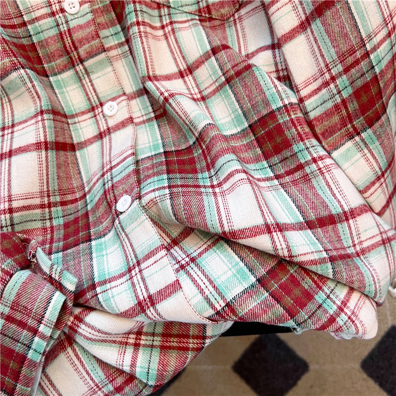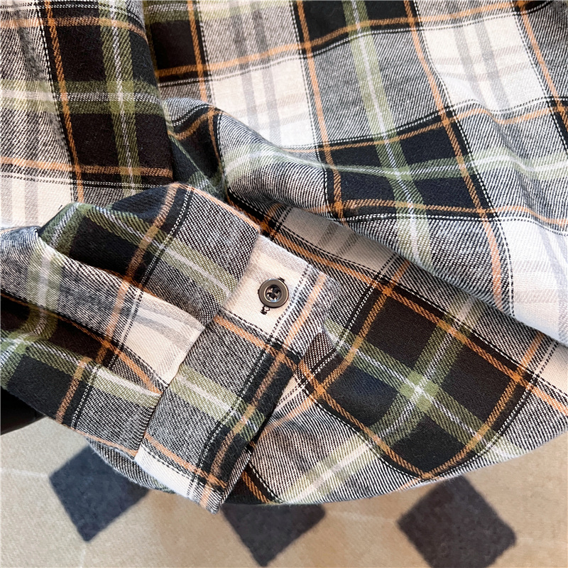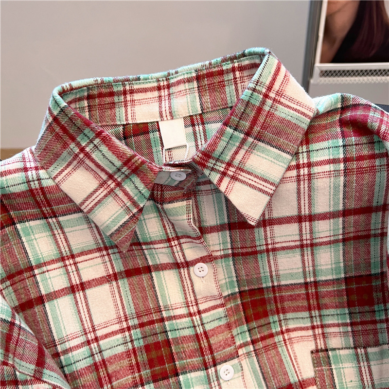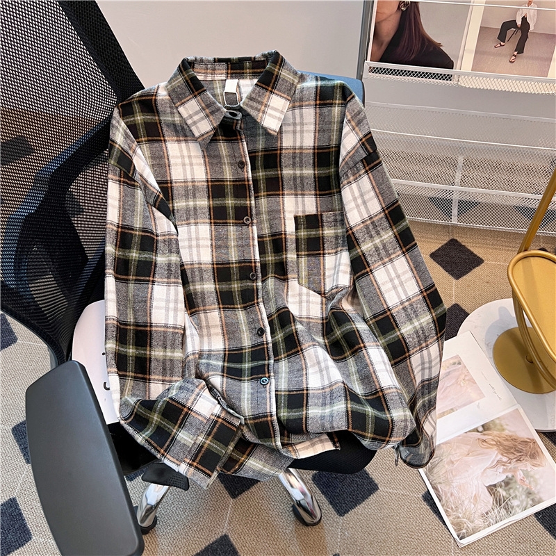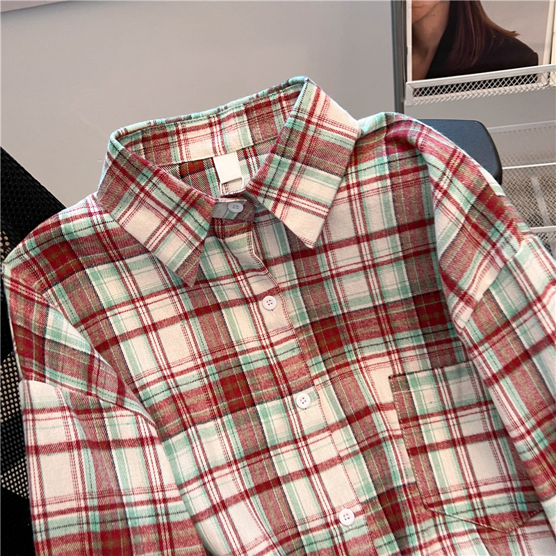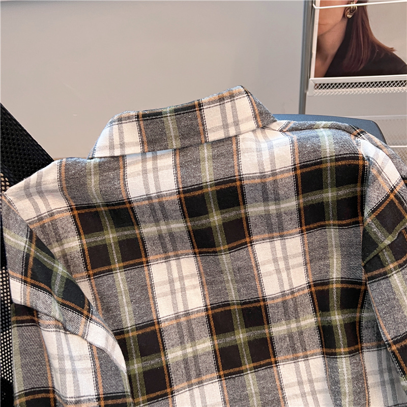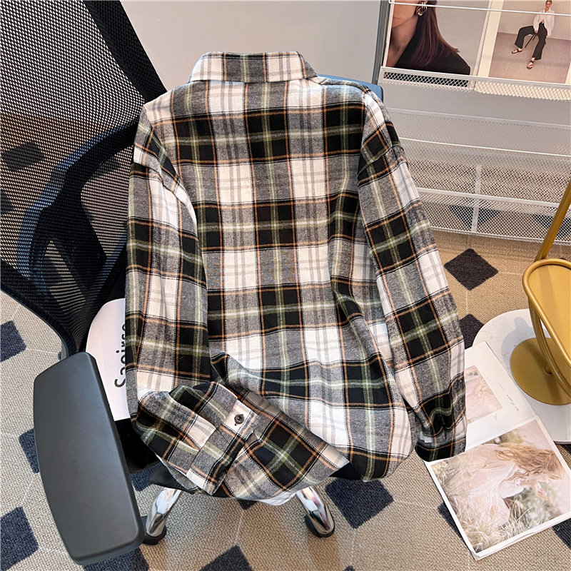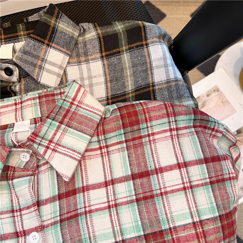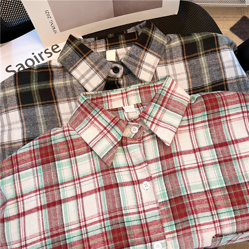 实拍~美式复古撞色格子长袖衬衫女春秋宽松学院风洋气百搭衬衣潮