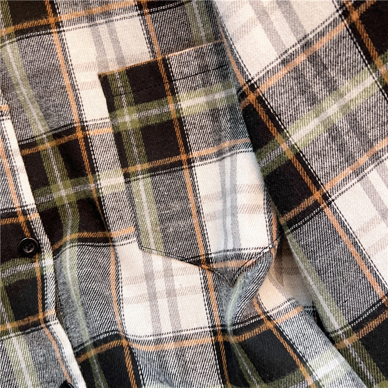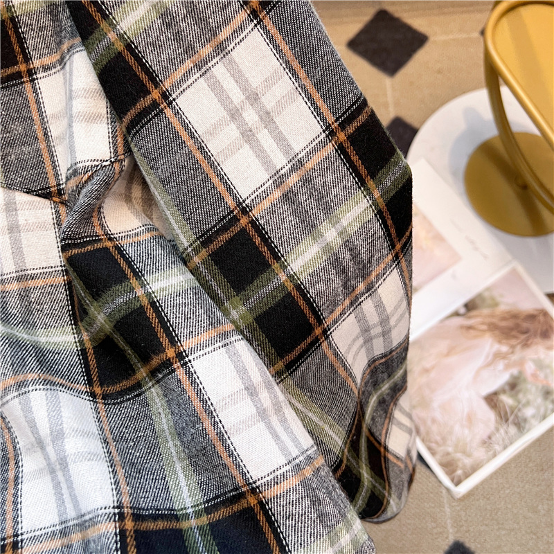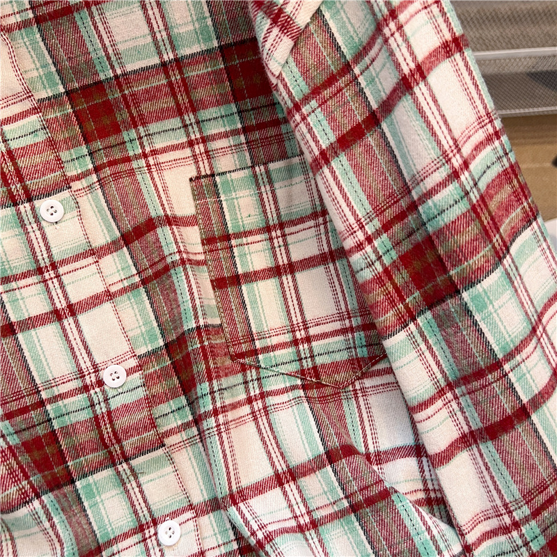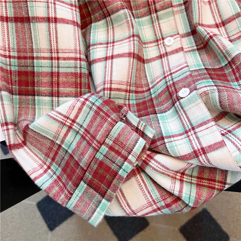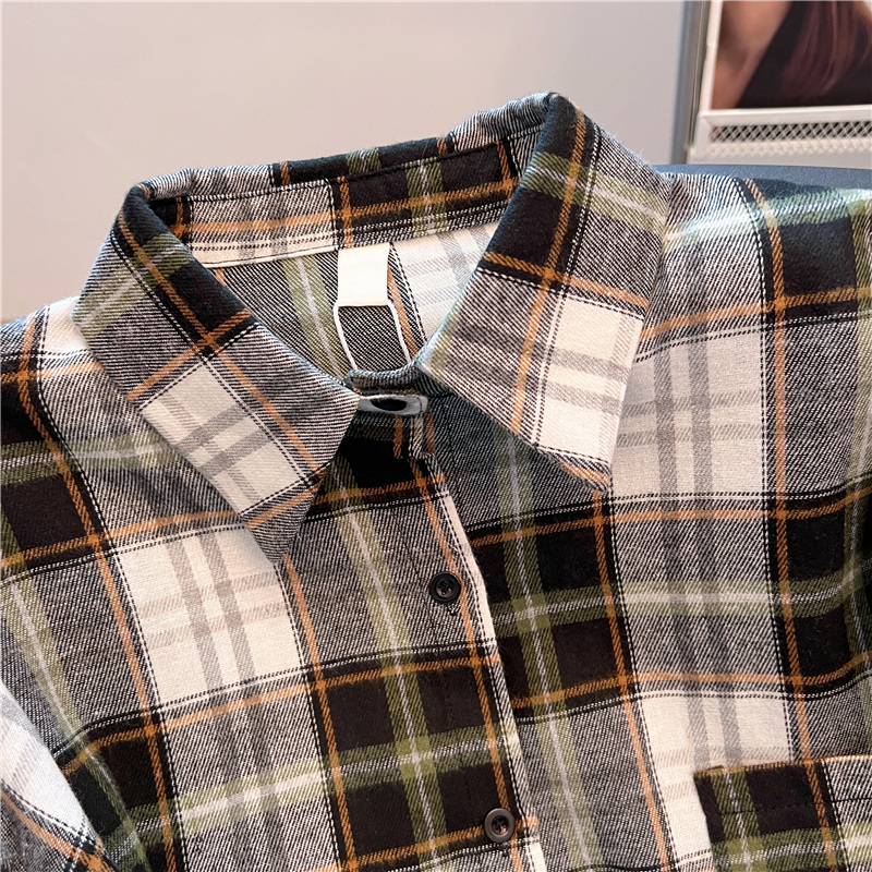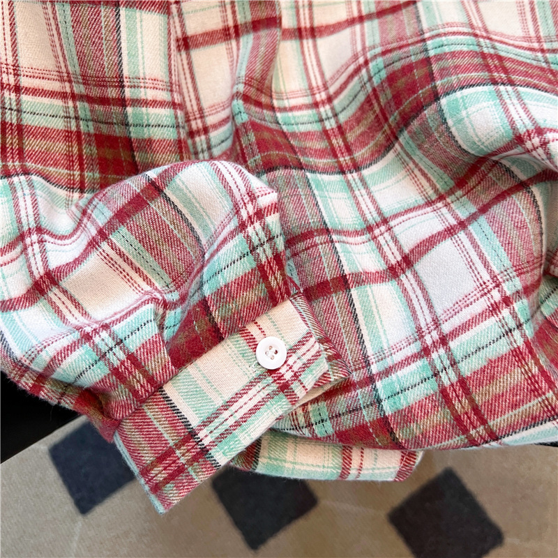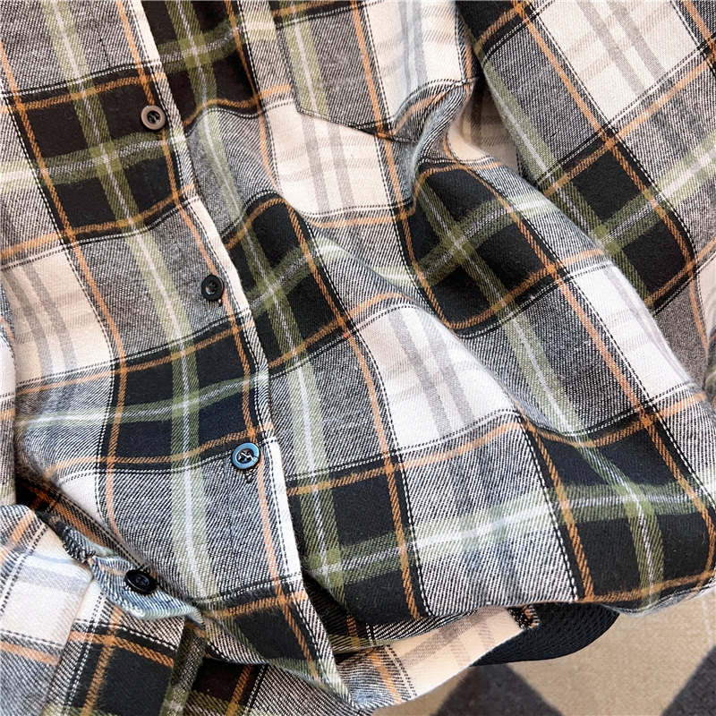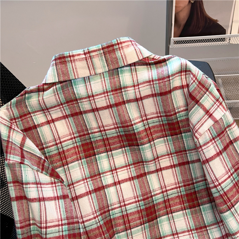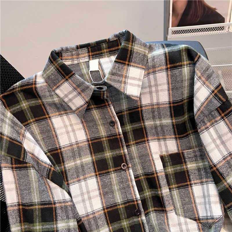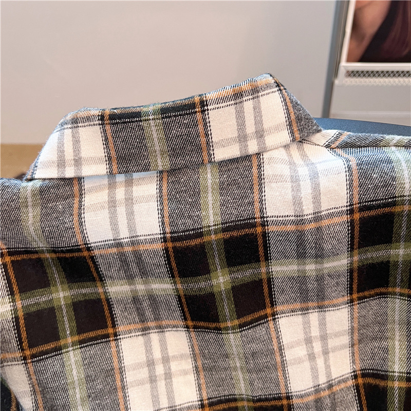 实拍~美式复古撞色格子长袖衬衫女春秋宽松学院风洋气百搭衬衣潮