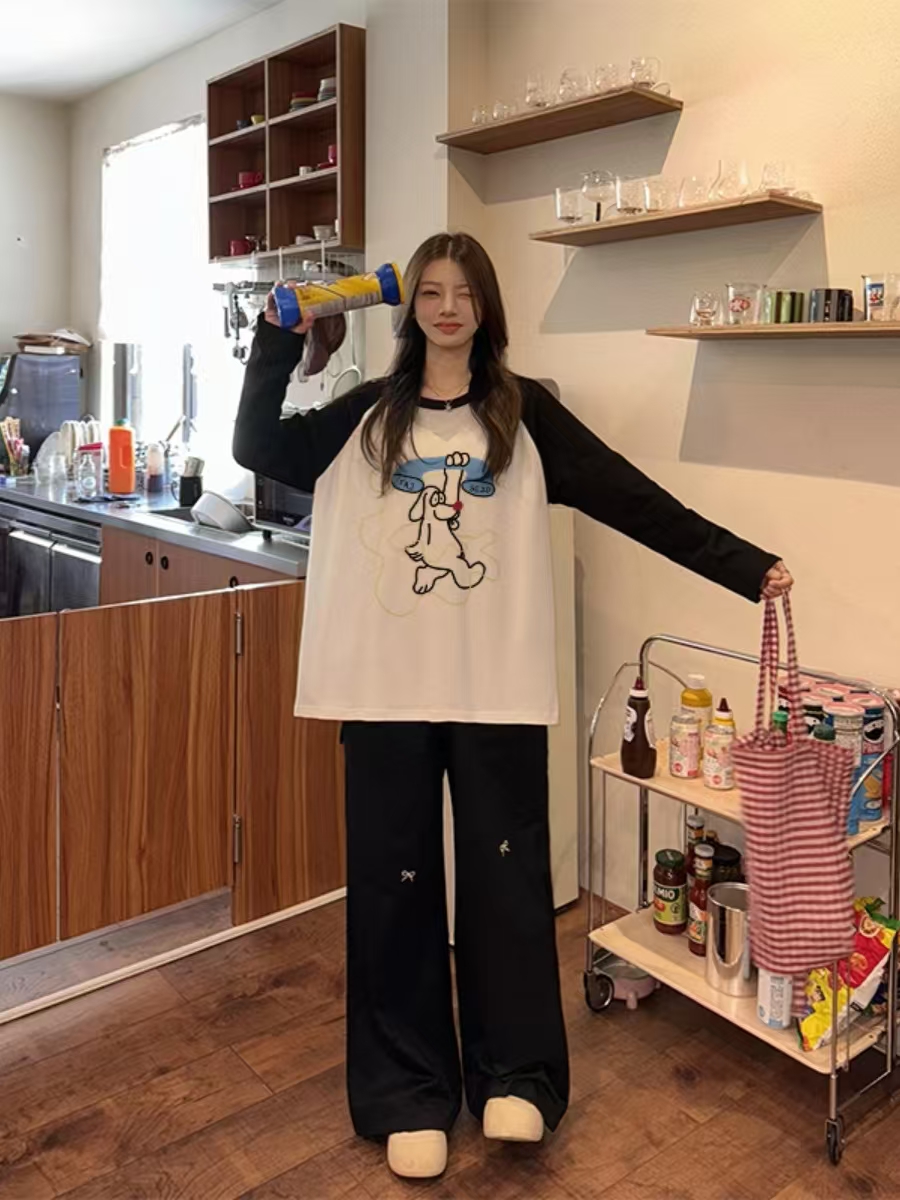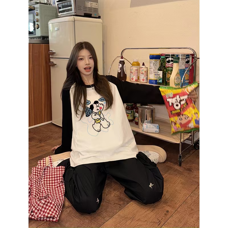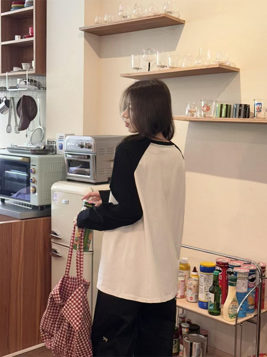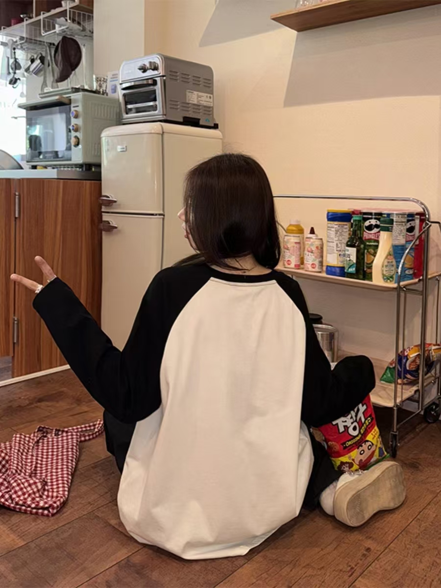 美式复古可爱印花长袖T恤女潮流宽松独特时尚撞色插肩袖上衣