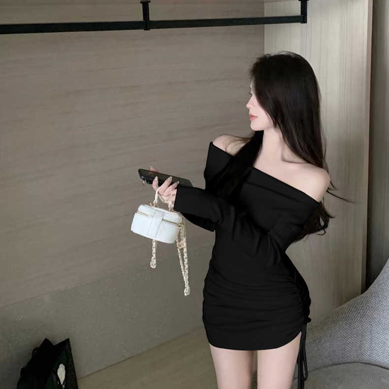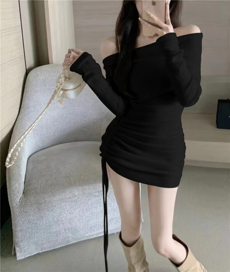 纯欲辣妹一字露肩长袖针织连衣裙女春秋性感修身紧抽绳包臀短裙子