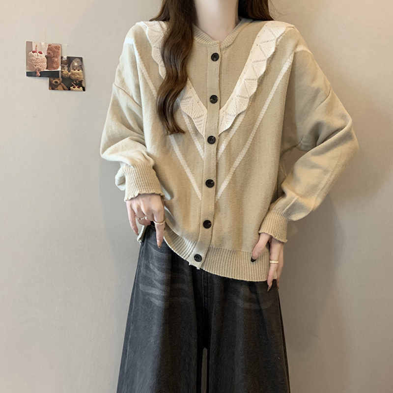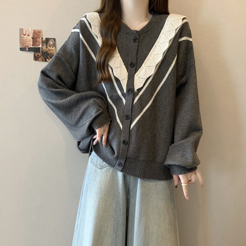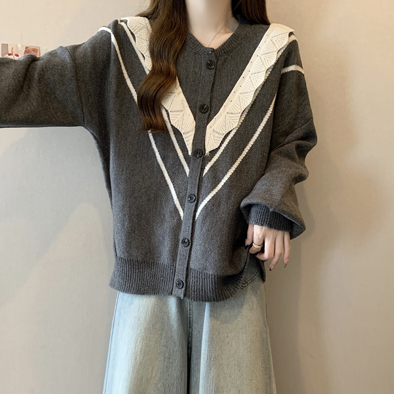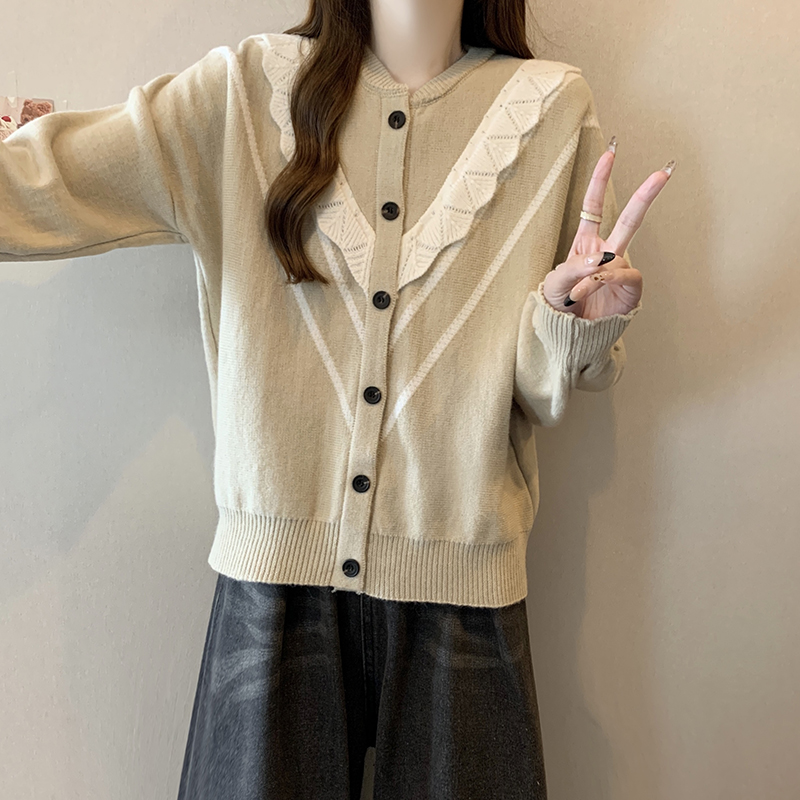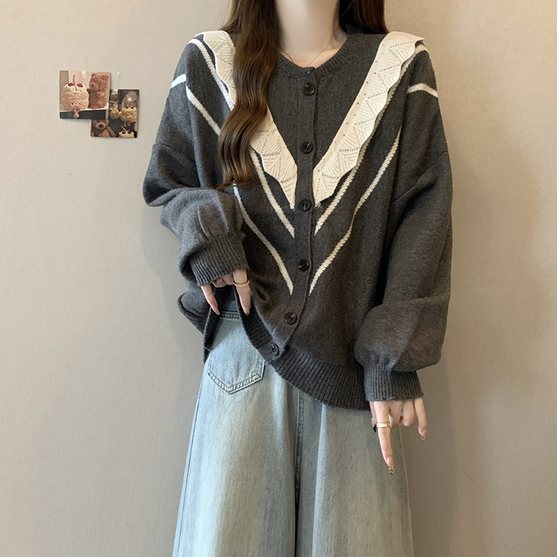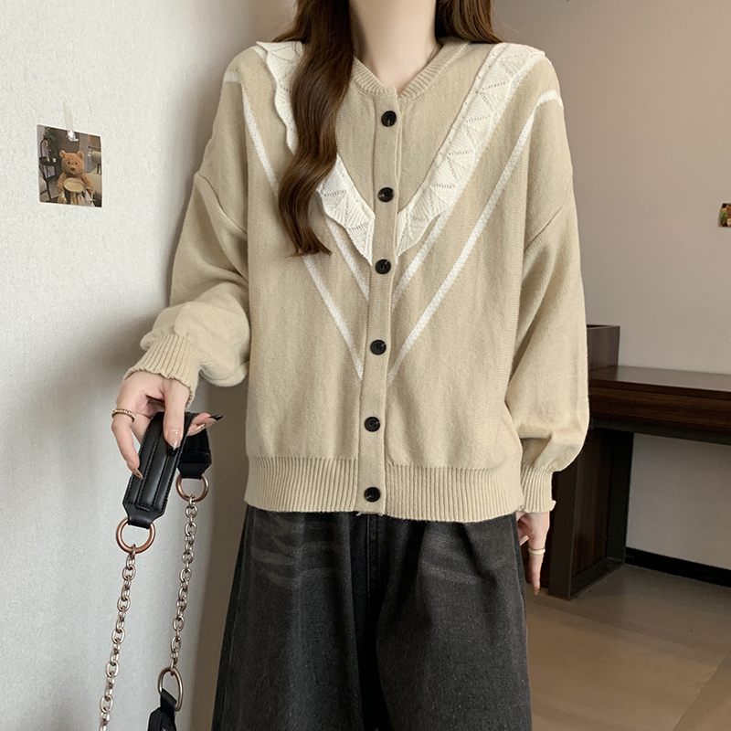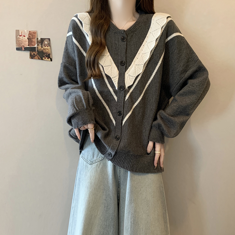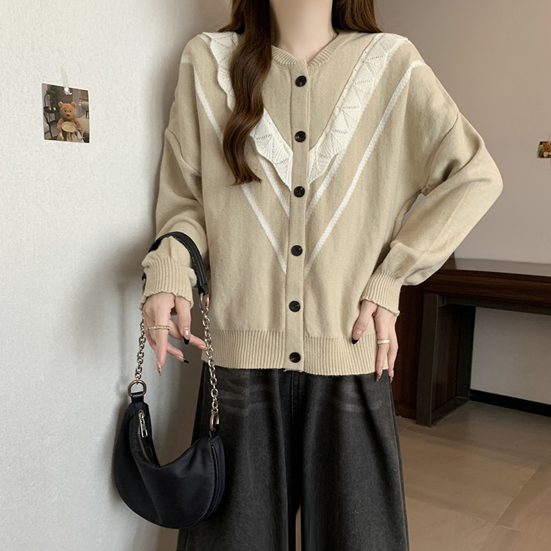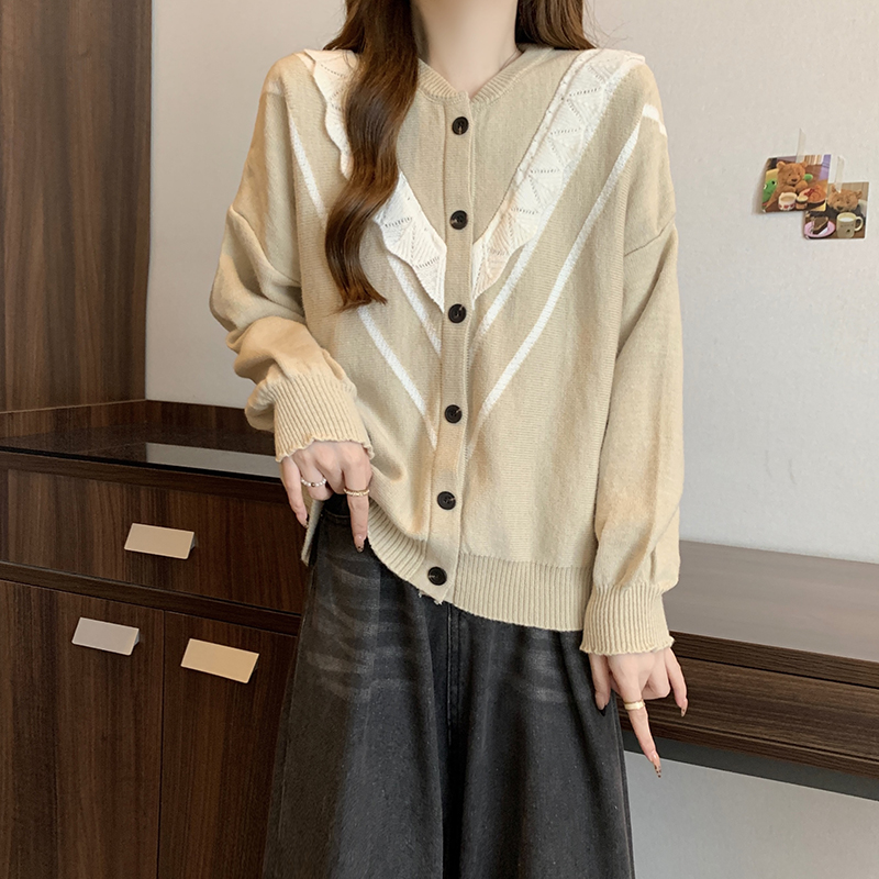 实拍女装2024新款韩版慵懒毛衣拼接木耳边宽松ins风针织开衫