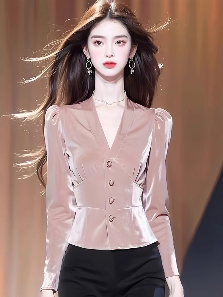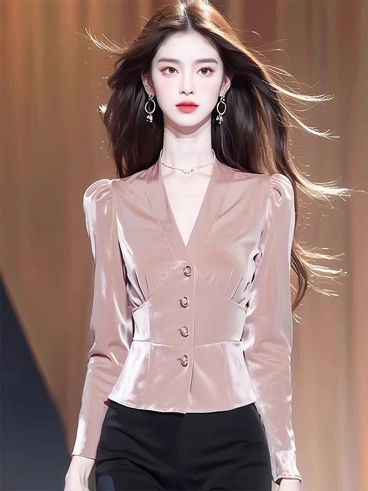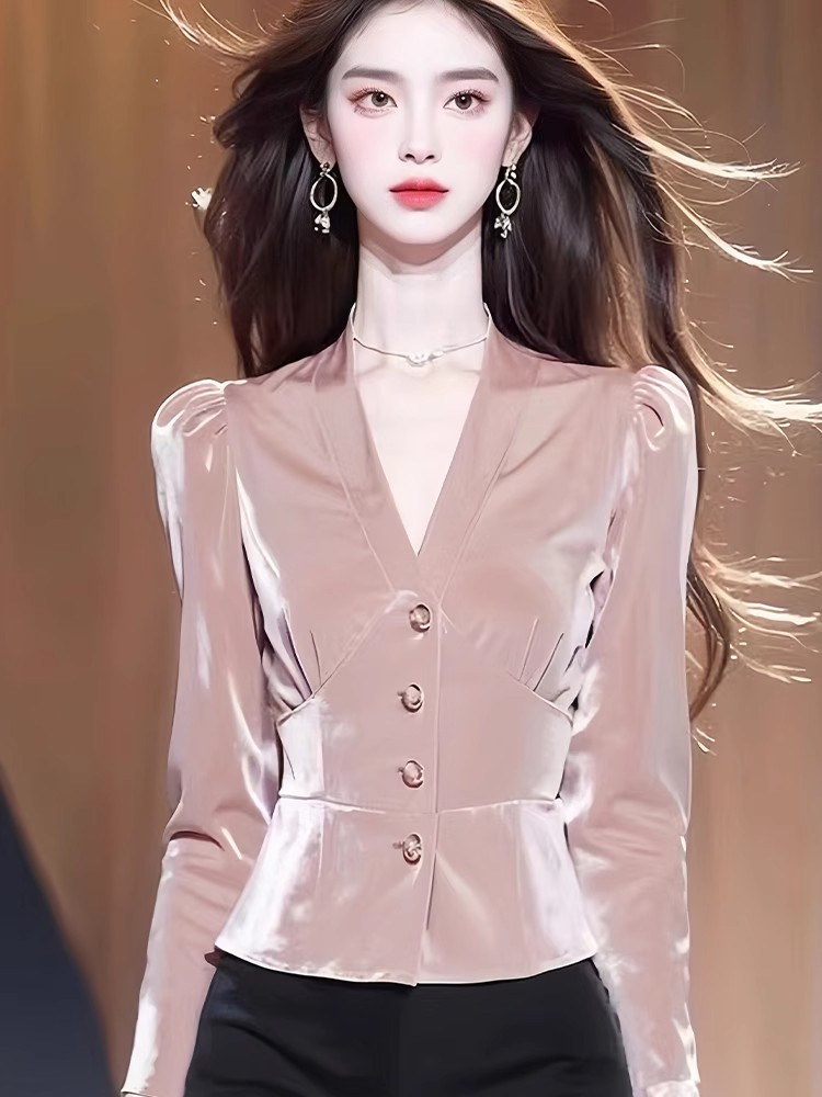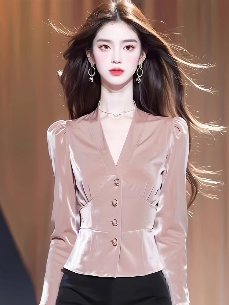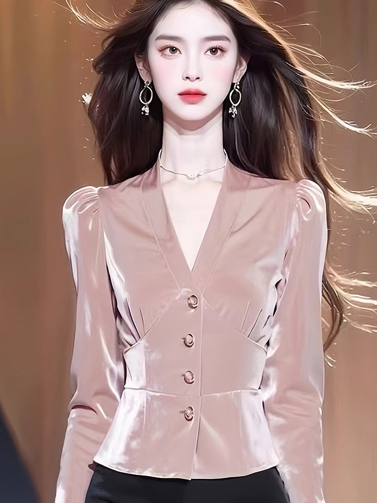 Pink velvet long-sleeved shirt autumn women's 2024 new waist-length shirt popular high-end early autumn tops