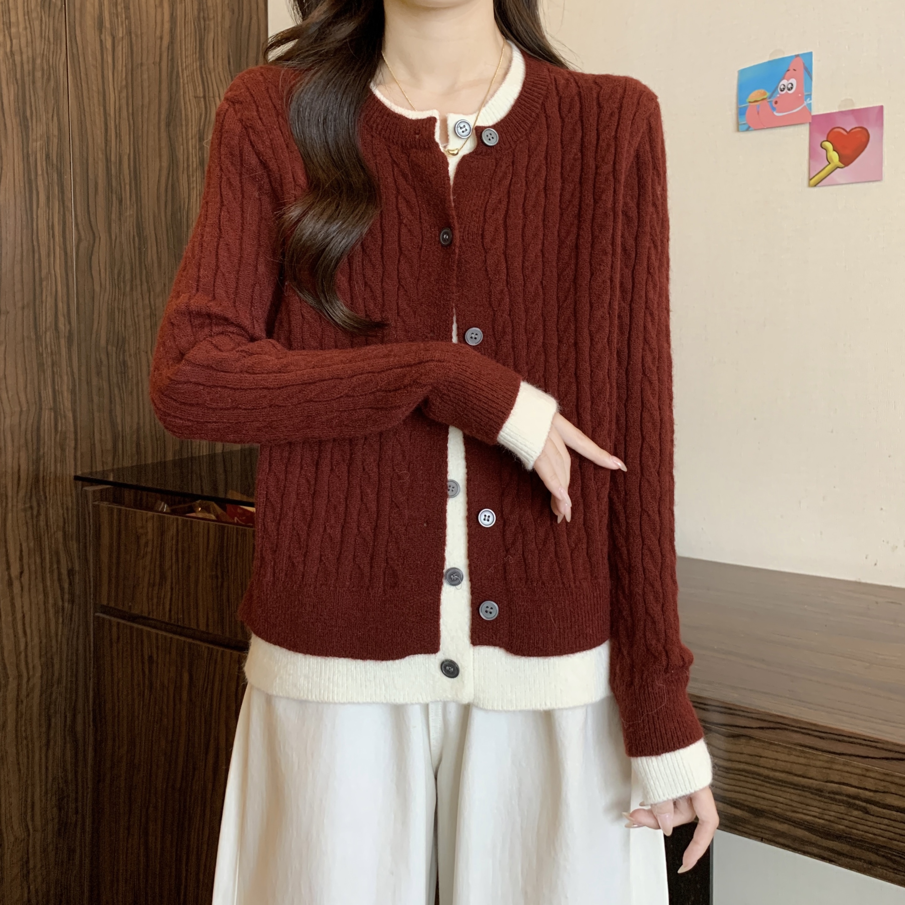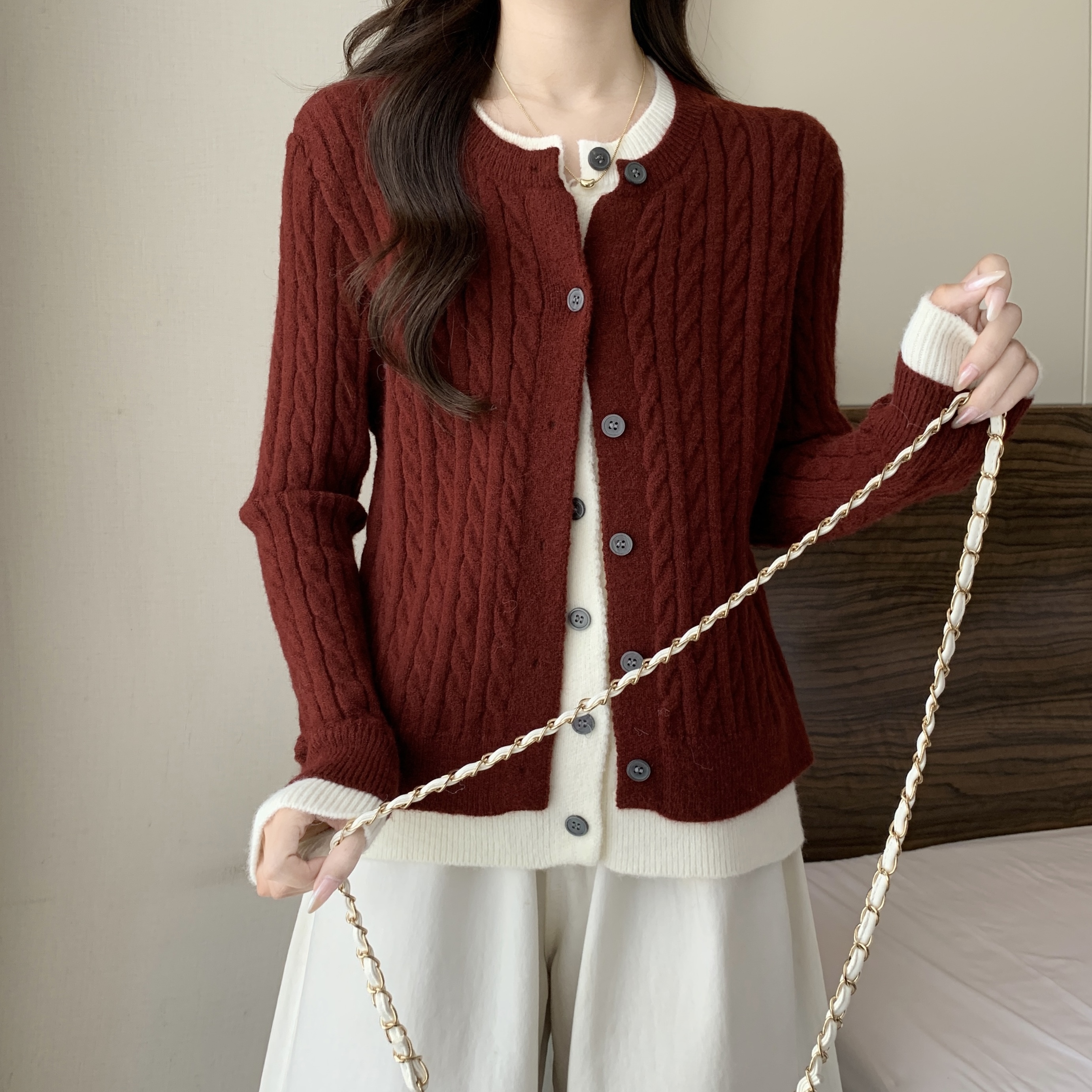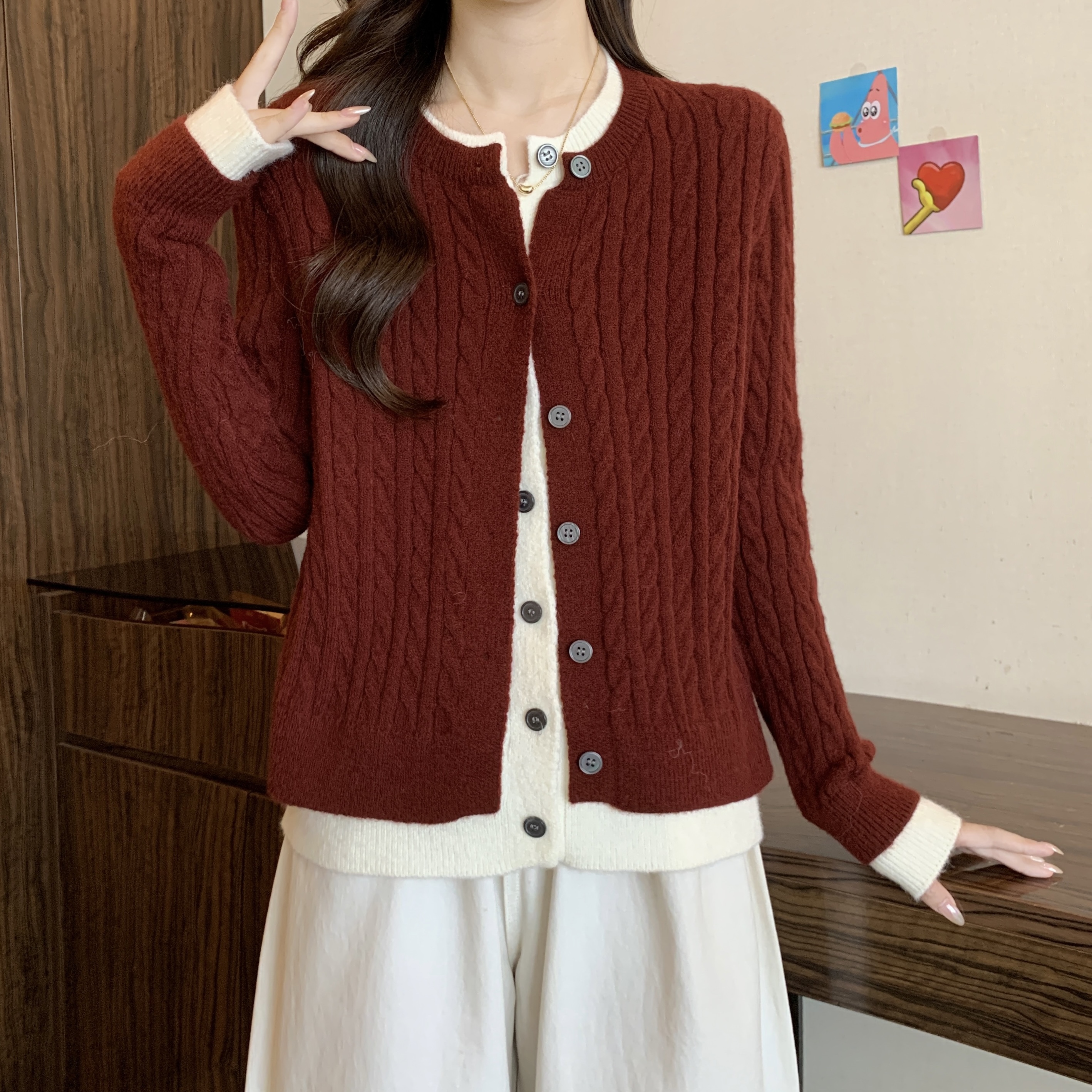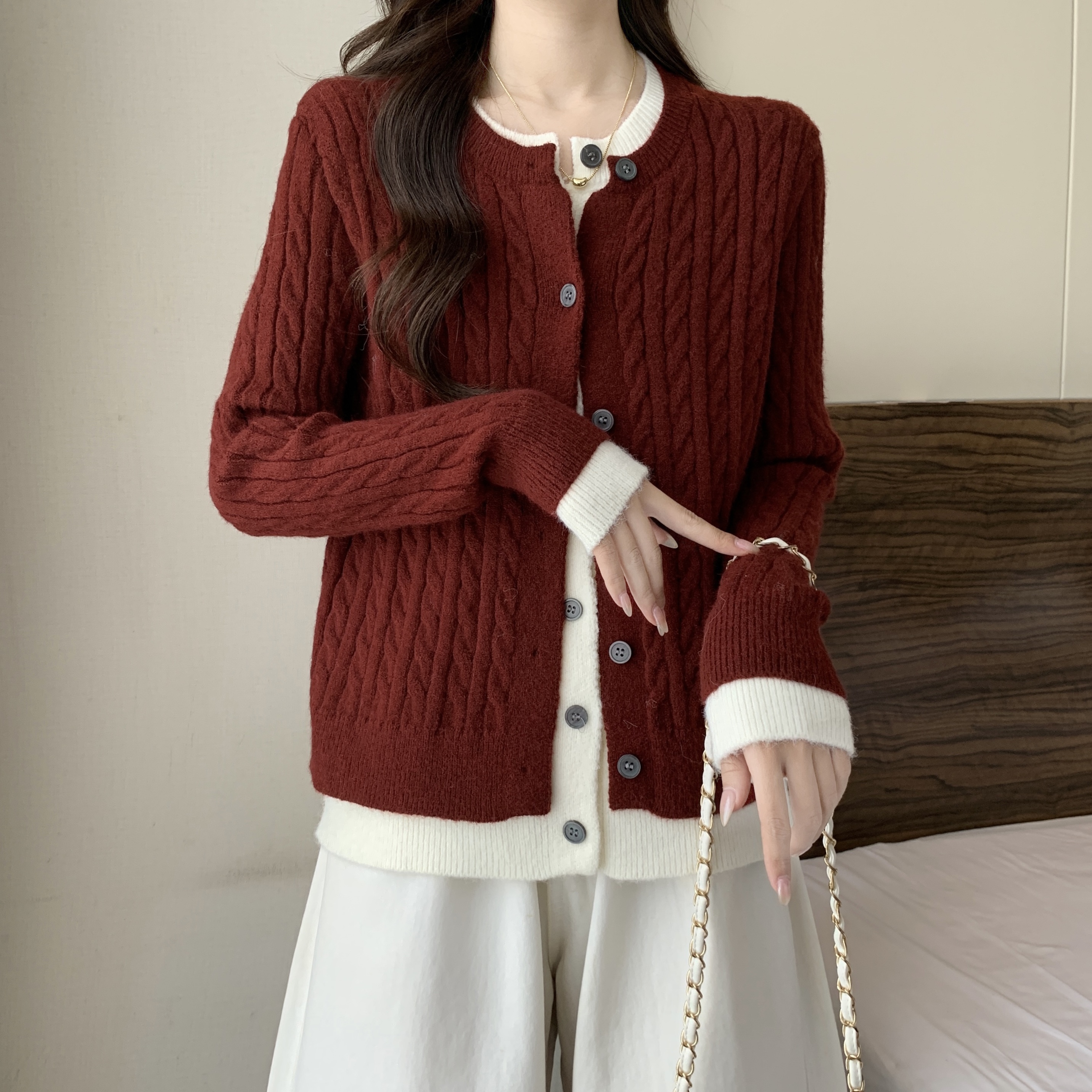 大码女装2024秋冬新款拼接假两件毛衣针织开衫安可拉红外套女