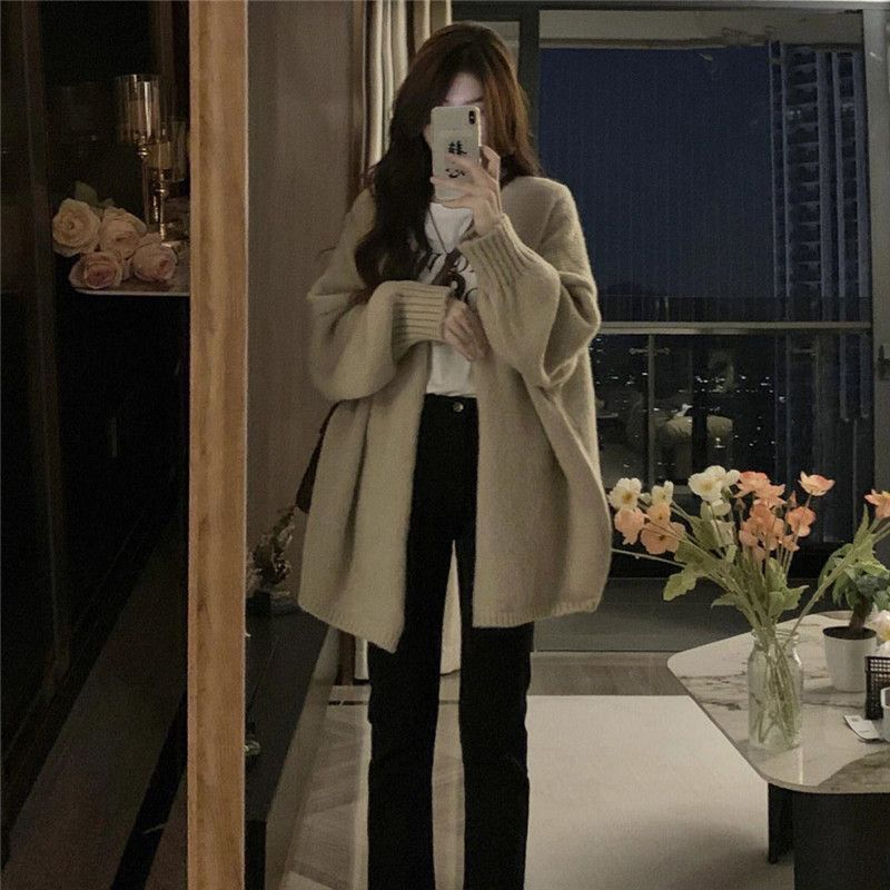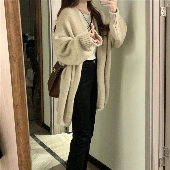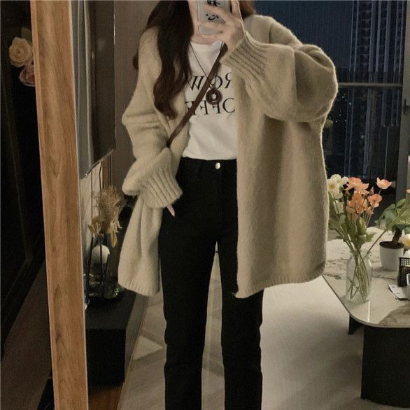 韩国chic简约懒惰风温柔开衫宽松毛衣外穿加厚针织外套大板型毛衣