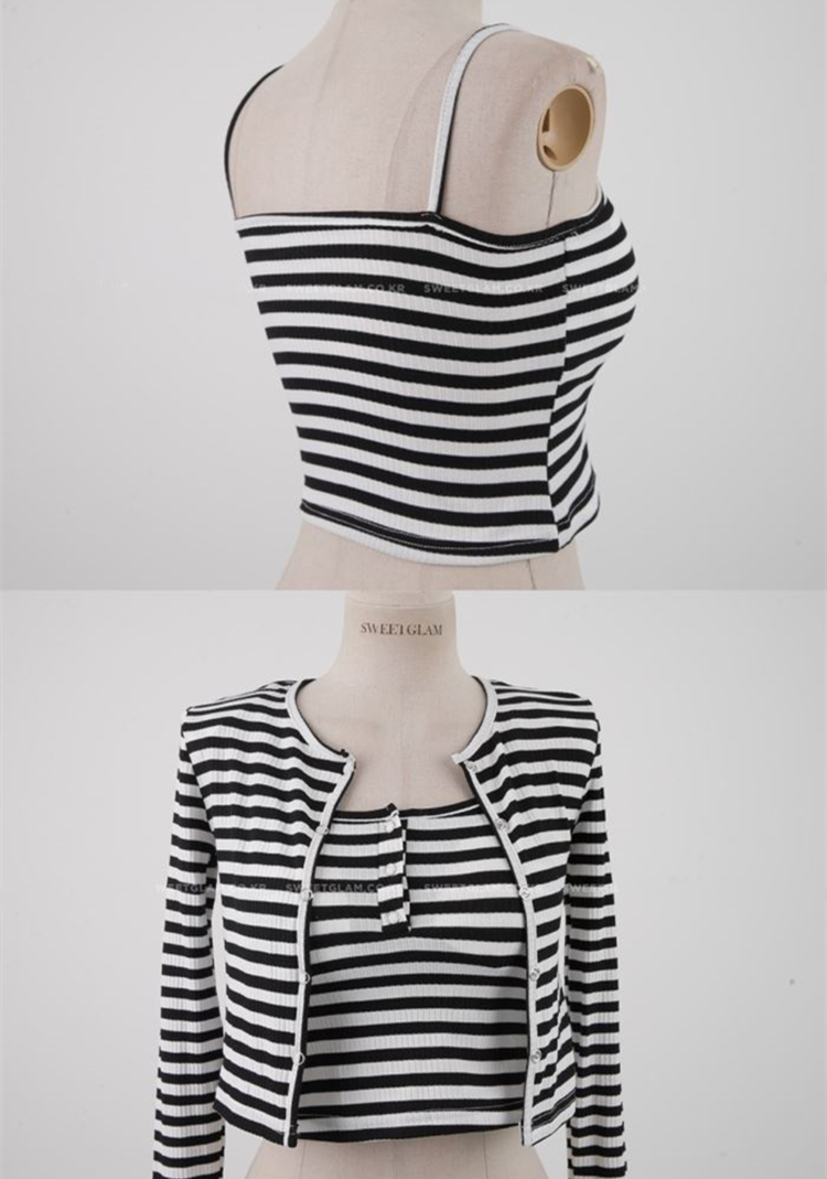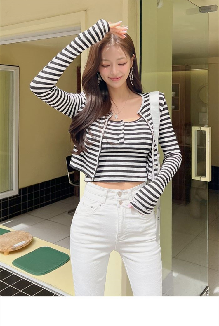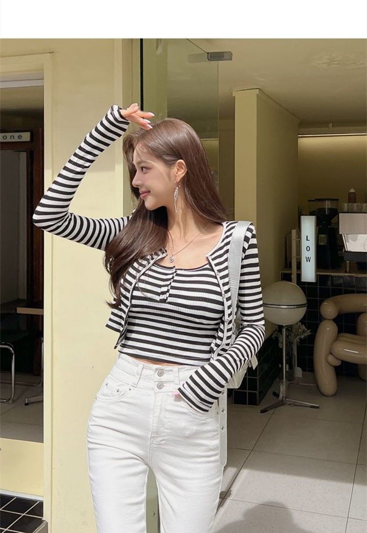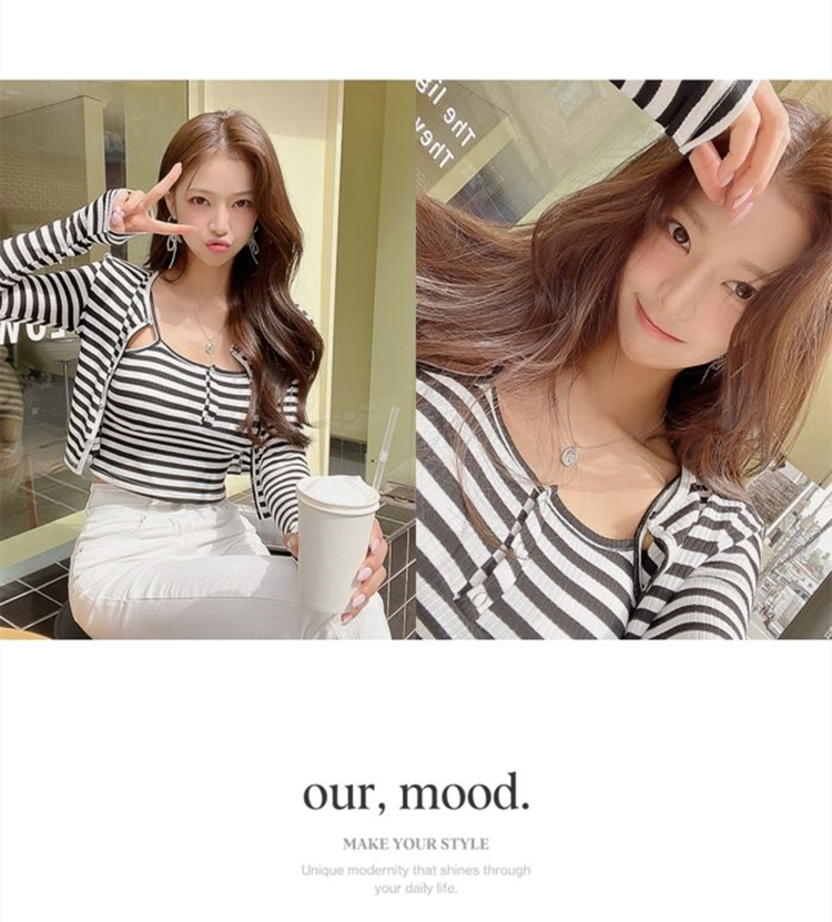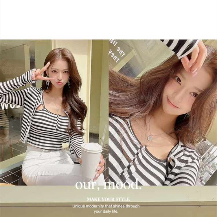 South Korea Dongdaemun new temperament high waist slim striped camisole long sleeve sunscreen cardigan two-piece suit for women