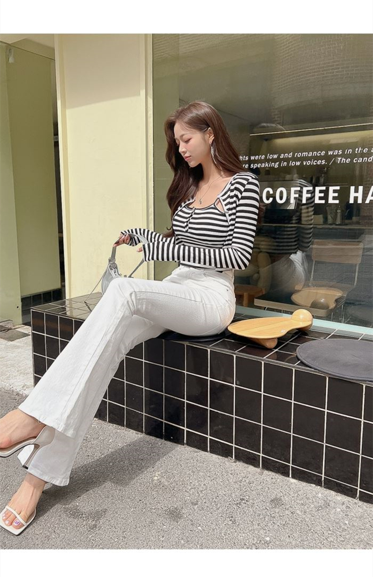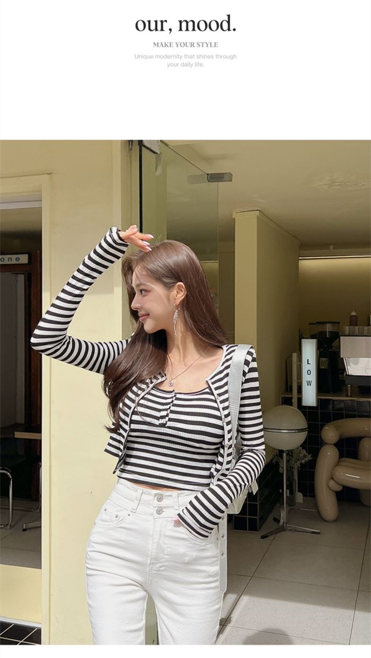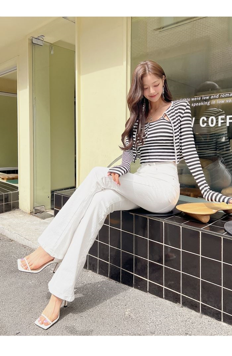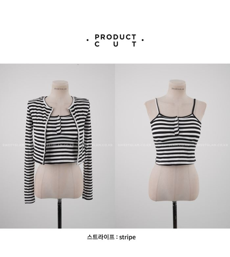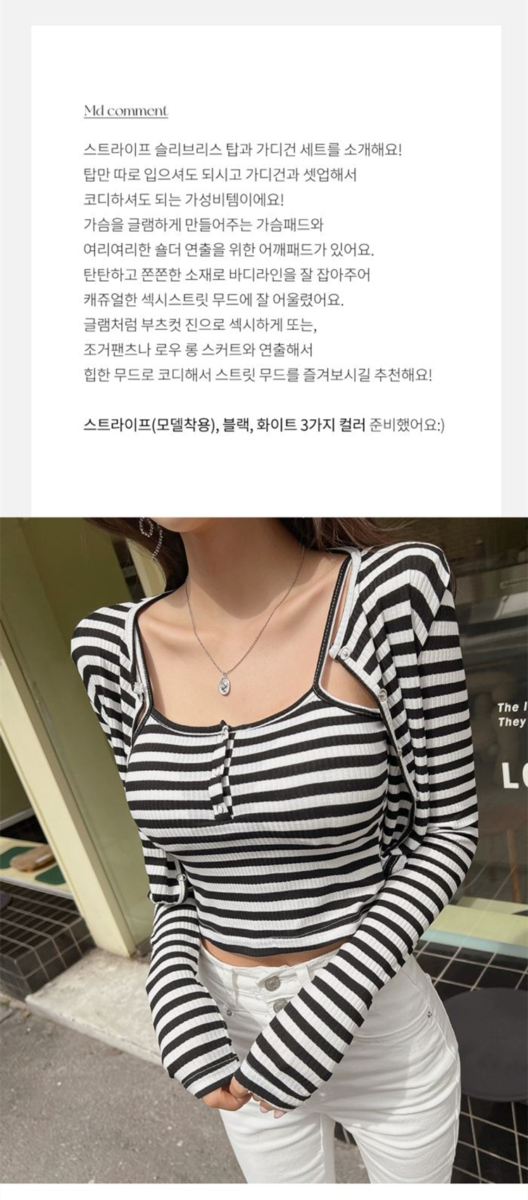 South Korea Dongdaemun new temperament high waist slim striped camisole long sleeve sunscreen cardigan two-piece suit for women