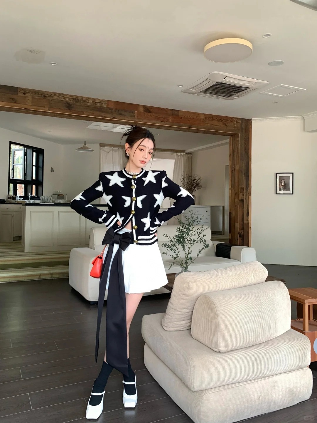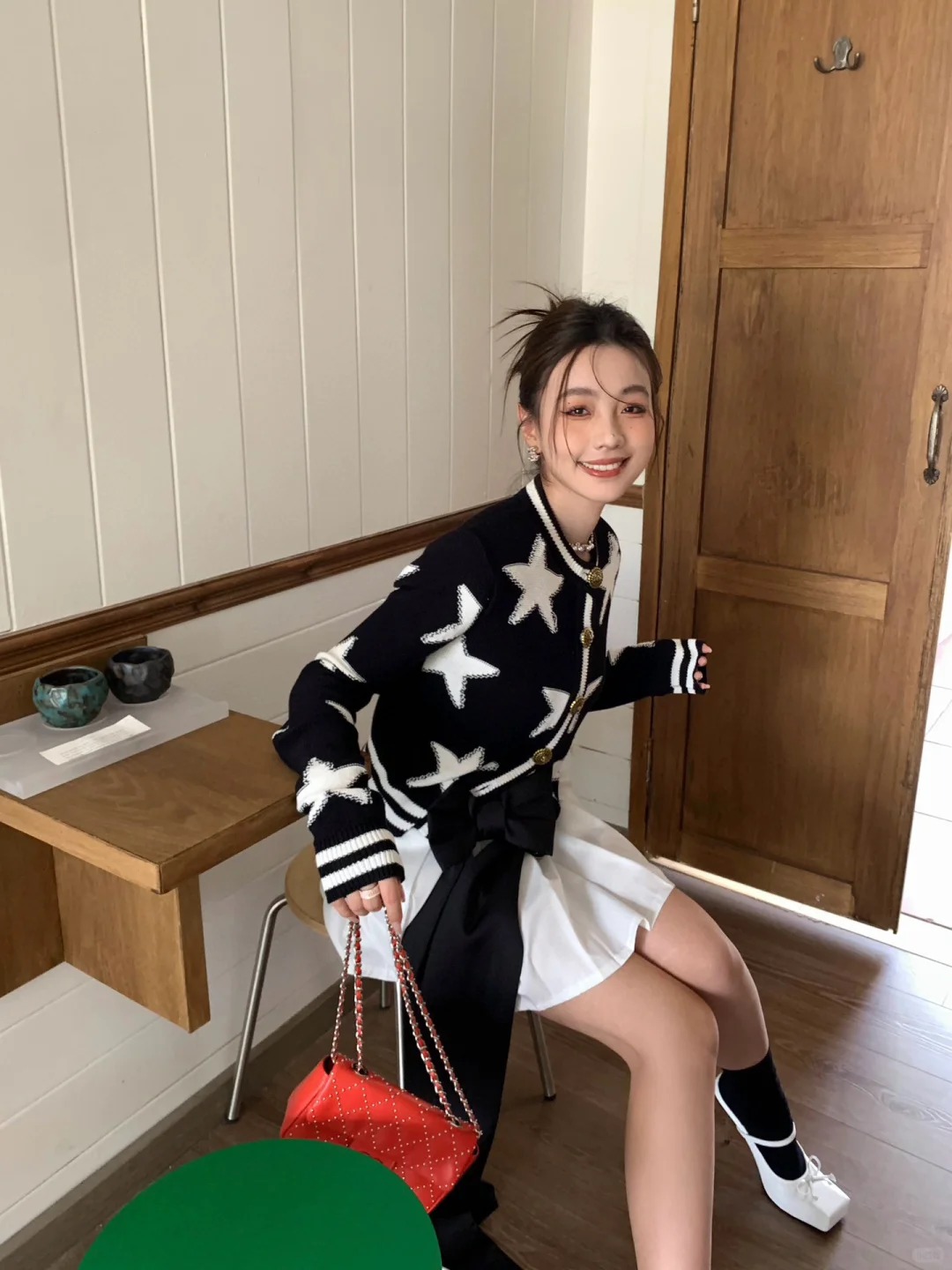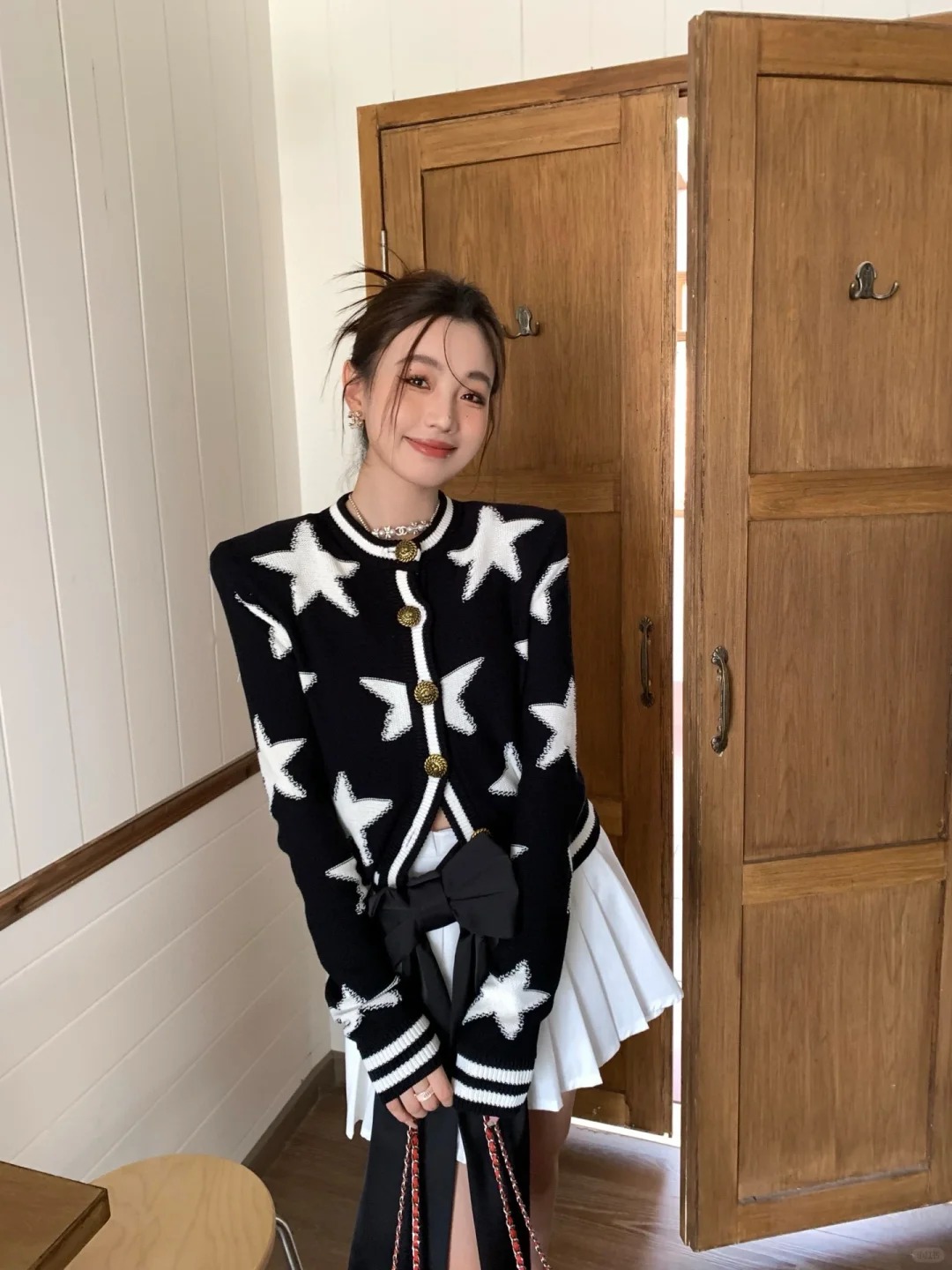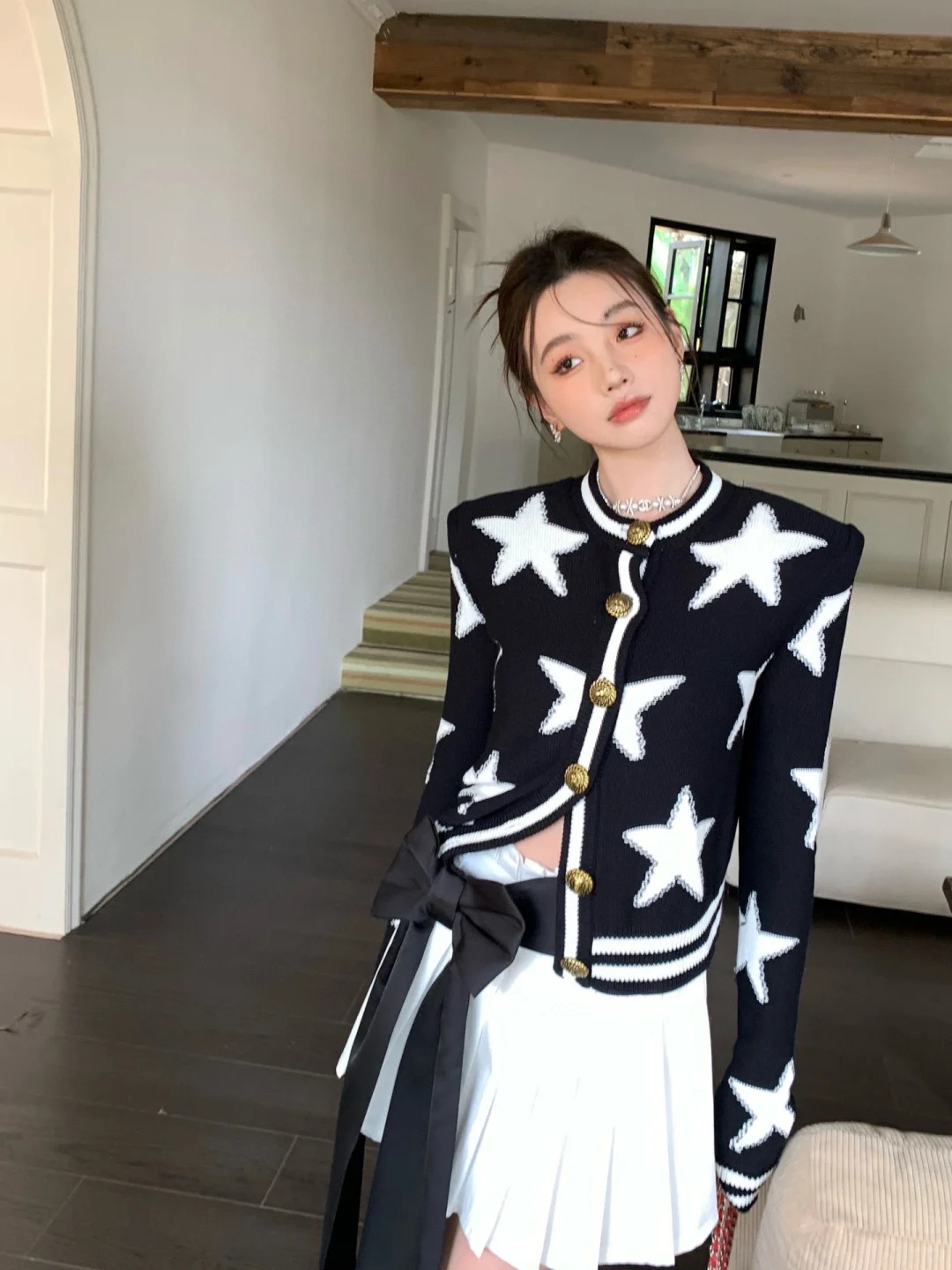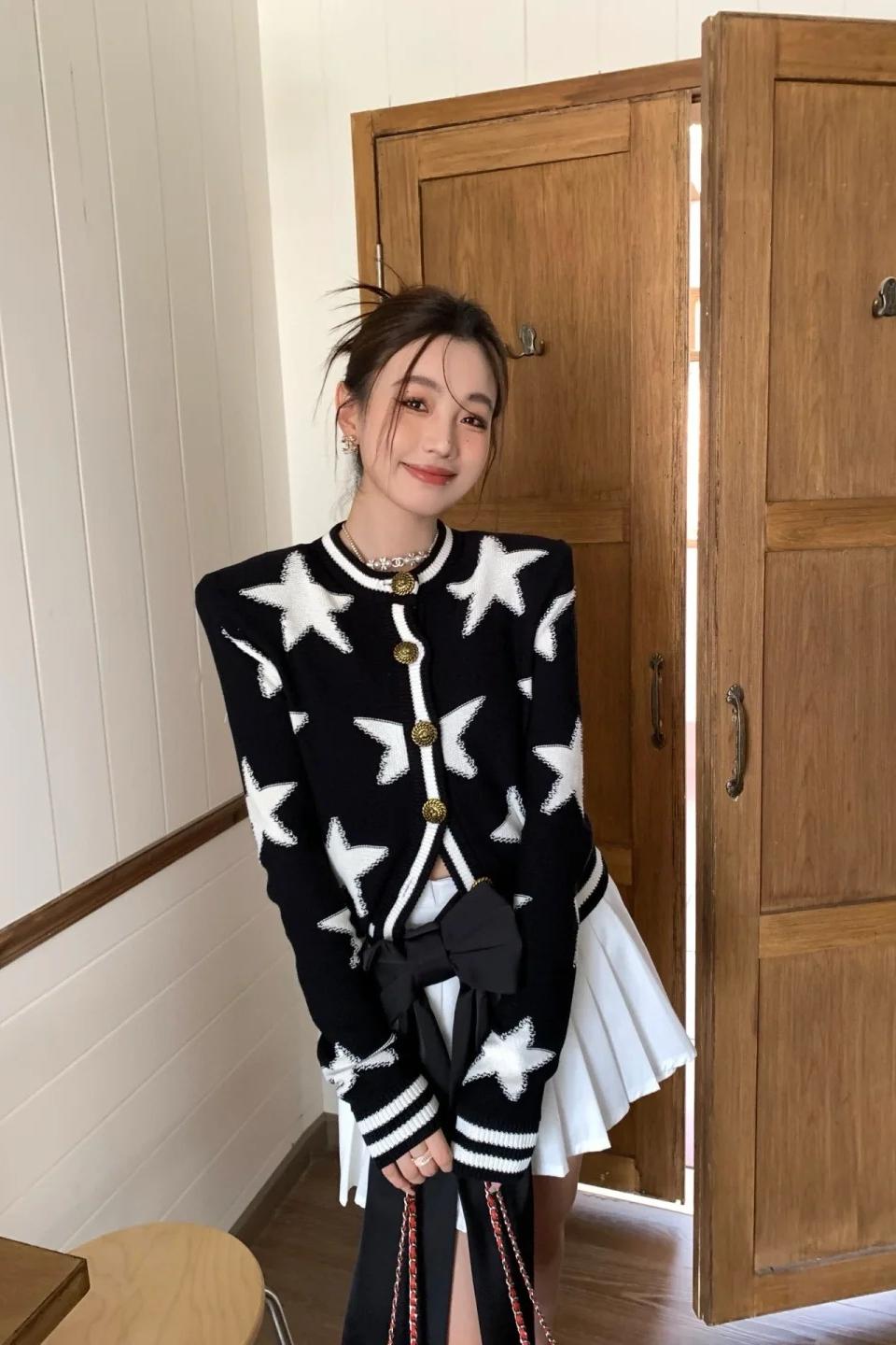 新款网红抖音龍喜儿戚薇同款32支天Si棉混纺星星毛织开衫外套QN