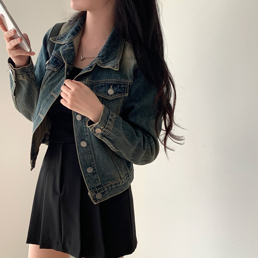 高级洗水颜色+垫肩宽松短款牛仔外套