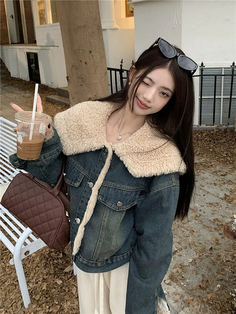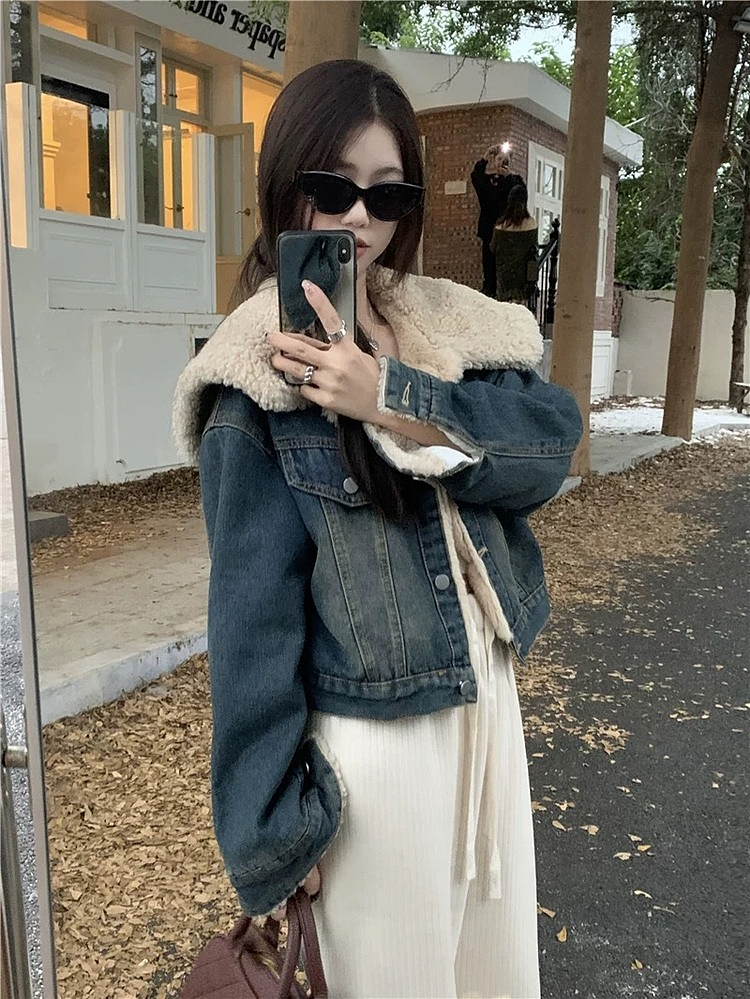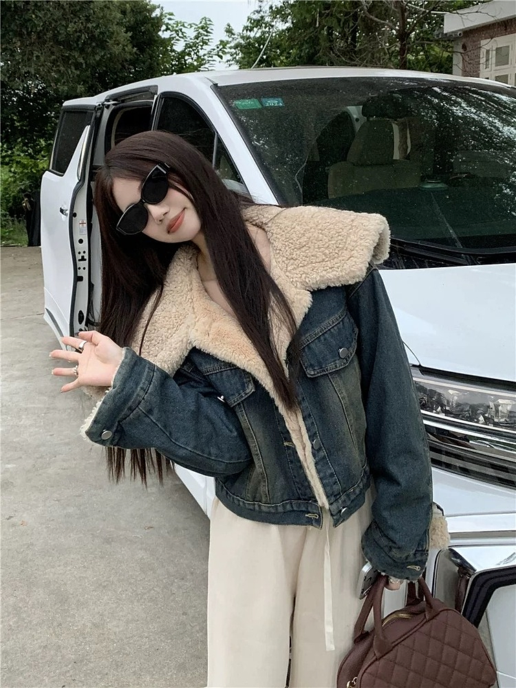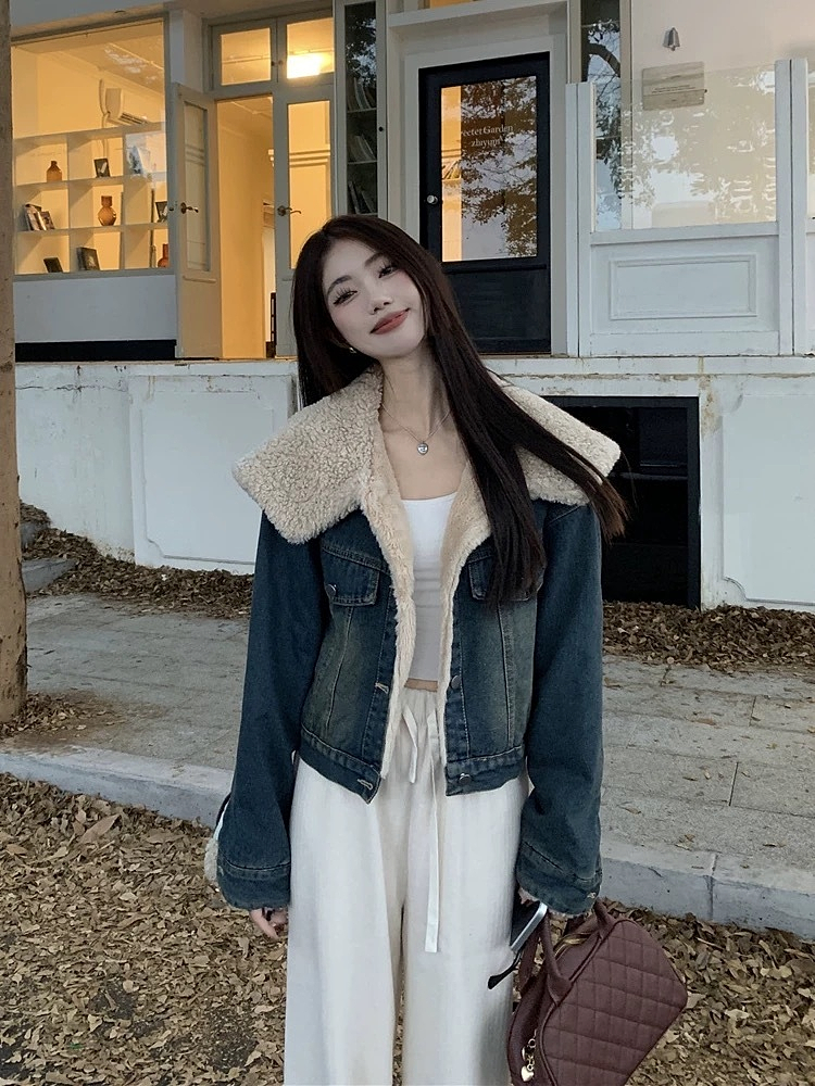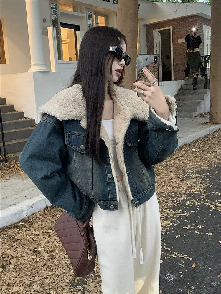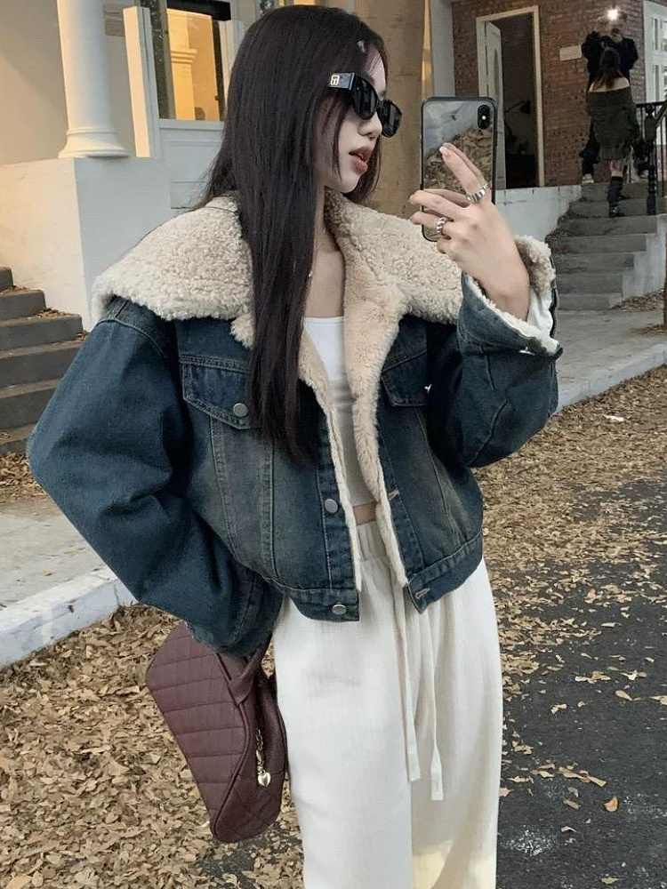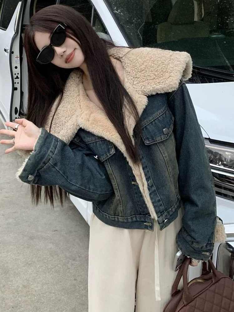 2024秋冬季新款加绒加厚牛仔外套女宽松设计感百搭大翻领短款上衣