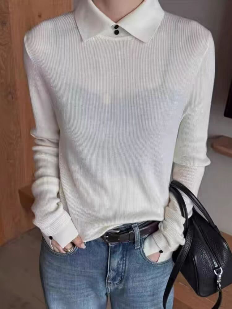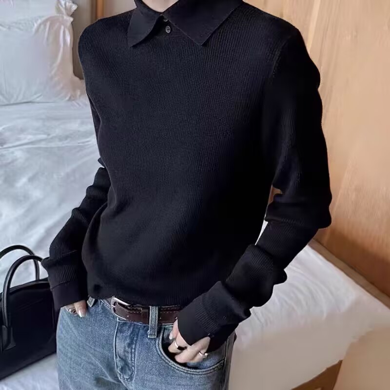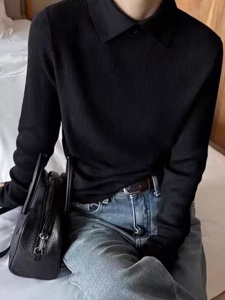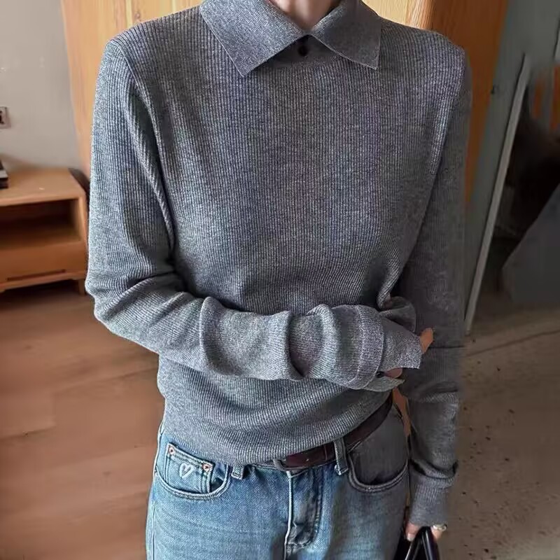 2024年秋冬新款设计感小众羊毛针织衫女小翻领纯色修身打底衫上衣